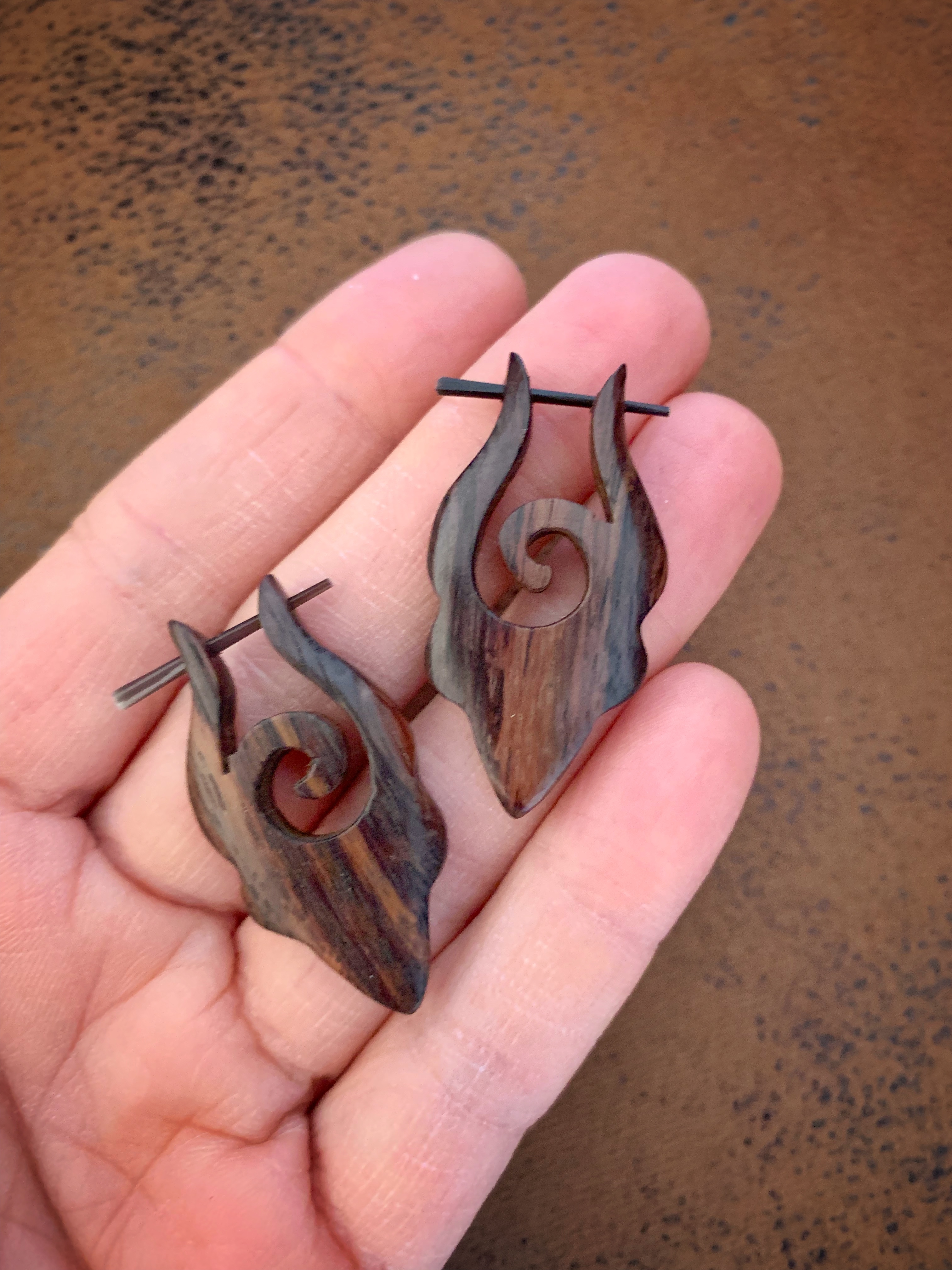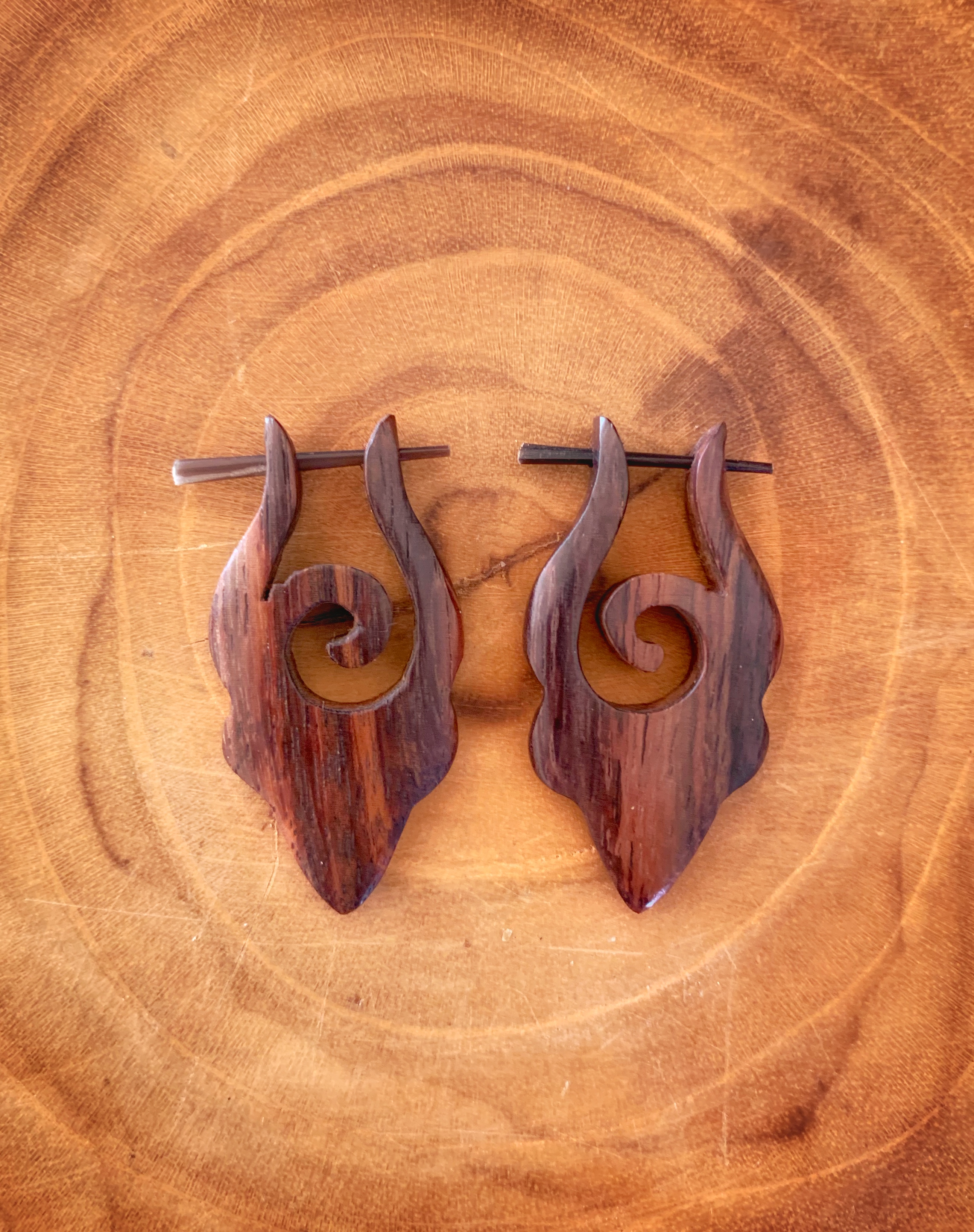 Náušnice z lehkého tropického dřeva s originálním designem a zapínáním na tyčku z pružné a hypoalergenní rohoviny. Vhodné pro klasickou dírku v uchu.