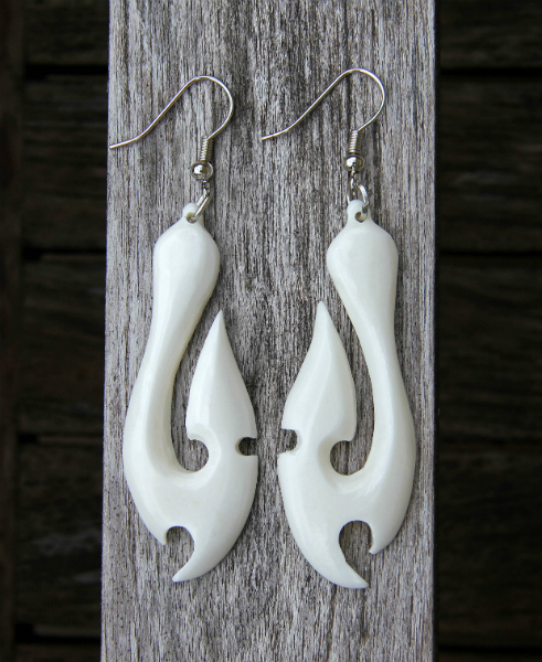 Kostěné náušnice se symbolickým designem. Zapínání na bižuterní háček. Délka náušnice i s háčkem: 7 cm, délka náušnice 5,5 cm.