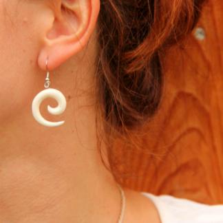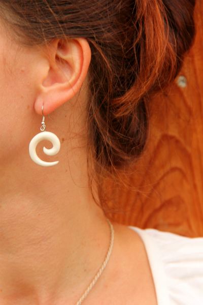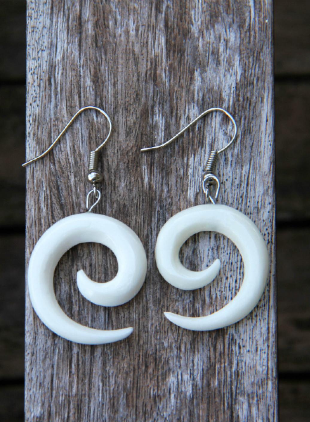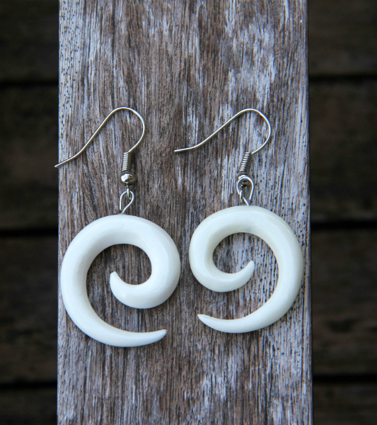 Kostěné náušnice s designem spirály. Zapínání na bižuterní háček. Délka náušnice i s háčkem: 4 cm, délka náušnice 2,5 cm.