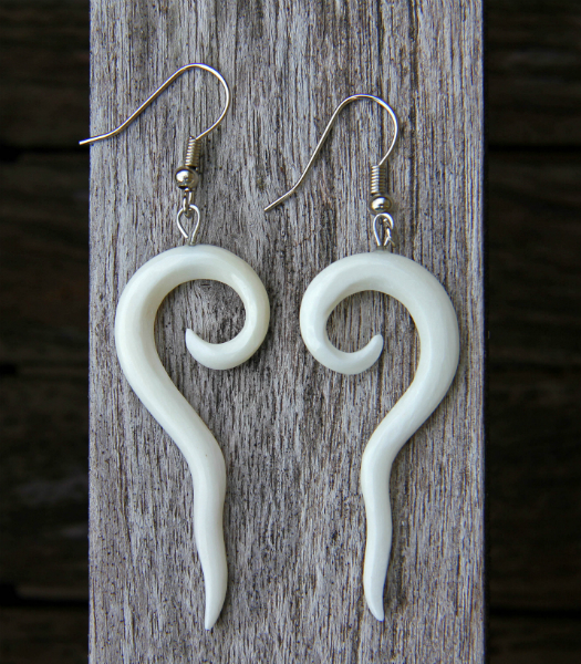 Kostěné náušnice se symbolickým designem. Zapínání na bižuterní háček. Délka náušnice i s háčkem: 6 cm, délka náušnice 4,5 cm.