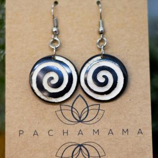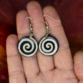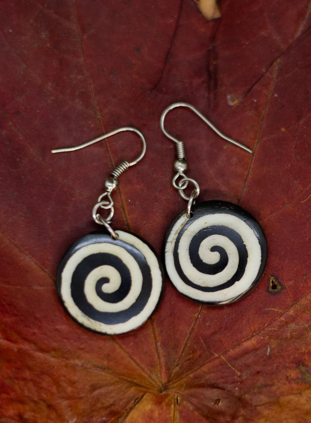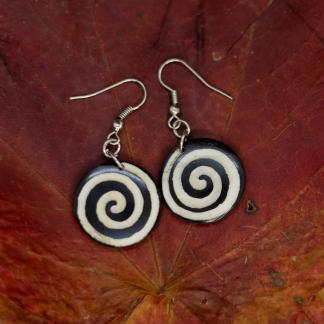 Kostěné náušnice s designem čenobílé spirály. Zapínání na bižuterní háček. Délka náušnice i s háčkem: 3,5 cm, průměr náušnice 2 cm.