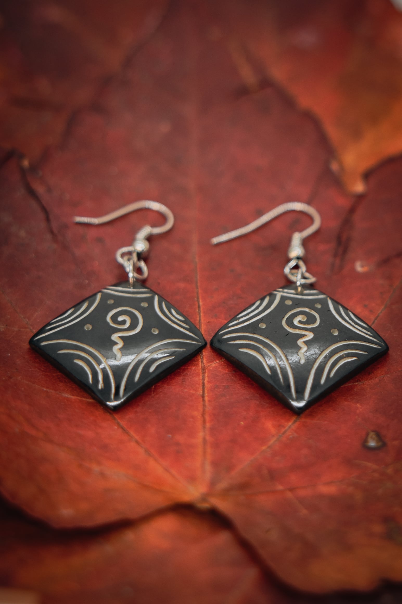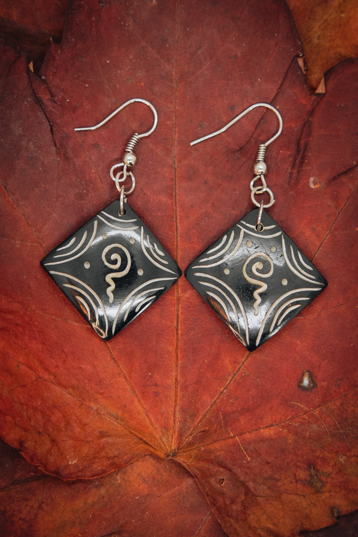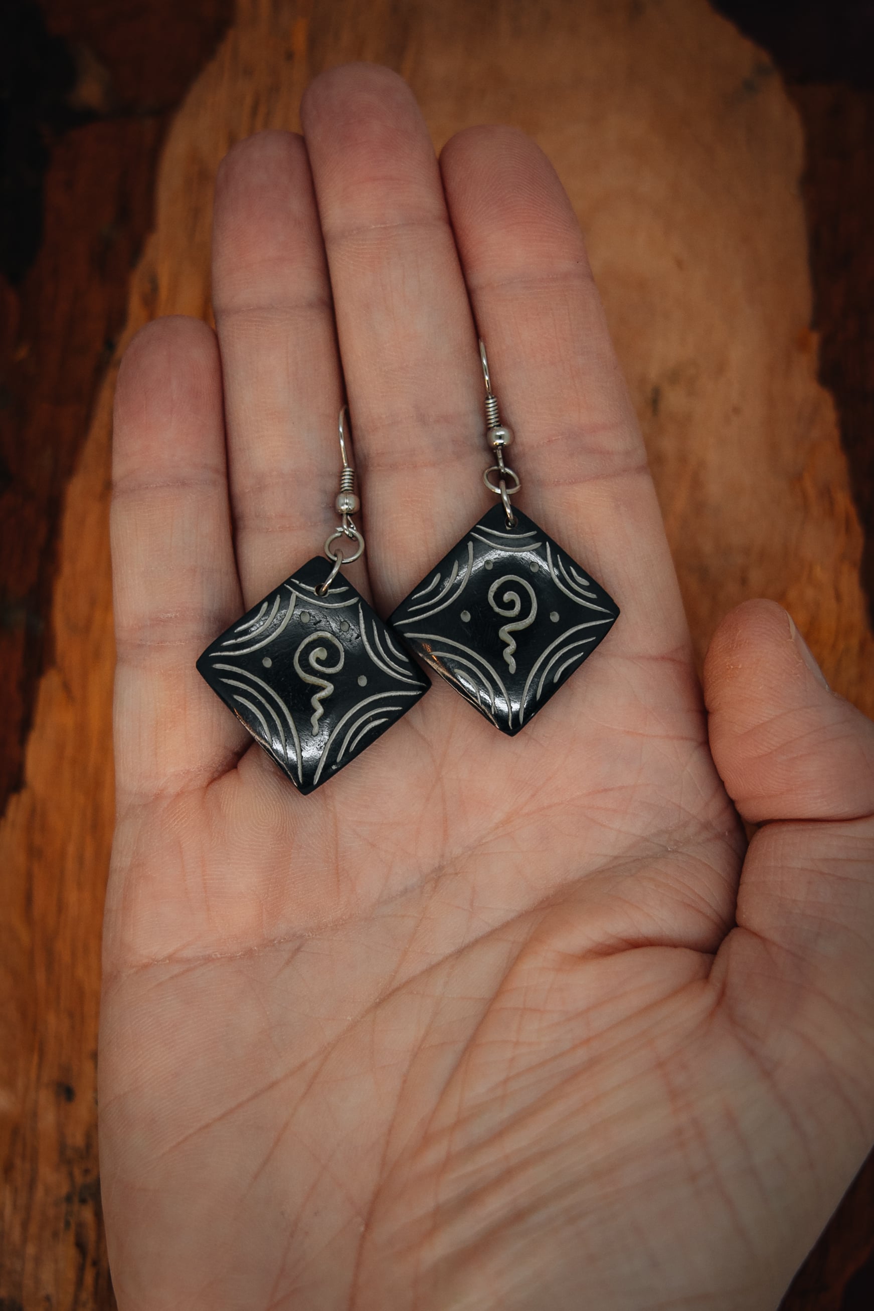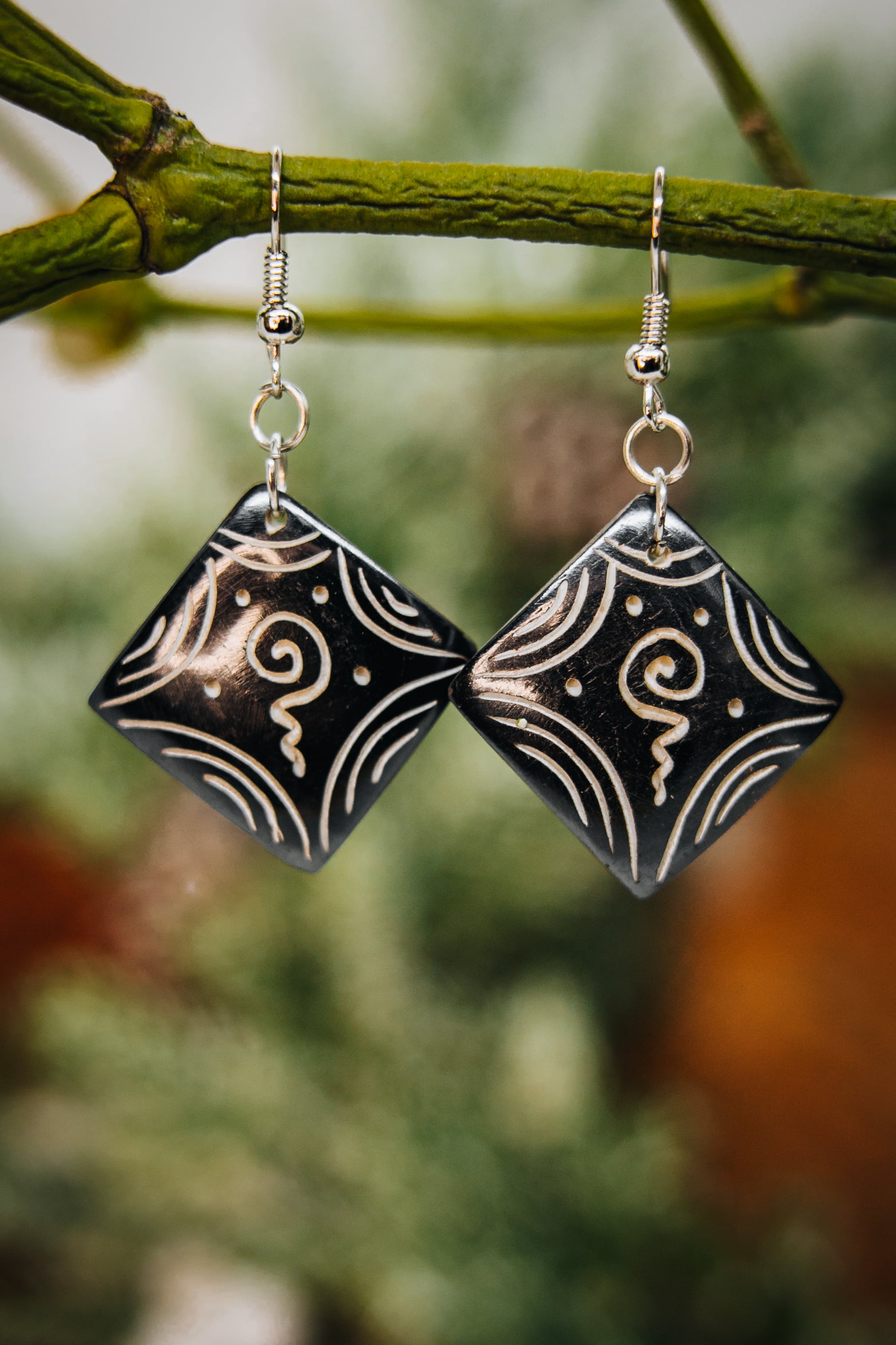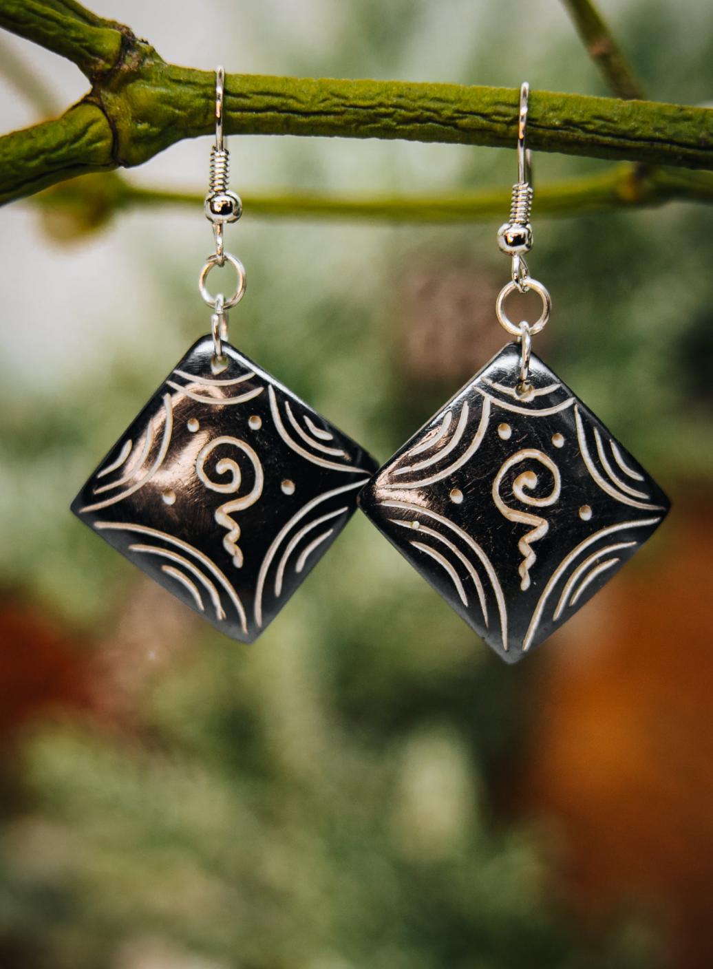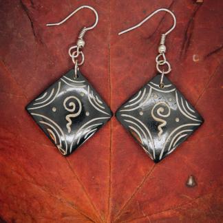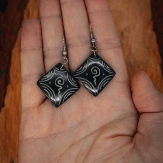 Kostěné náušnice s designem čenobílých spirál. Zapínání na bižuterní háček. Délka náušnice i s háčkem: 4,5 cm, průměr náušnice 2,5 cm.