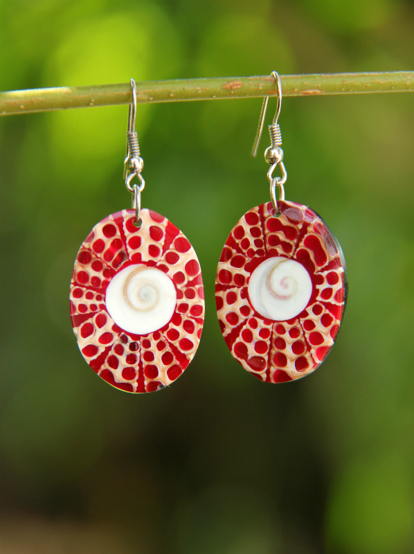 Výrazné červené náušnice z mušloviny a pryskyřice s bižuterním háčkem.