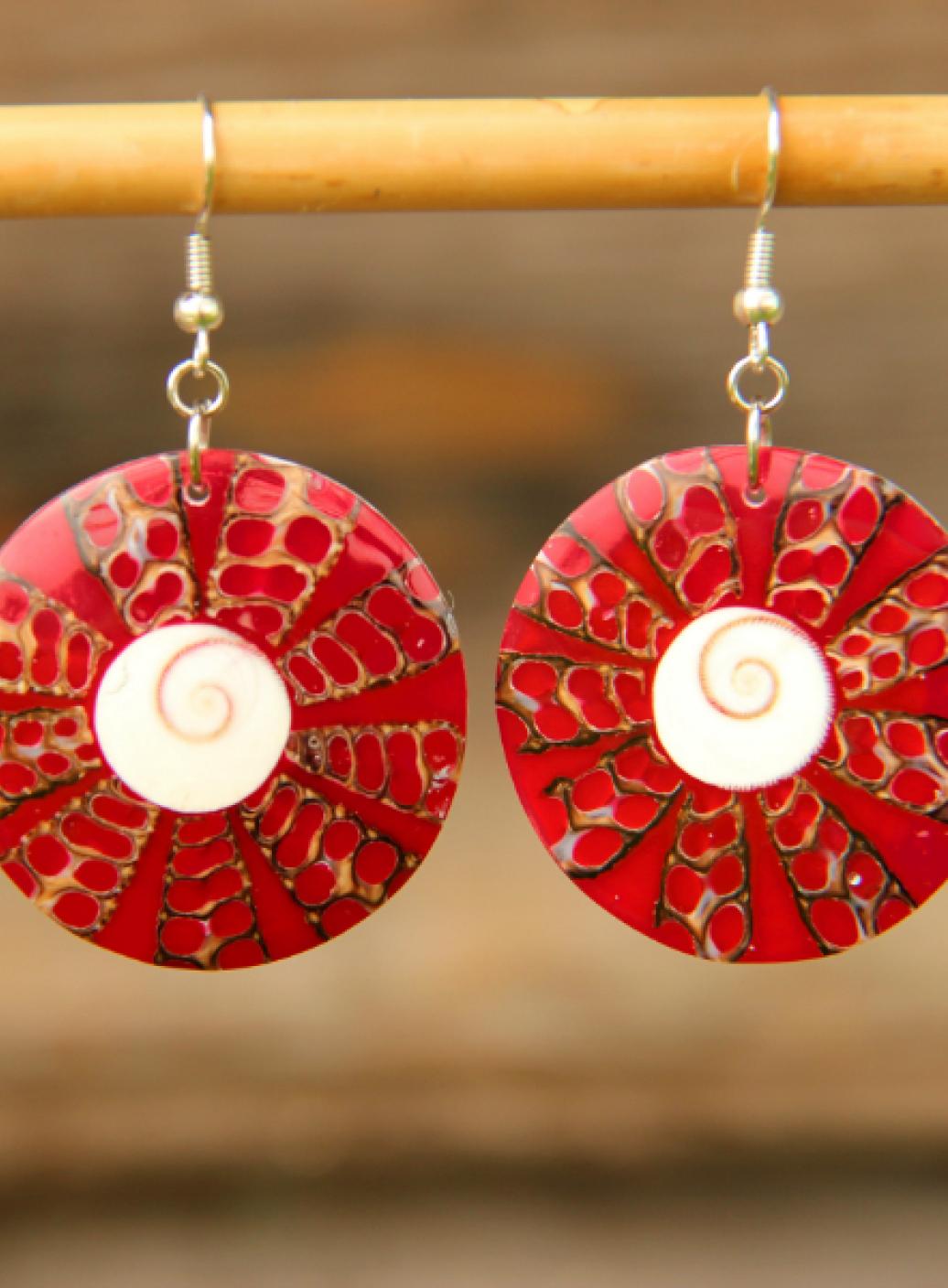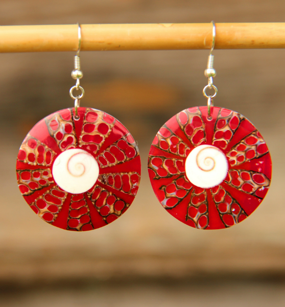 Výrazné červené náušnice z mušloviny a pryskyřice s bižuterním háčkem.