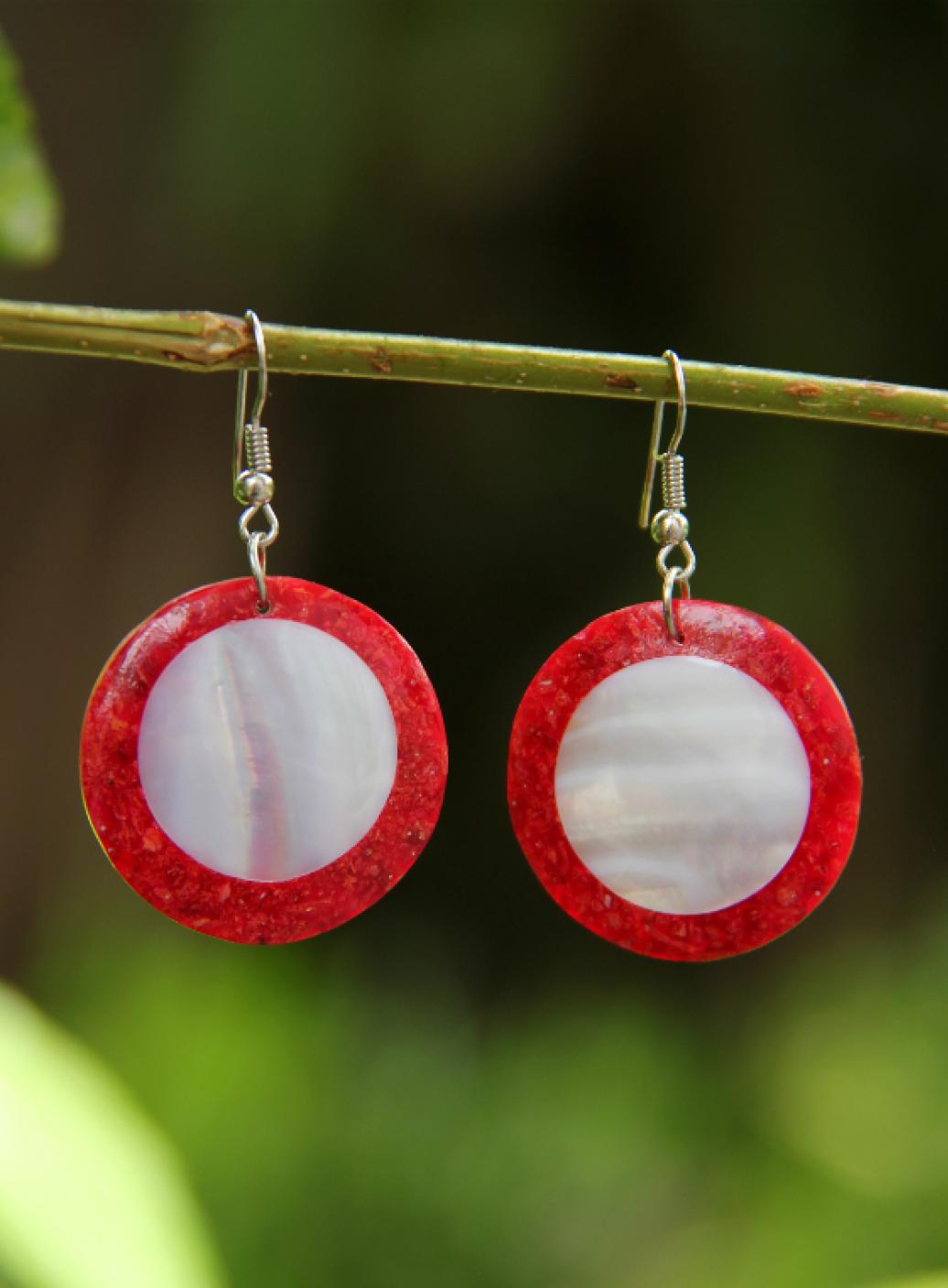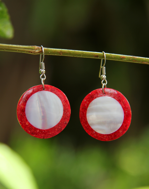 Výrazné náušnice z bílé mušloviny a červeného korálu s bižuterním háčkem.