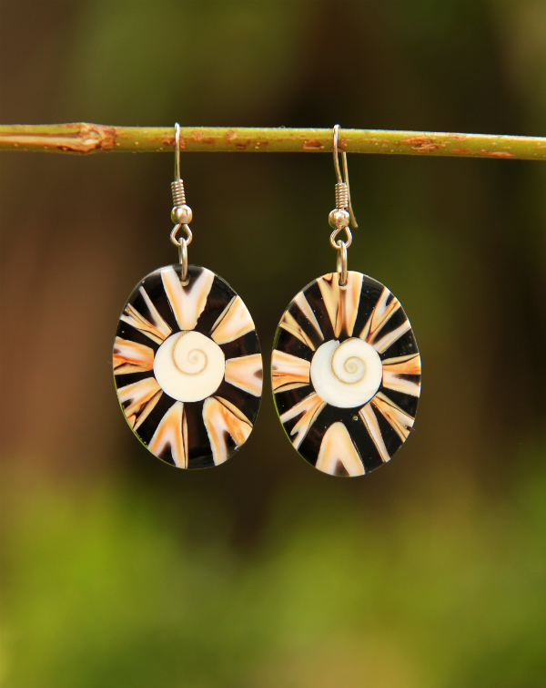 Zajímavé černé oválné náušnice prokládané mušlovinou s bižuterním háčkem.