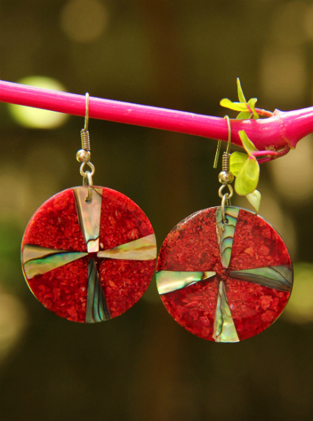 Náušnice z červeného korálu a perleti paua zalité do černé pryskyřice. Ideální letní šperk pro každou ženu.
