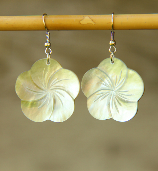 Originální náušnice z bílé perleti s rytým květinovým designem. Háček je z bižuterního kovu.