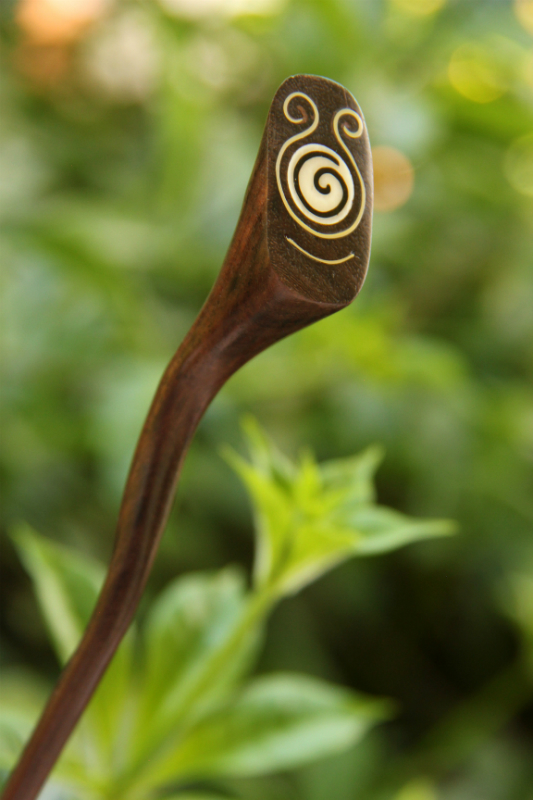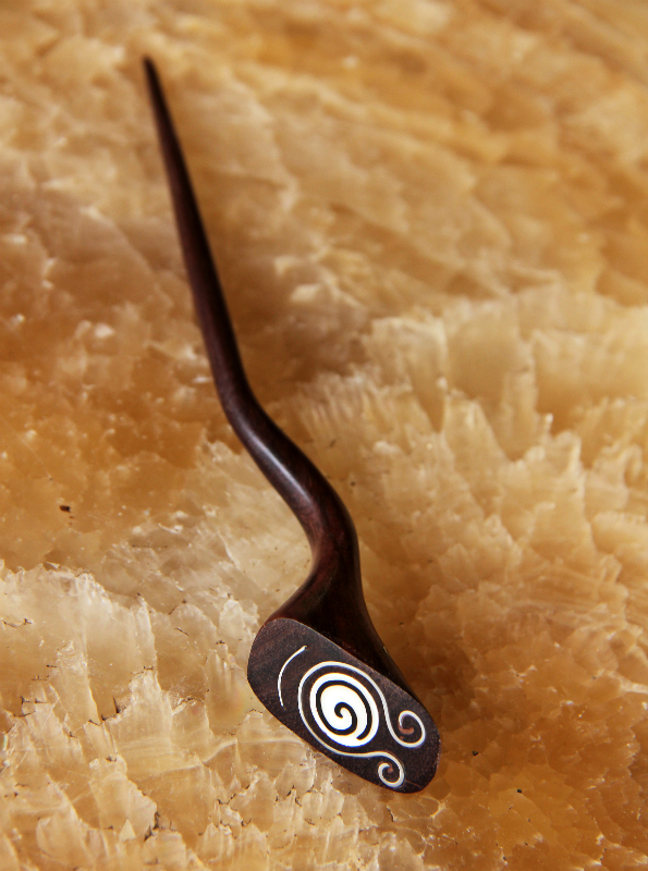 Originální jehlice z lehkého tropického dřeva zdobená mušlovinou a kovovou aplikací. Dřevo pochází z indonéských ostrovů, kde mu říkají "sono wood".