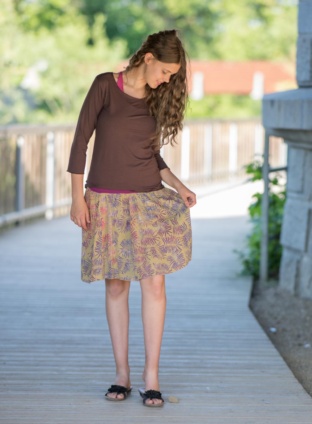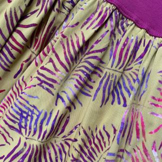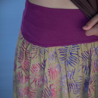 Krátká sukně s ručním potiskem voskové batiky. Pohodlný, pružný lem v pase si oblíbí především Vaše bříško, i to s miminkem uvnitř.