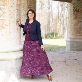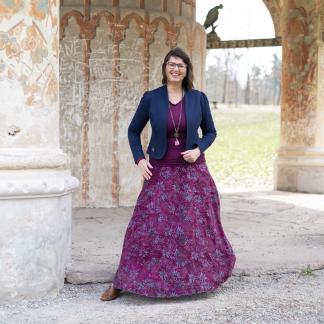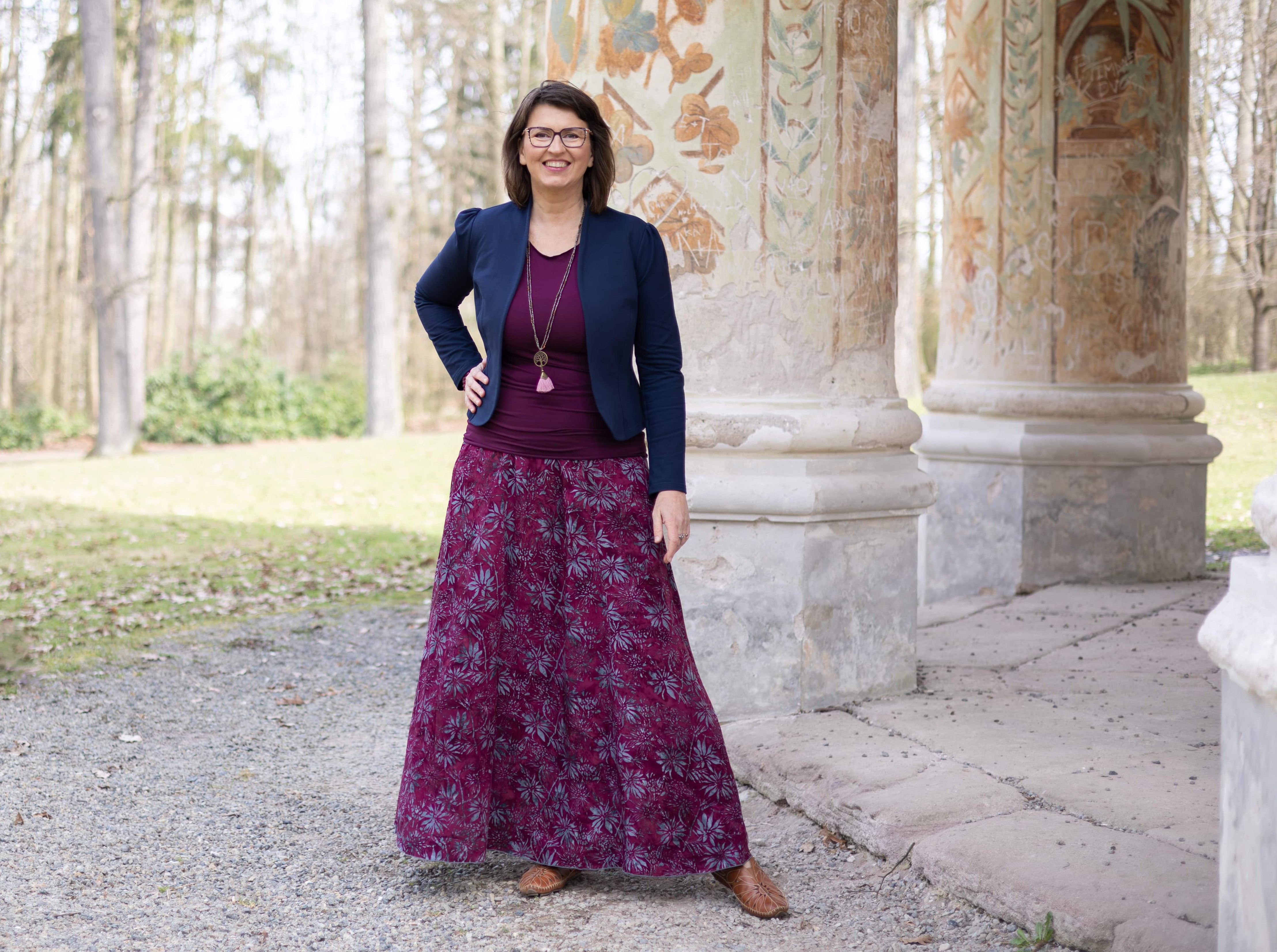 Barva sukně: Lilková vínová a šedý vzor květů