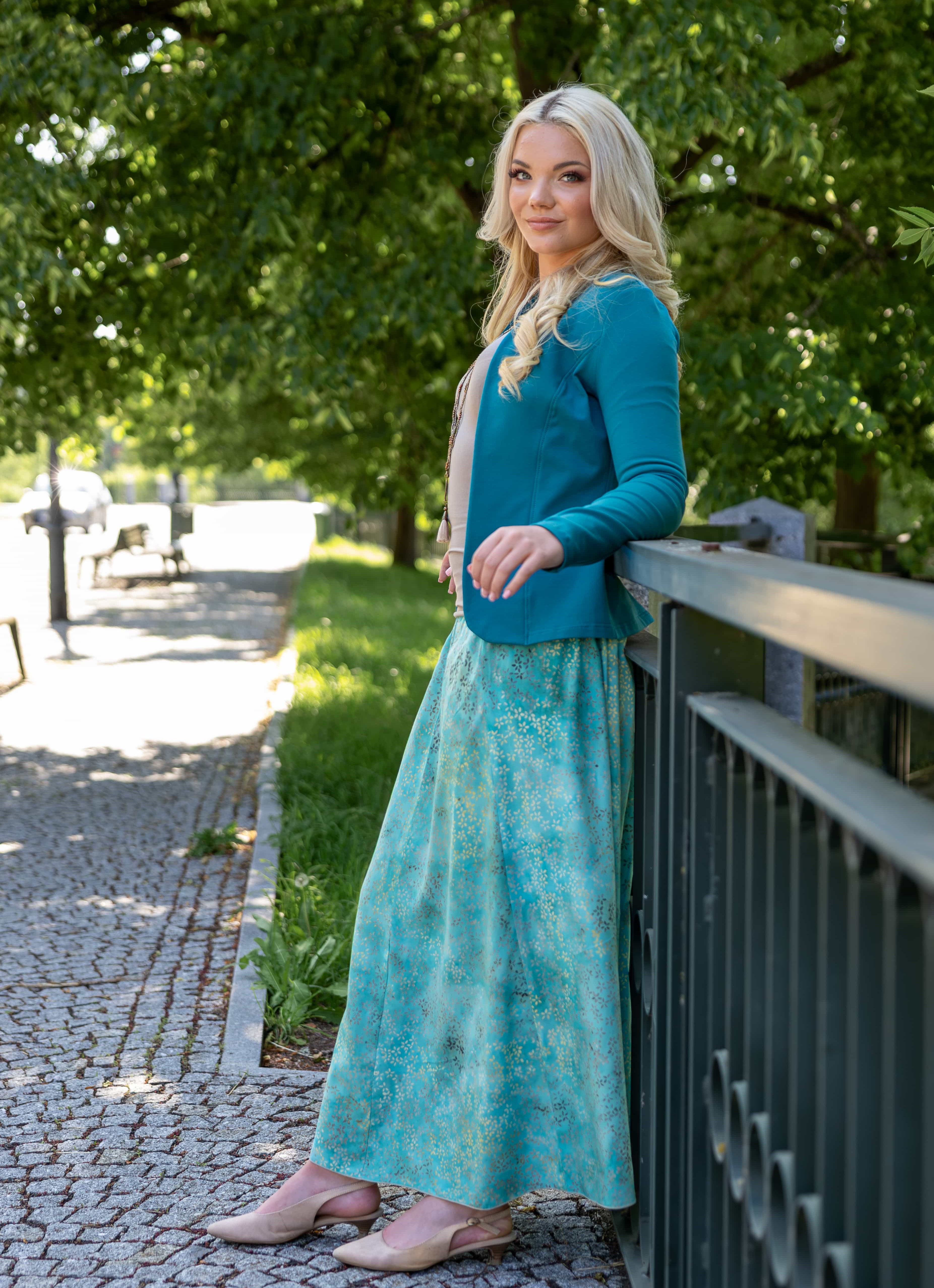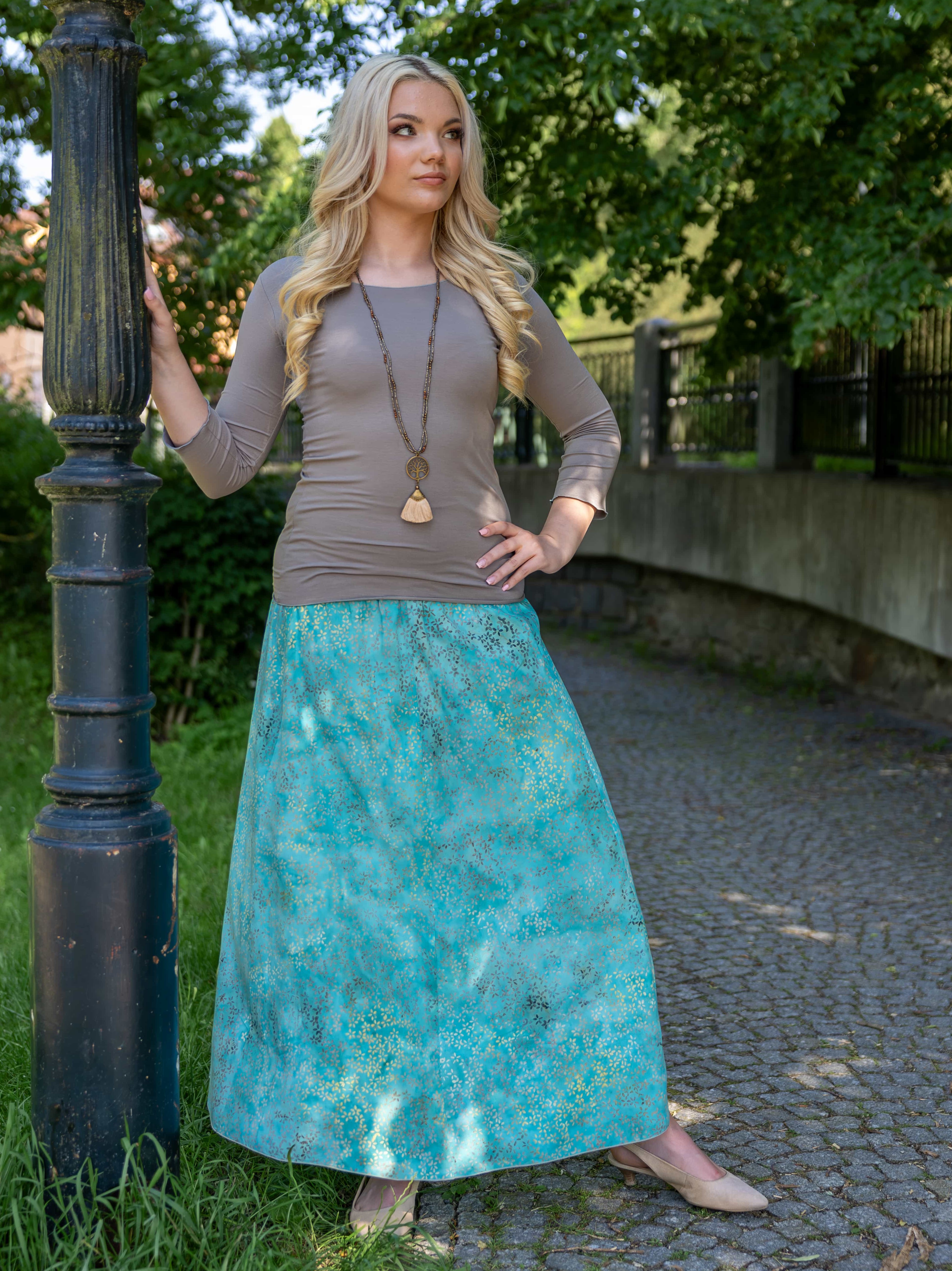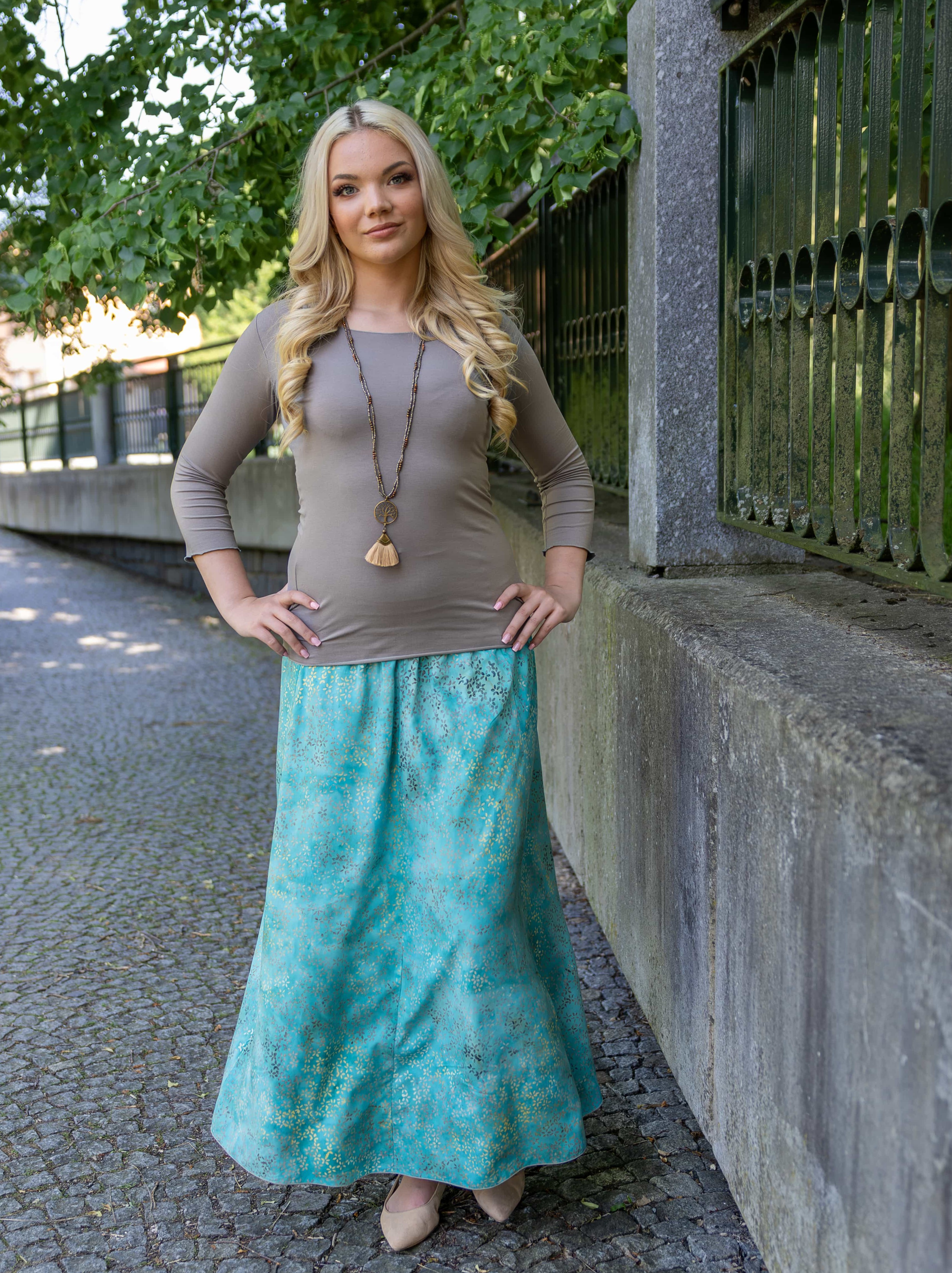 Vysoký elastický pas je nesmírně pohodlný na nošení. Sukně je vhodná i pro těhotné, pružný náplet v pase se krásně přizpůsobí bříšku a obejme ho po celém jeho obvodu. Ikonická Pacha sukně s délkou až na zem se krásně vlní při chůzi a vytváří ženskou siluetu.