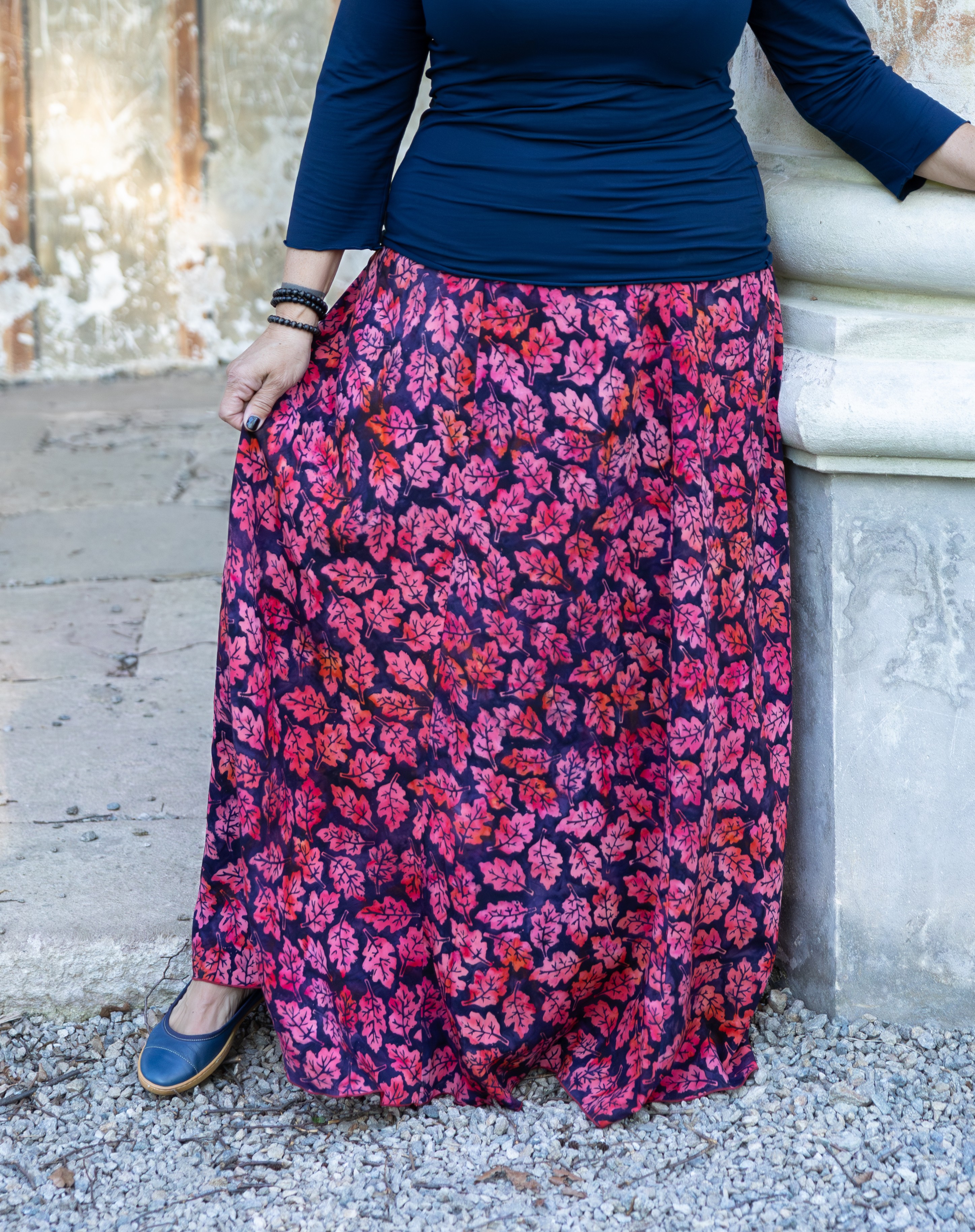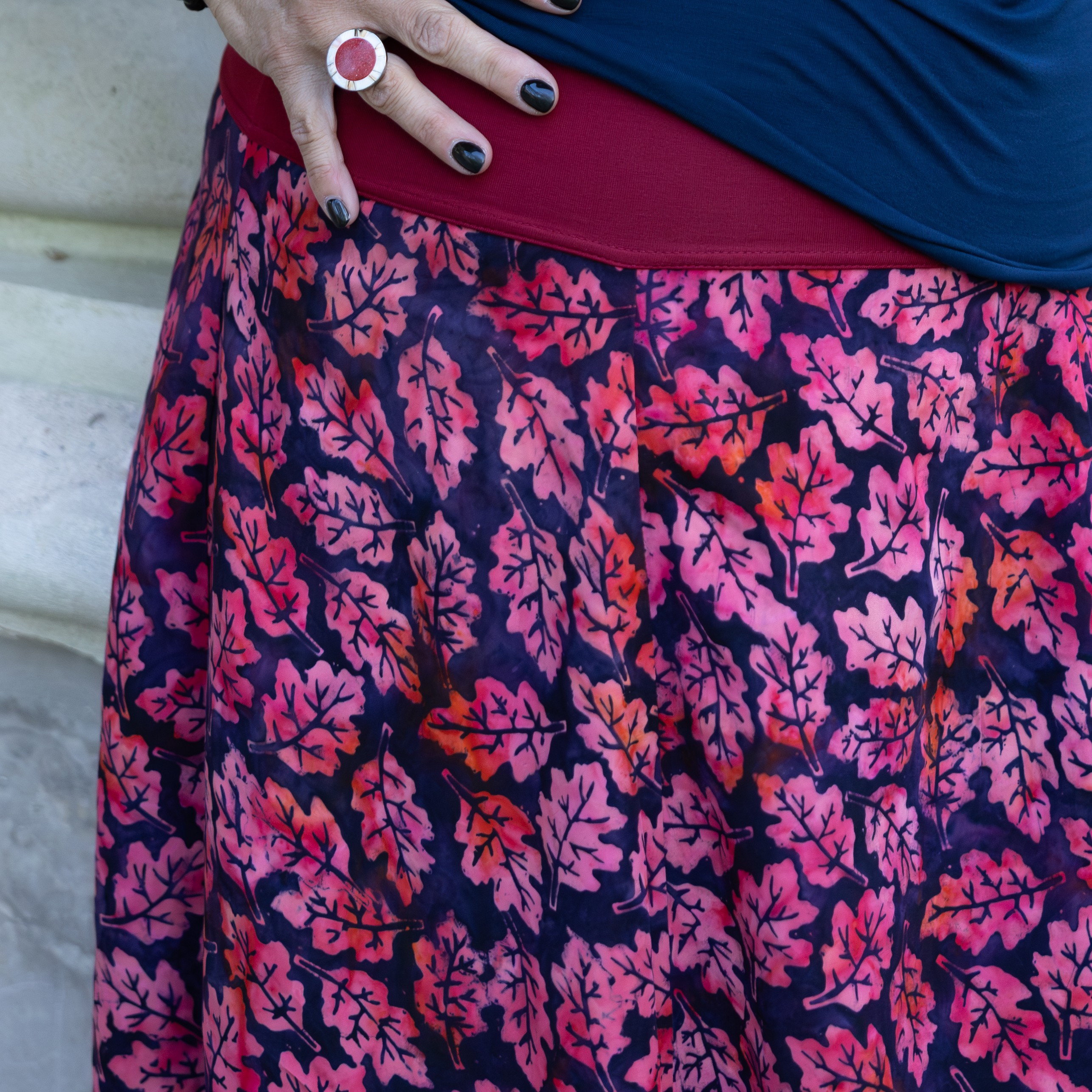 Barva sukně: tmavě modrá s vínovými listy