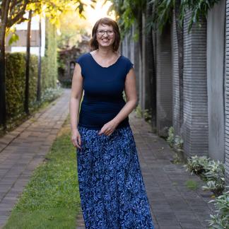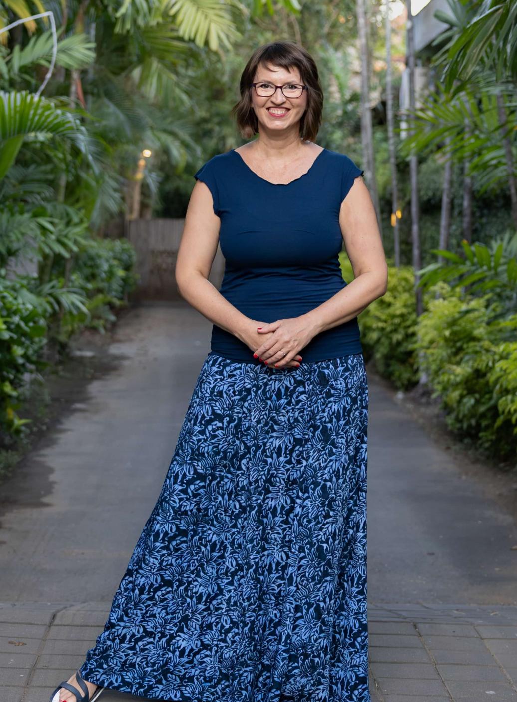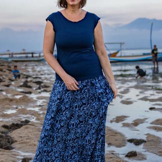 Vysoký elastický pas je nesmírně pohodlný na nošení. Sukně je vhodná i pro těhotné, pružný náplet v pase se krásně přizpůsobí bříšku a obejme ho po celém jeho obvodu. Ikonická Pacha sukně s délkou až na zem se krásně vlní při chůzi a  vytváří ženskou siluetu.