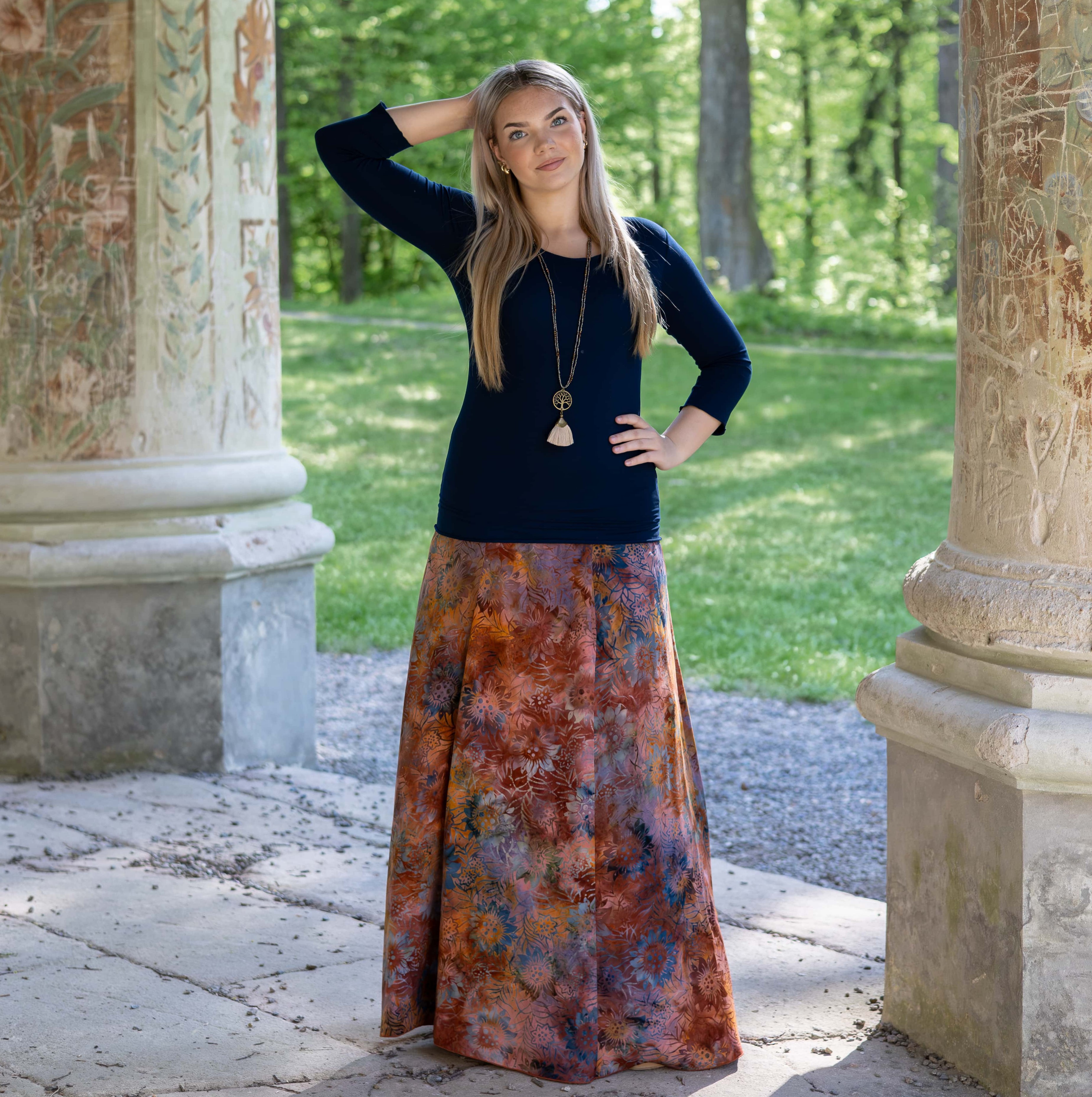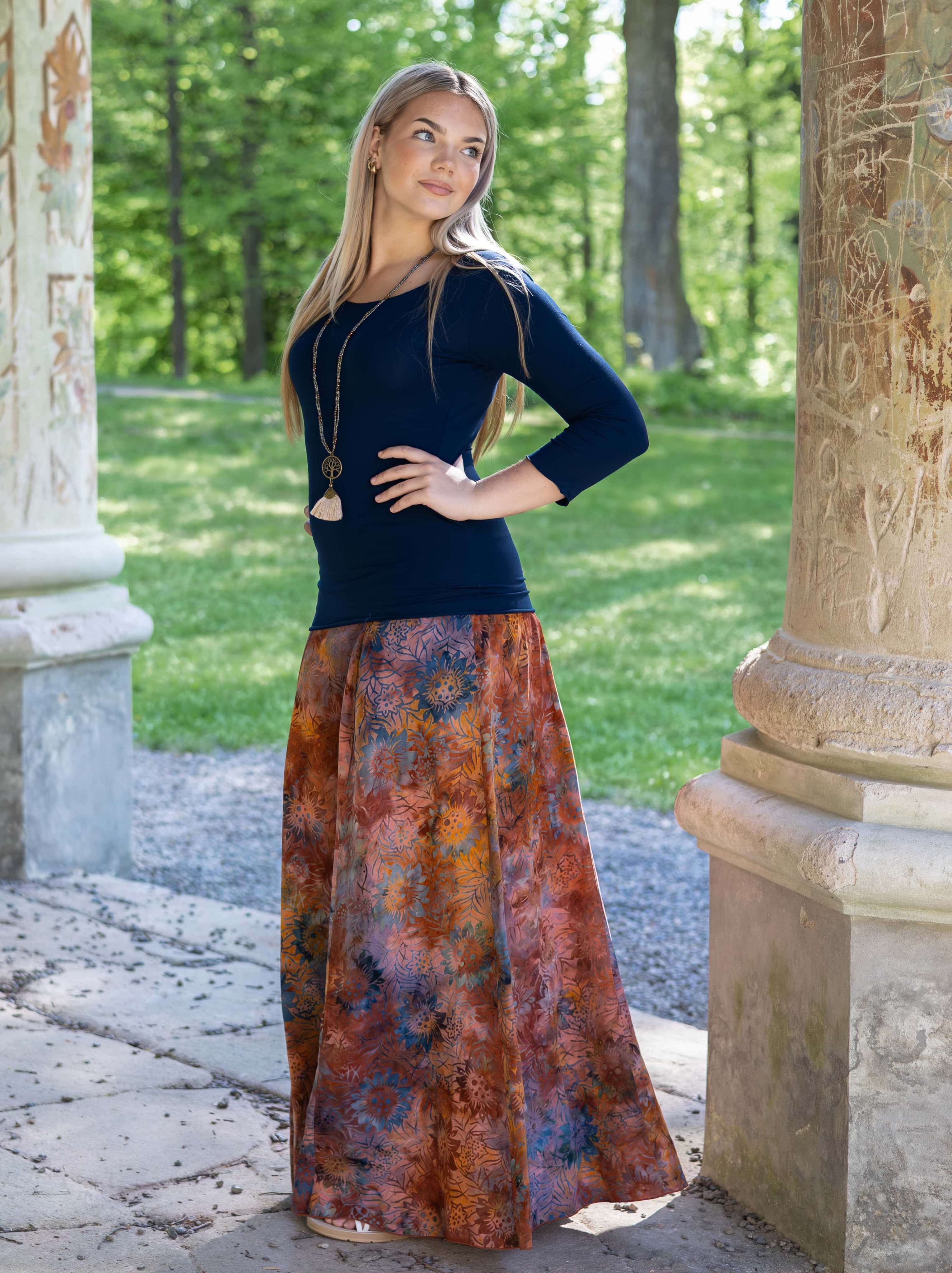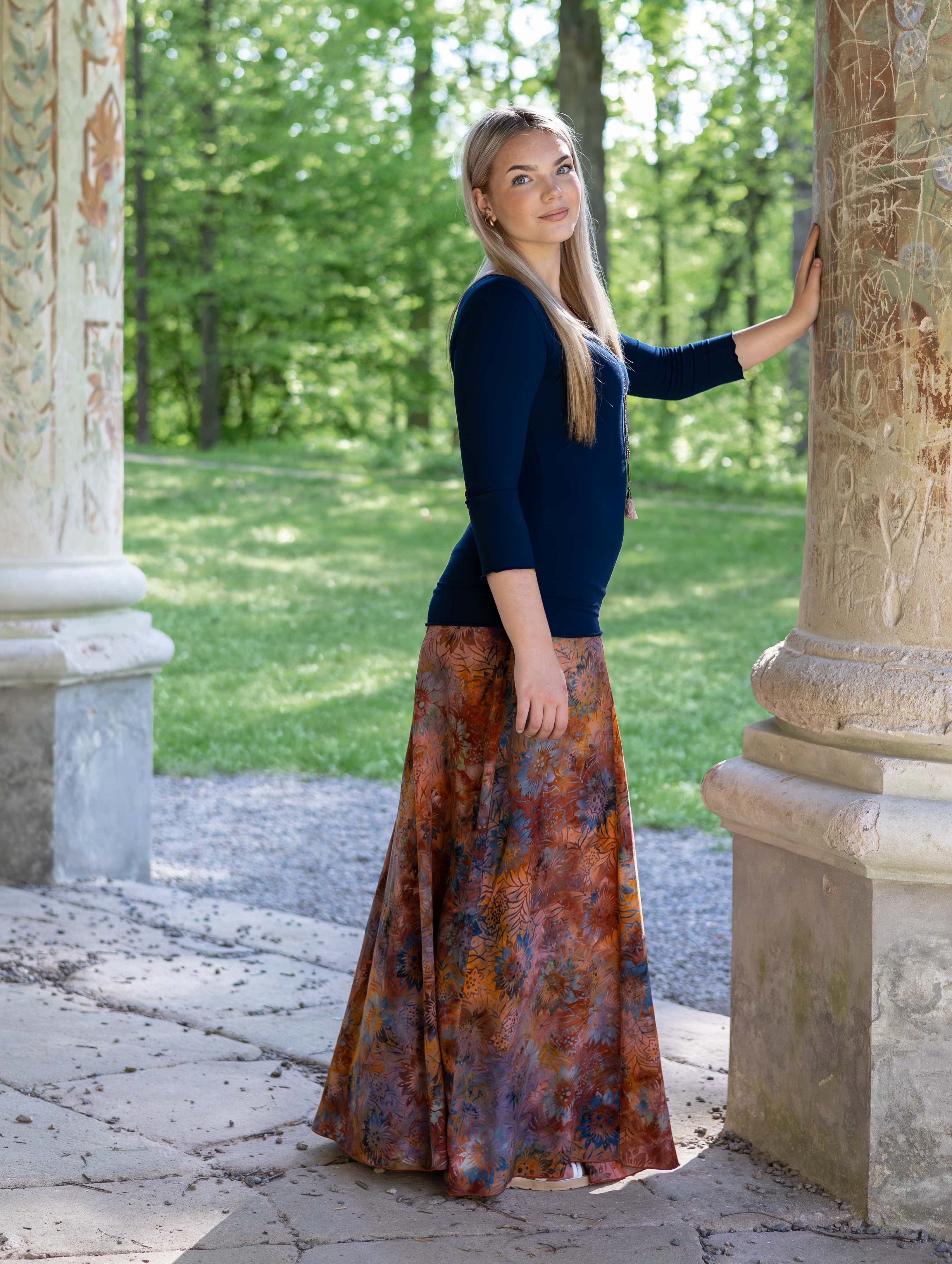 Vysoký elastický pas je nesmírně pohodlný na nošení. Sukně je vhodná i pro těhotné, pružný náplet v pase se krásně přizpůsobí bříšku a obejme ho po celém jeho obvodu. Ikonická Pacha sukně s délkou až na zem se krásně vlní při chůzi a vytváří ženskou siluetu.