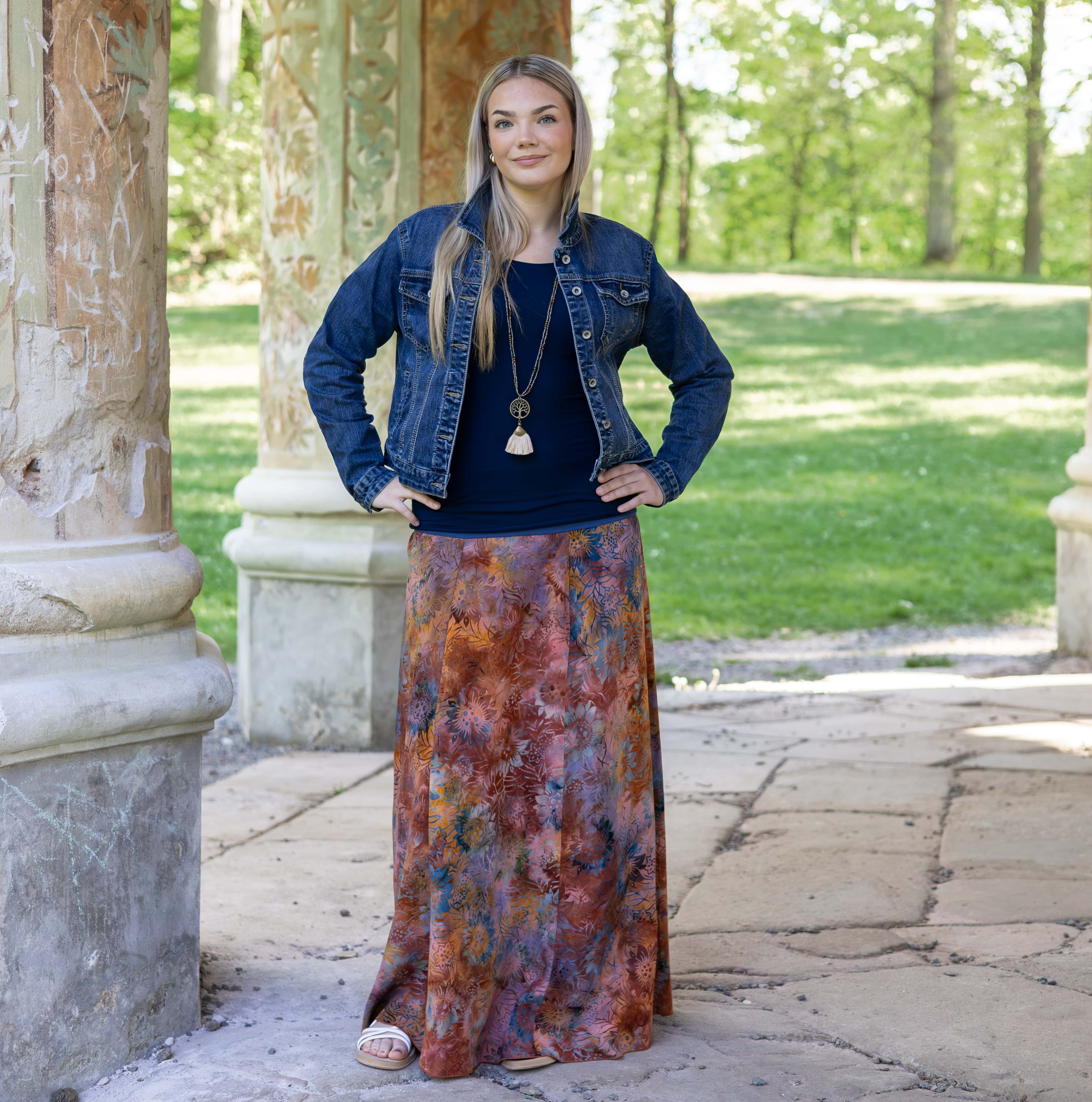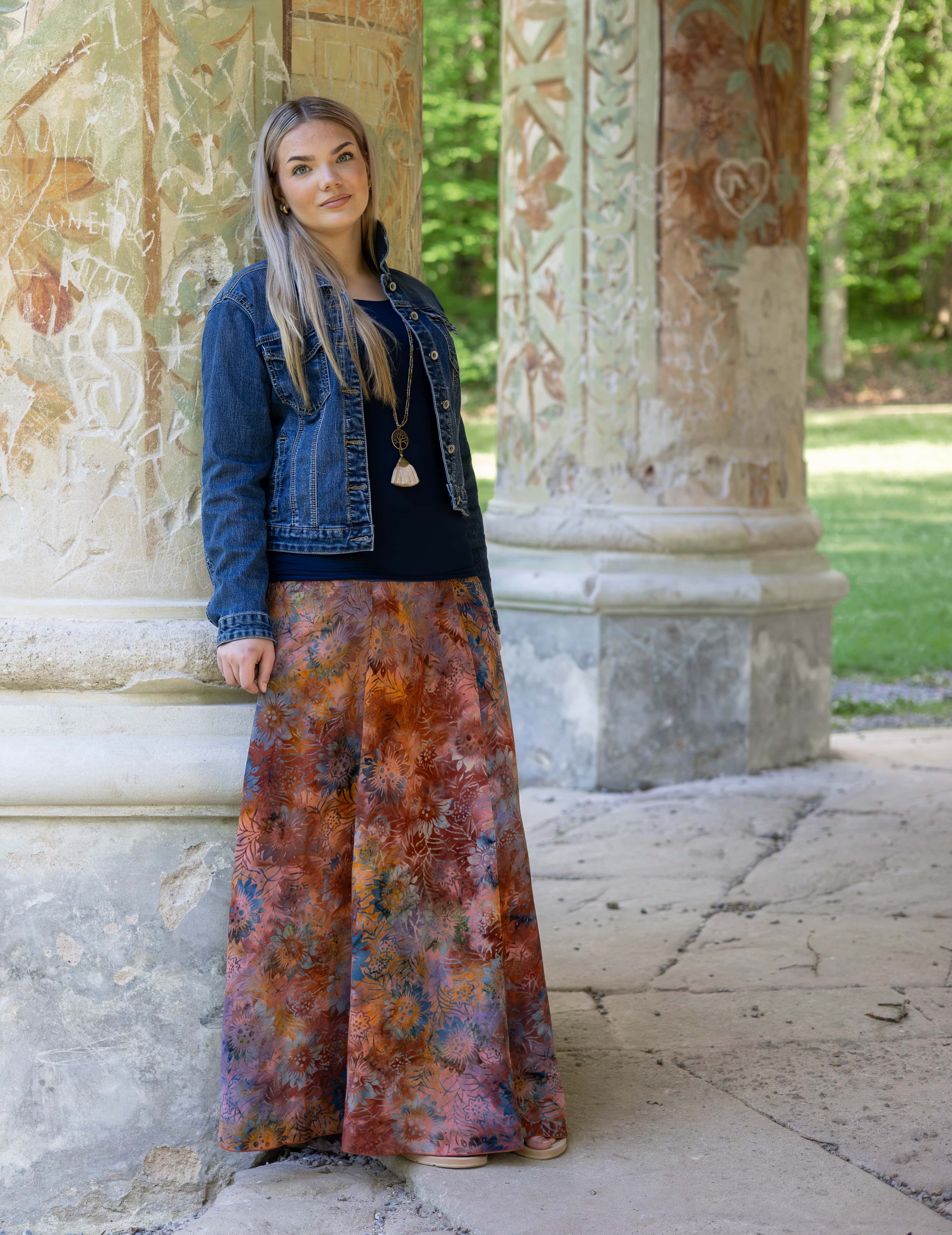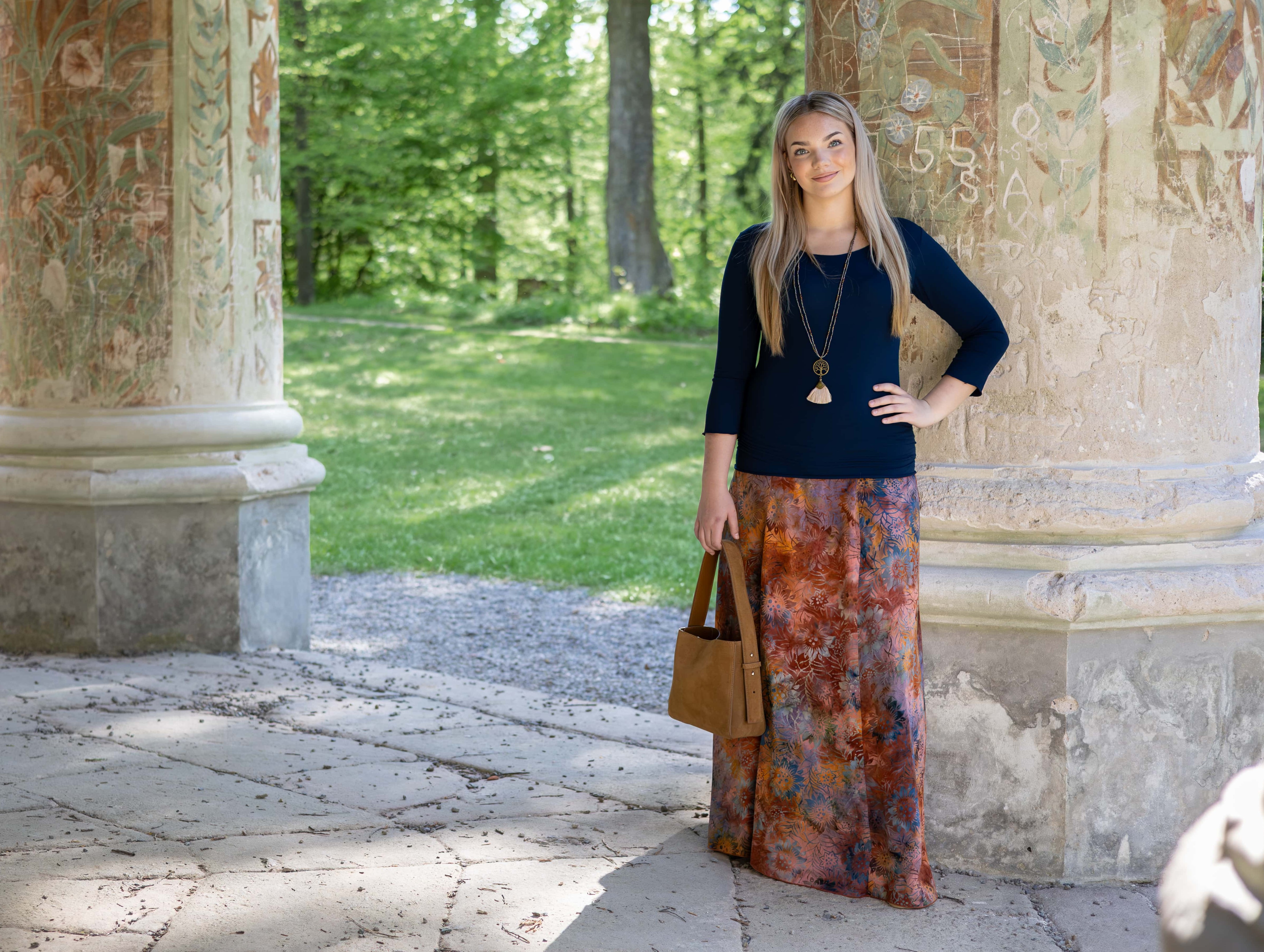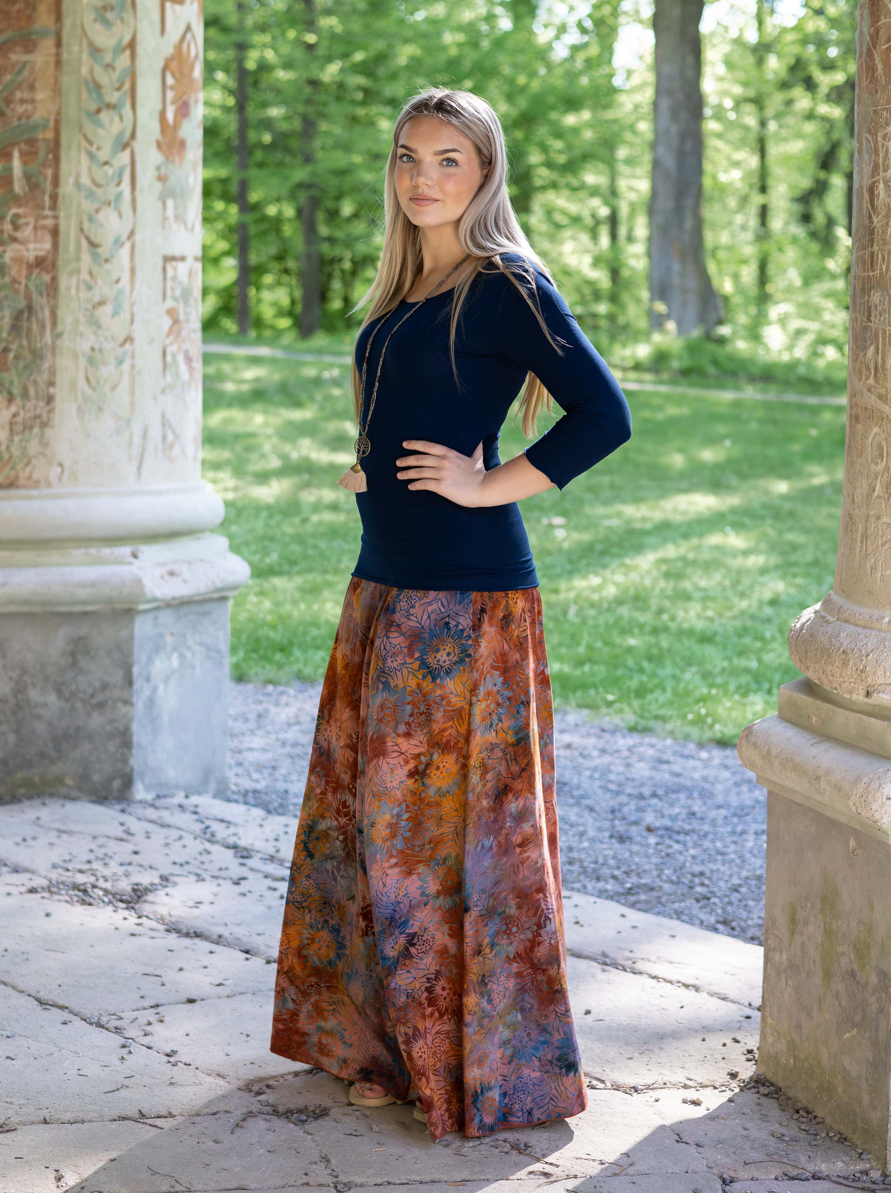 Vysoký elastický pas je nesmírně pohodlný na nošení. Sukně je vhodná i pro těhotné, pružný náplet v pase se krásně přizpůsobí bříšku a obejme ho po celém jeho obvodu. Ikonická Pacha sukně s délkou až na zem se krásně vlní při chůzi a vytváří ženskou siluetu.