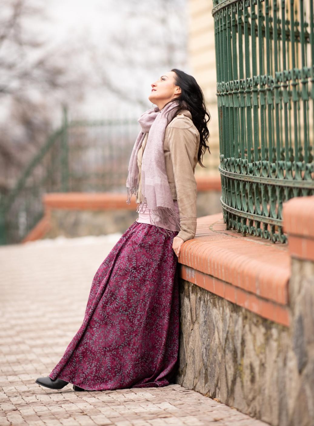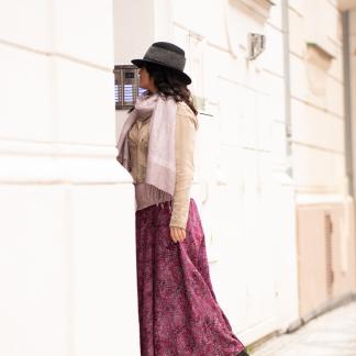 Barva sukně: tmavě vínová s šedivým vzorem.