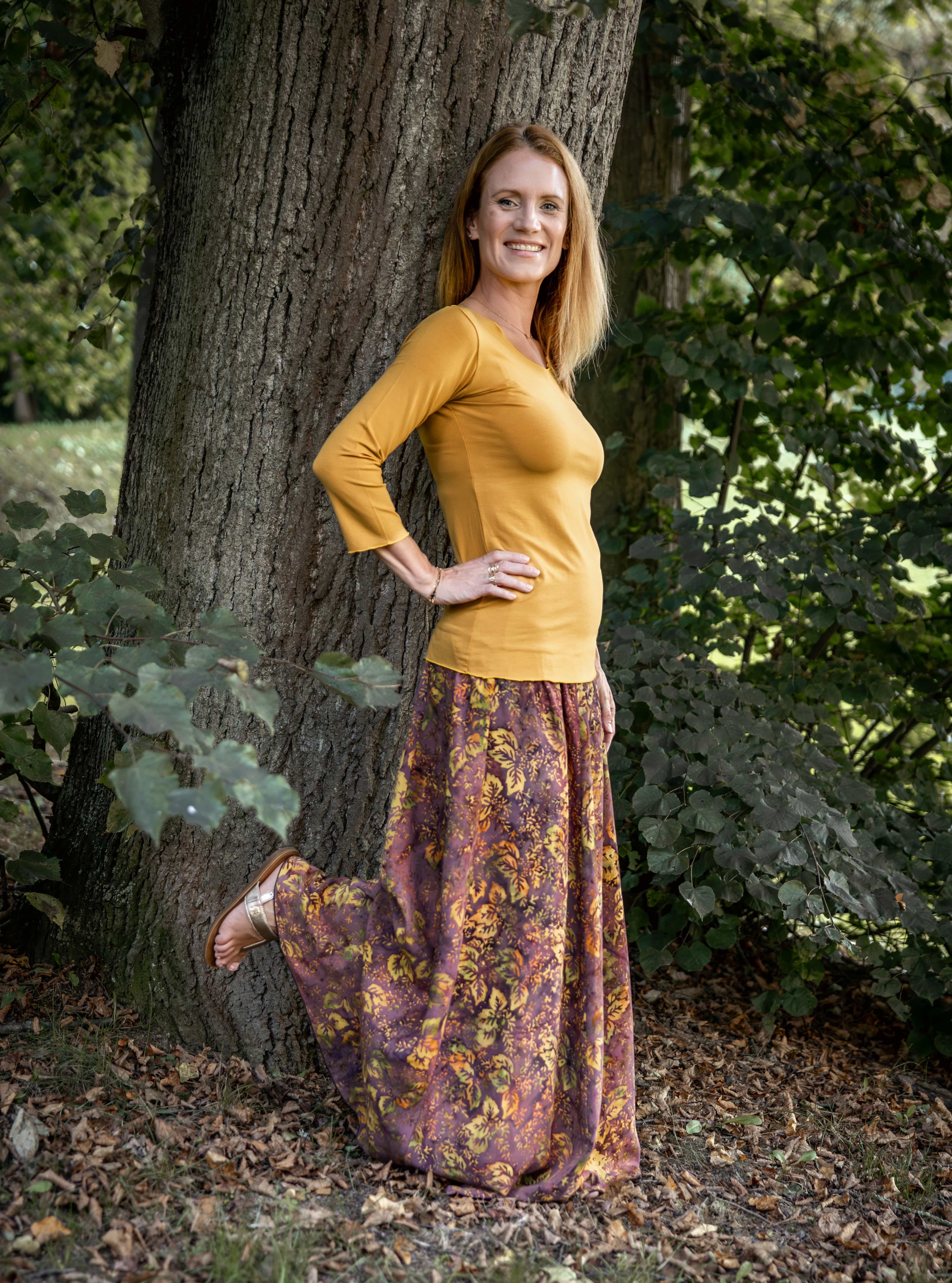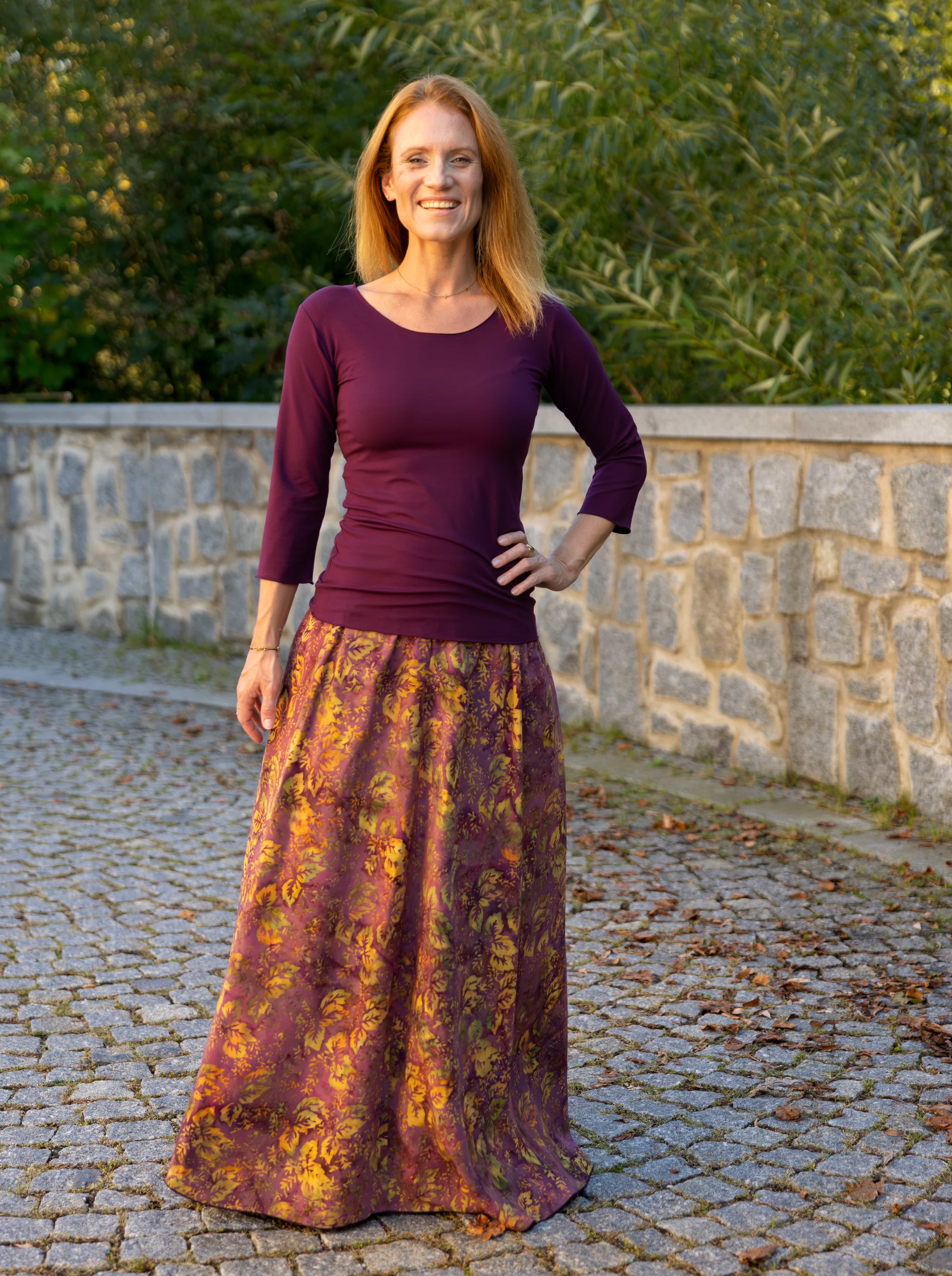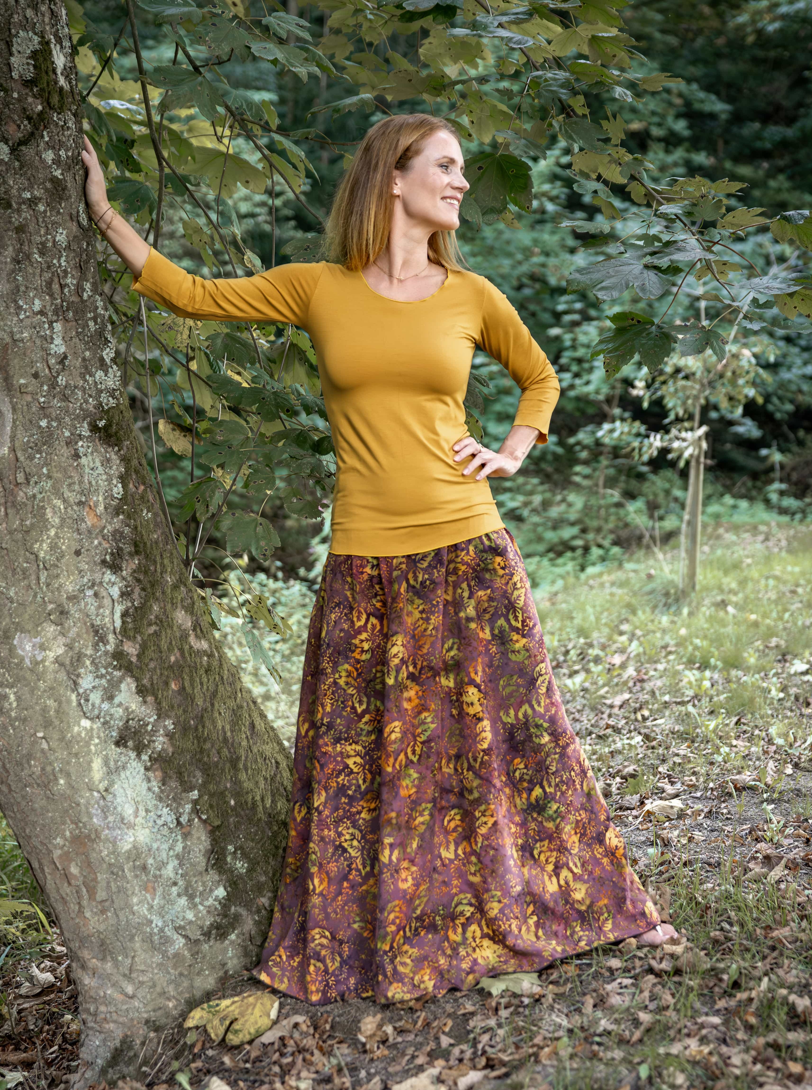 Vysoký elastický pas je nesmírně pohodlný na nošení. Sukně je vhodná i pro těhotné, pružný náplet v pase se krásně přizpůsobí bříšku a obejme ho po celém jeho obvodu. Ikonická Pacha sukně s délkou až na zem se krásně vlní při chůzi a vytváří ženskou siluetu.