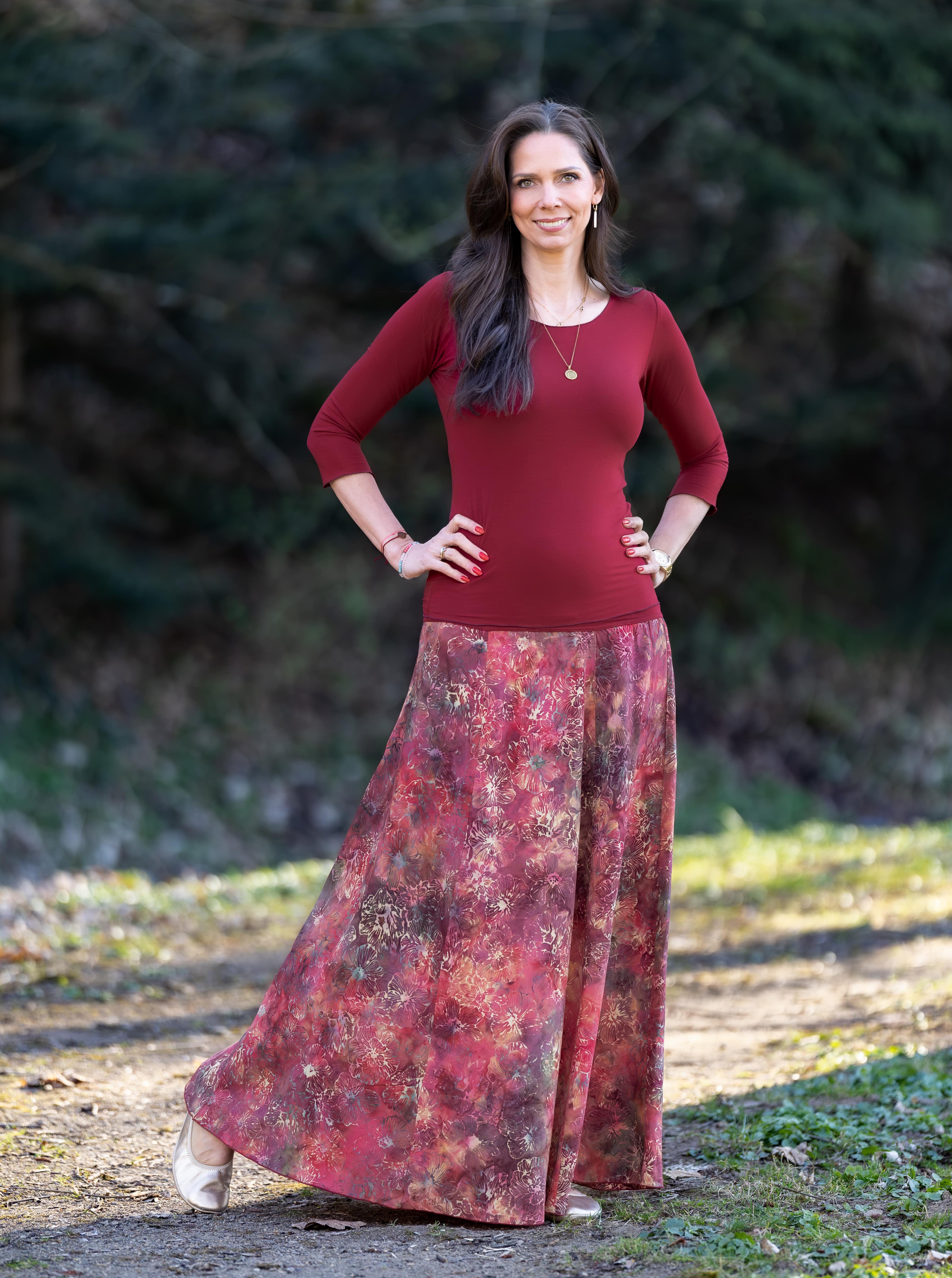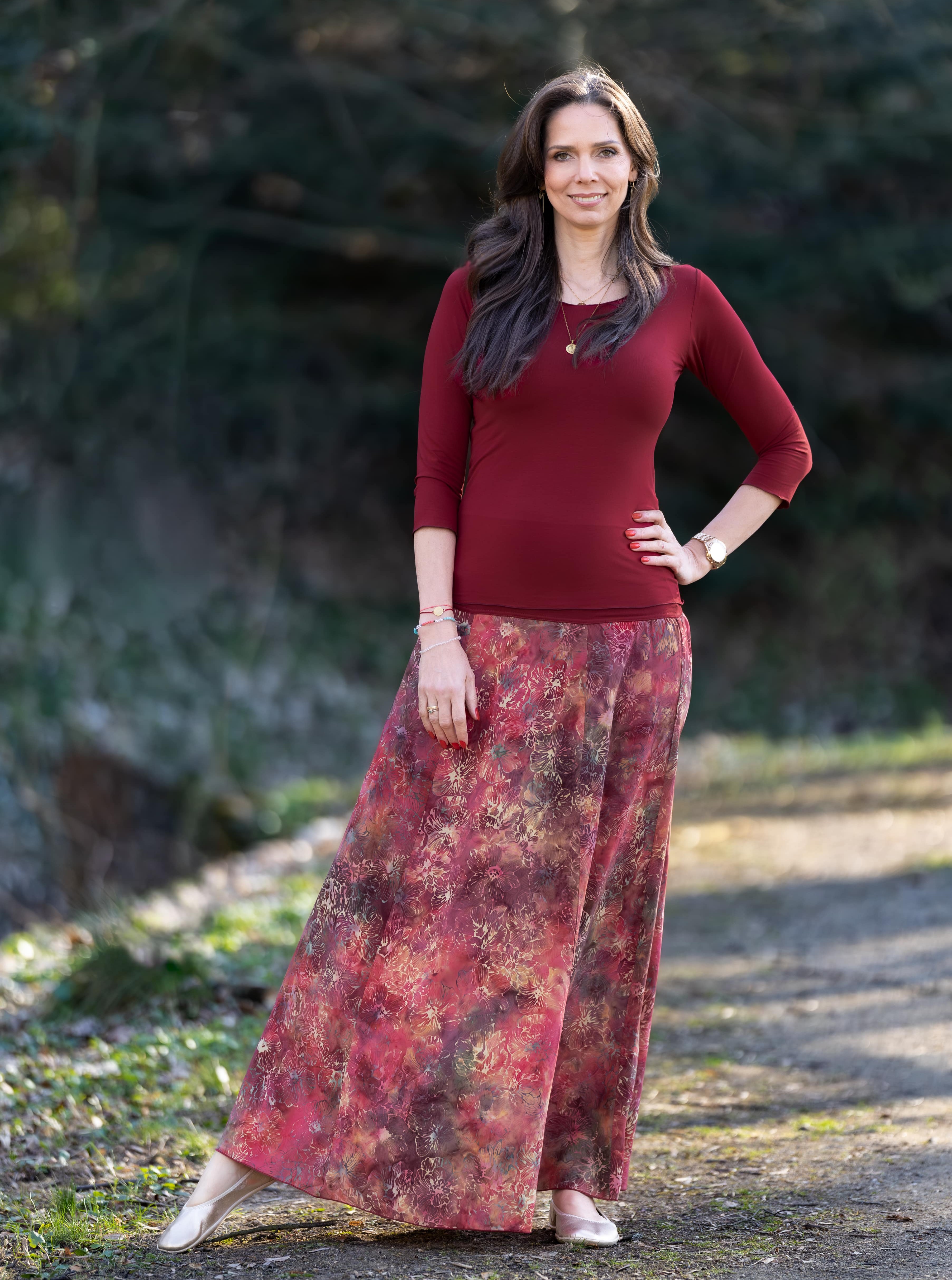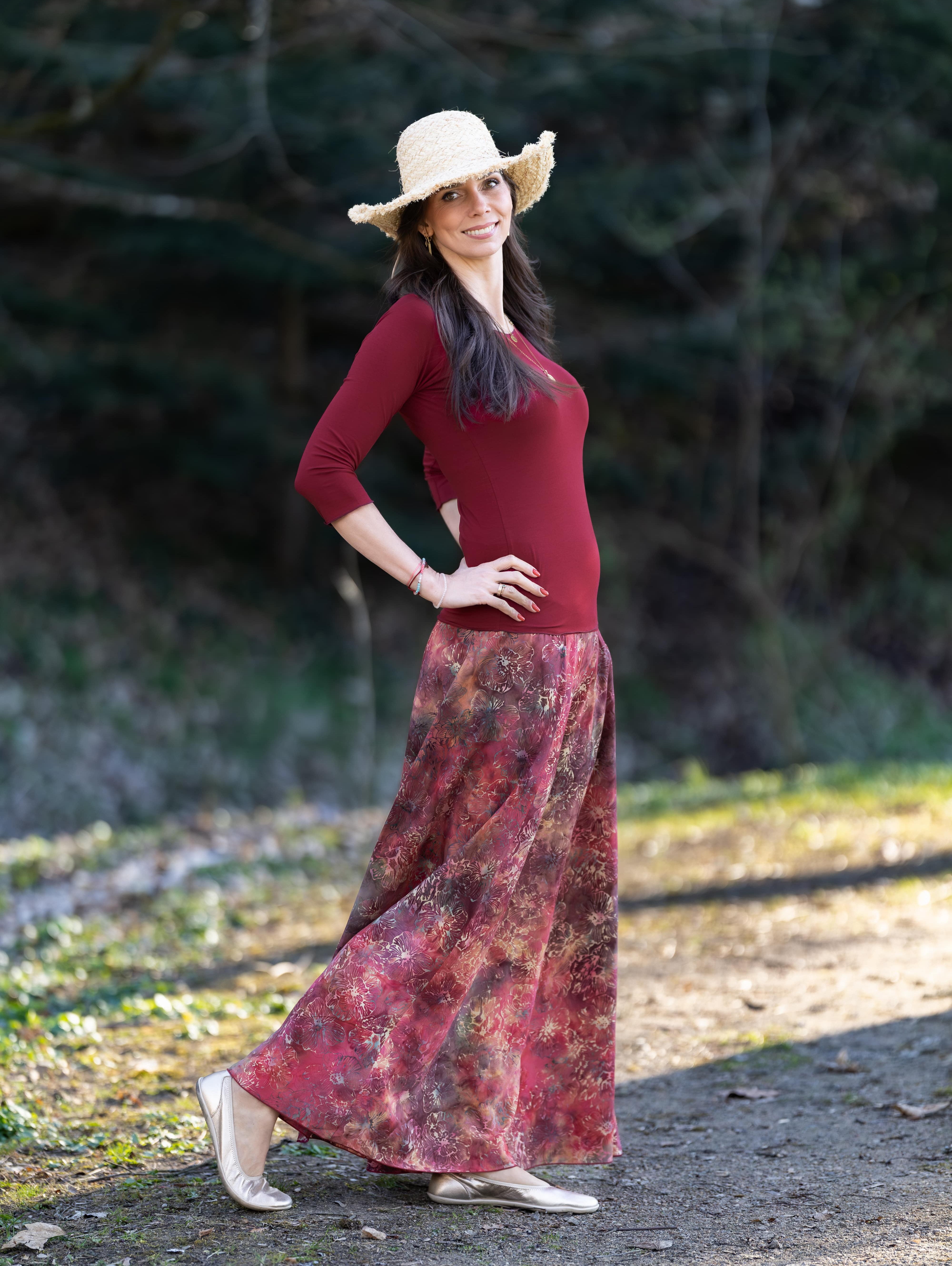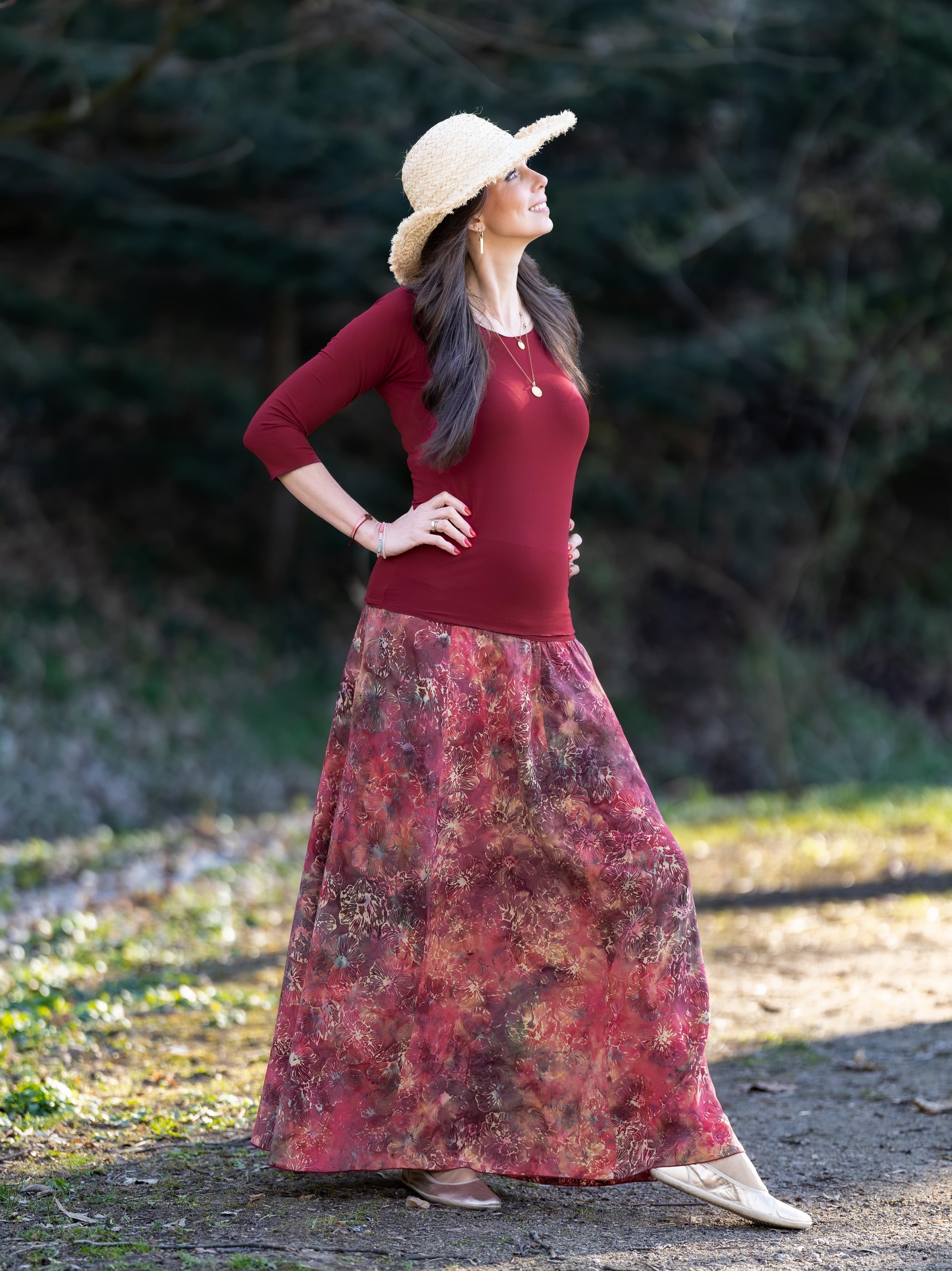 Vysoký elastický pas je nesmírně pohodlný na nošení. Sukně je vhodná i pro těhotné, pružný náplet v pase se krásně přizpůsobí bříšku a obejme ho po celém jeho obvodu. Ikonická Pacha sukně s délkou až na zem se krásně vlní při chůzi a vytváří ženskou siluetu.
