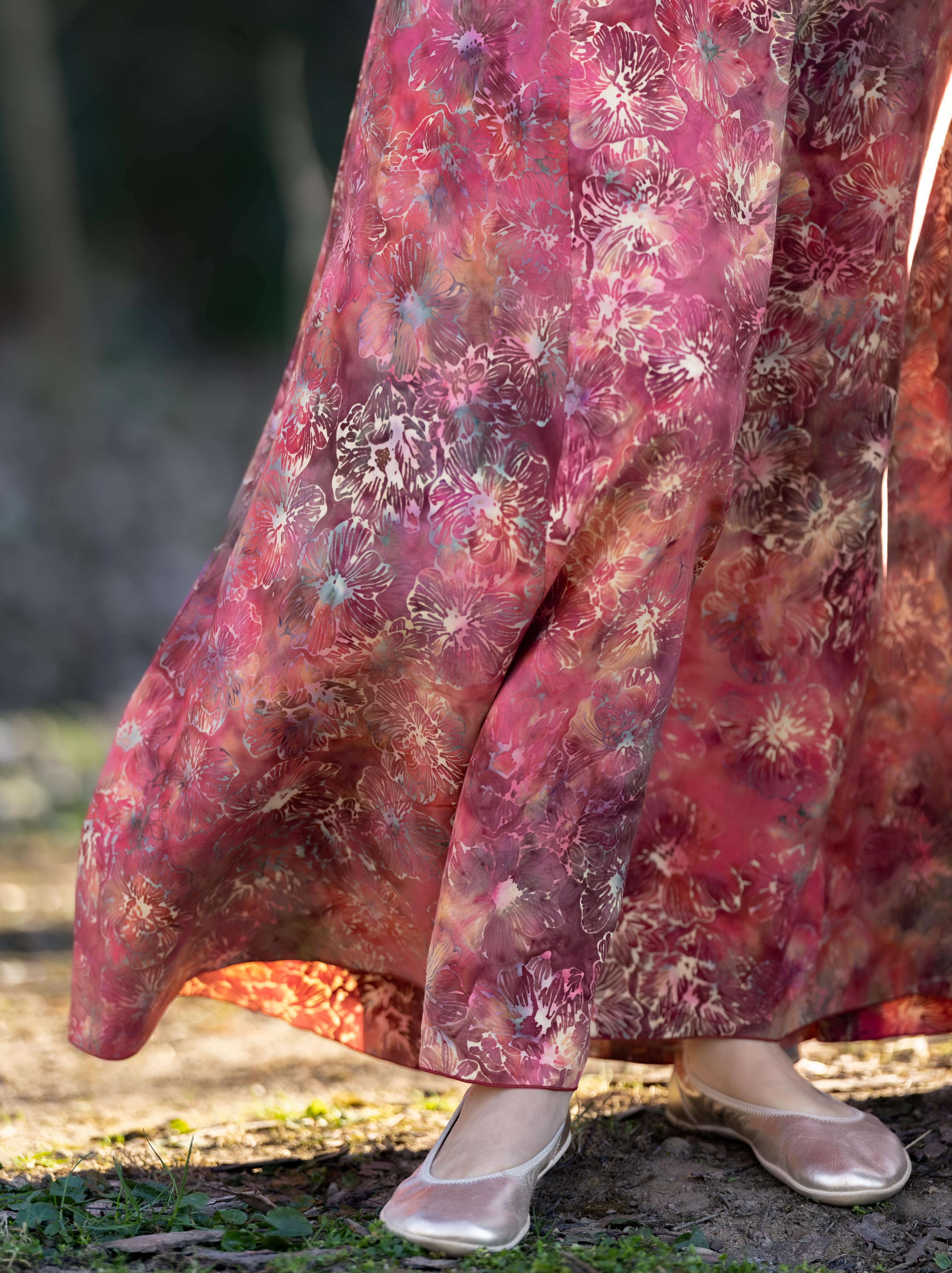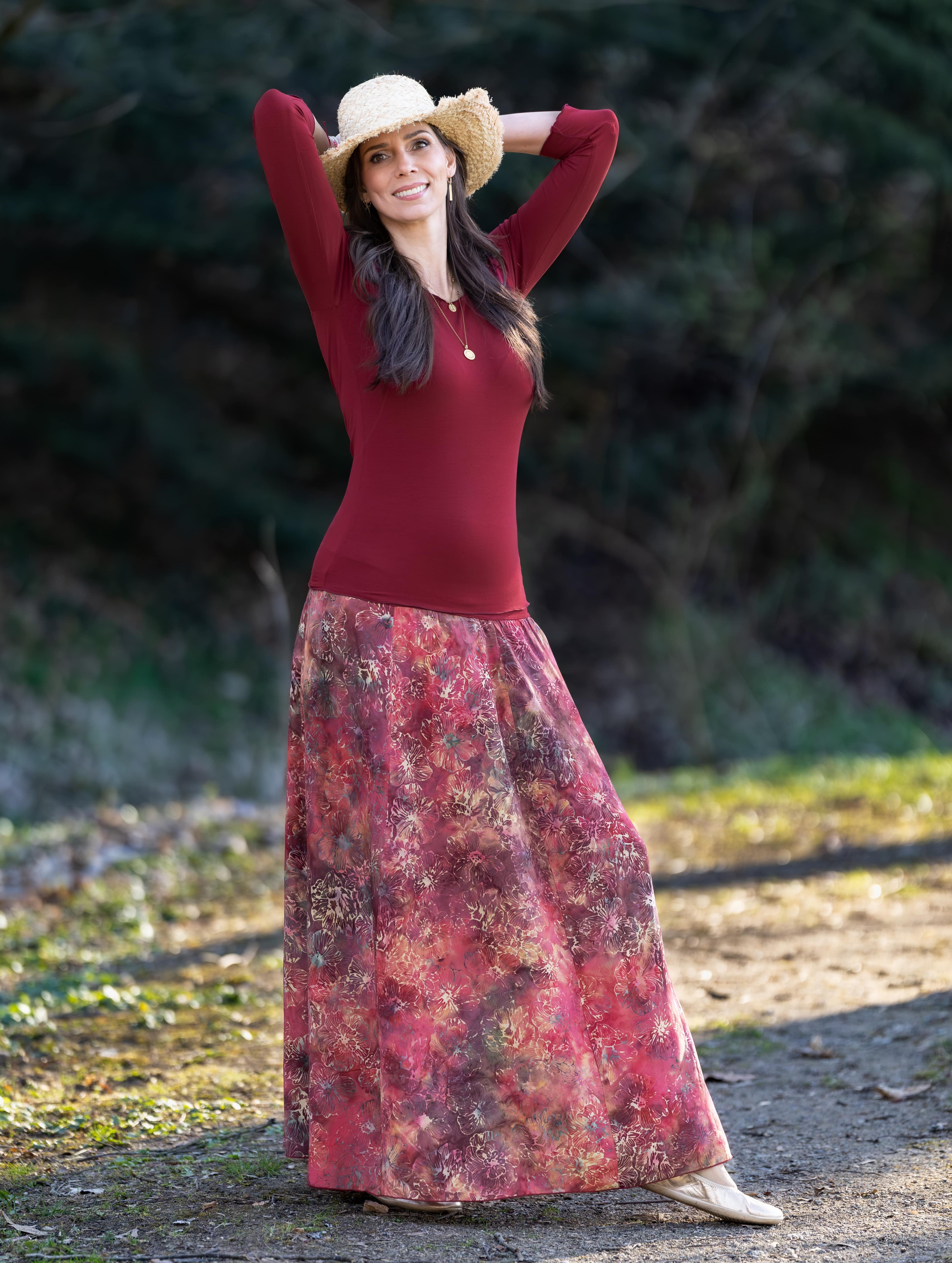 Připravte se na to, že touto úchvatnou, dlouhou sukní přitáhnete pozornost! Sukně je ušitá z lehké viskózové látky a pyšní se nádherným batikovým vzorem.