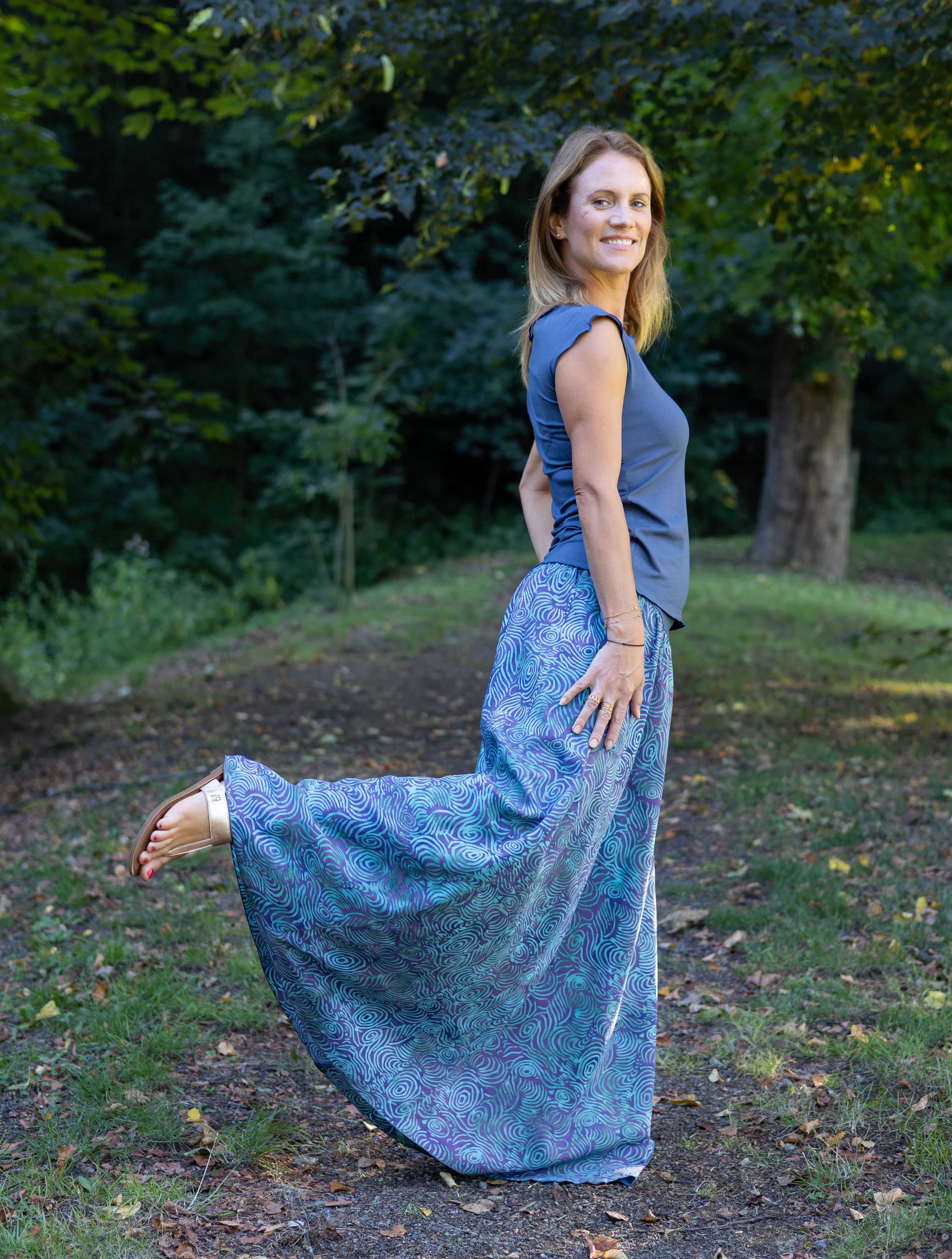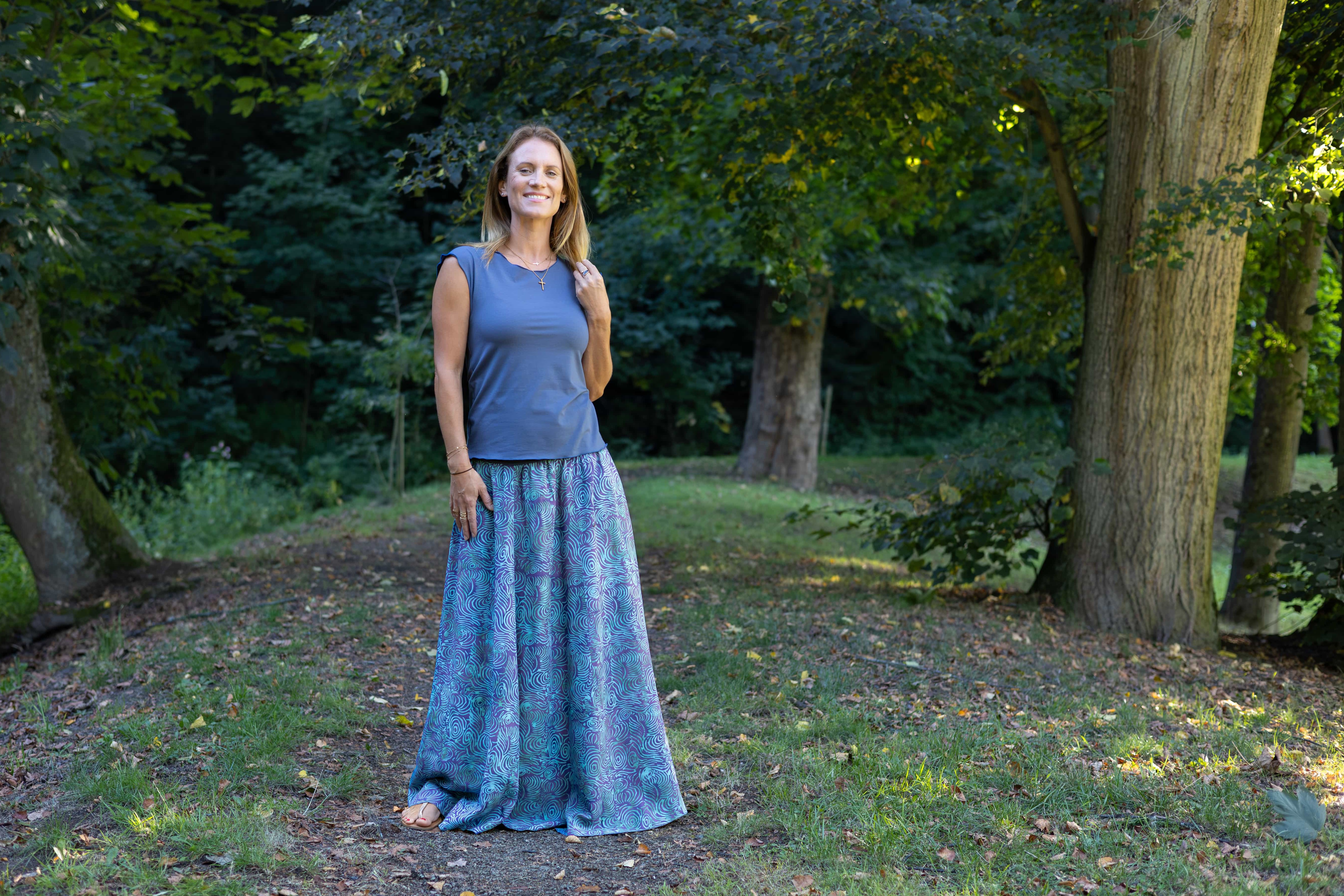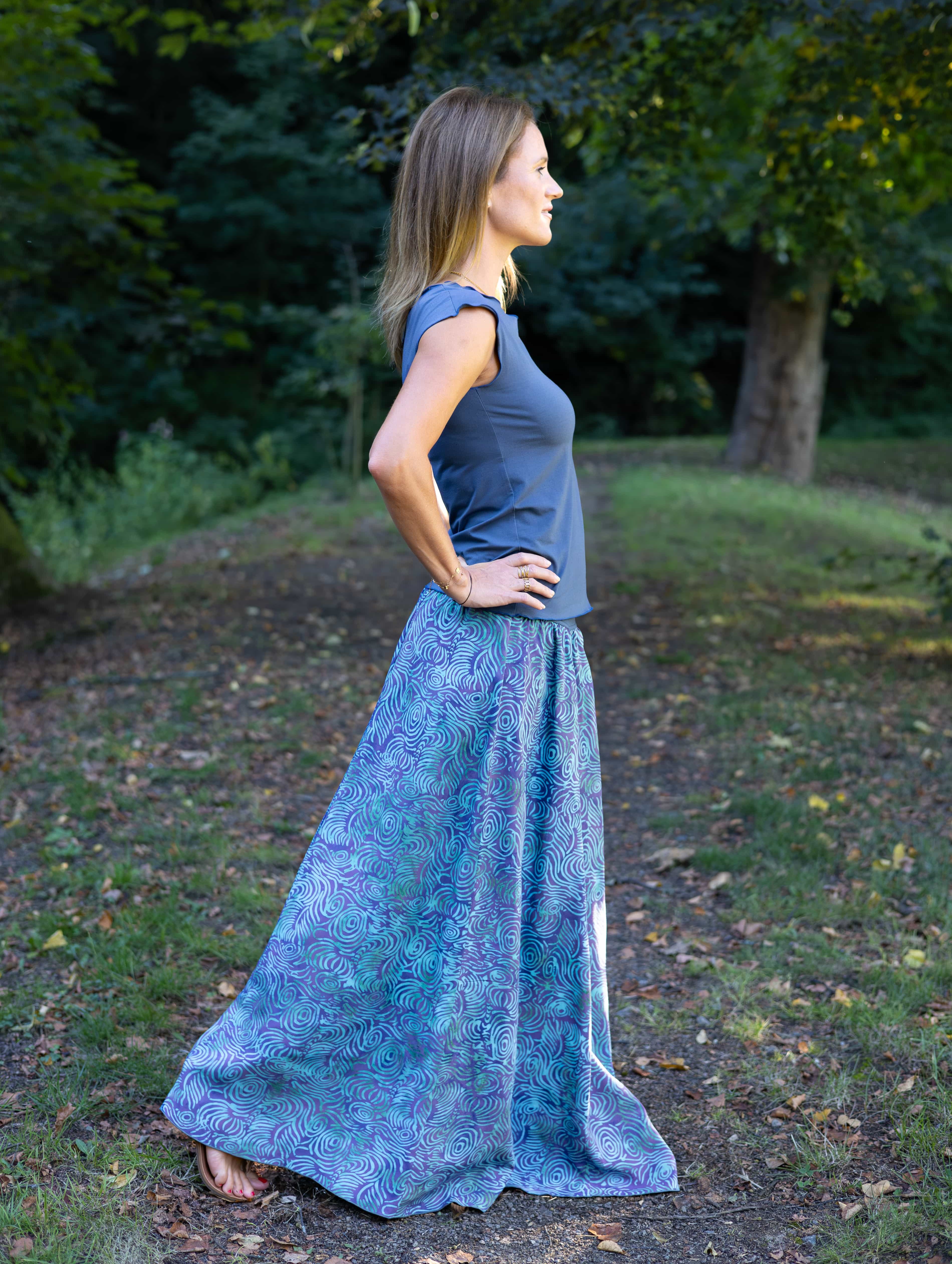 Vysoký elastický pas je nesmírně pohodlný na nošení. Sukně je vhodná i pro těhotné, pružný náplet v pase se krásně přizpůsobí bříšku a obejme ho po celém jeho obvodu. Ikonická Pacha sukně s délkou až na zem se krásně vlní při chůzi a vytváří ženskou siluetu.