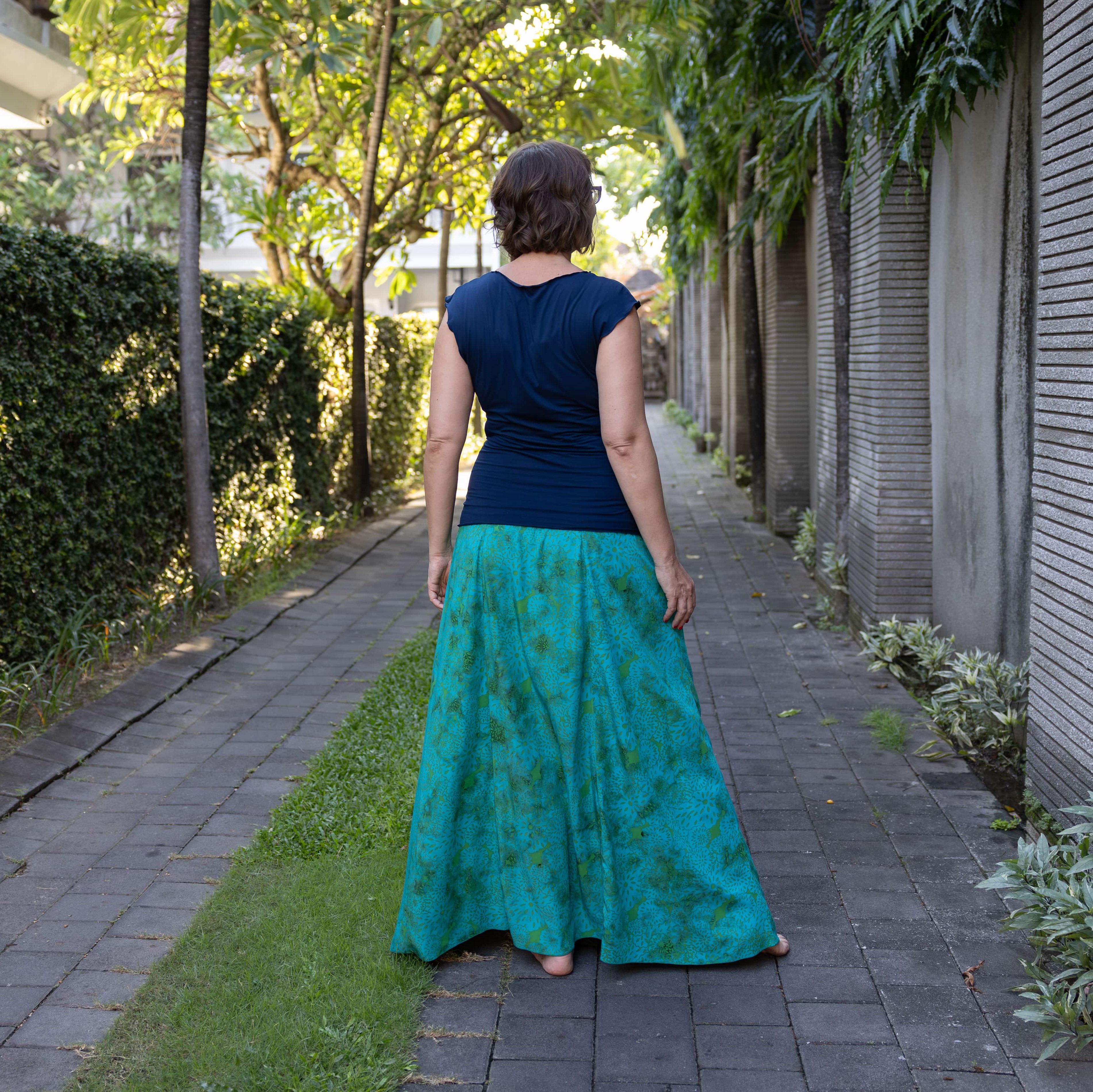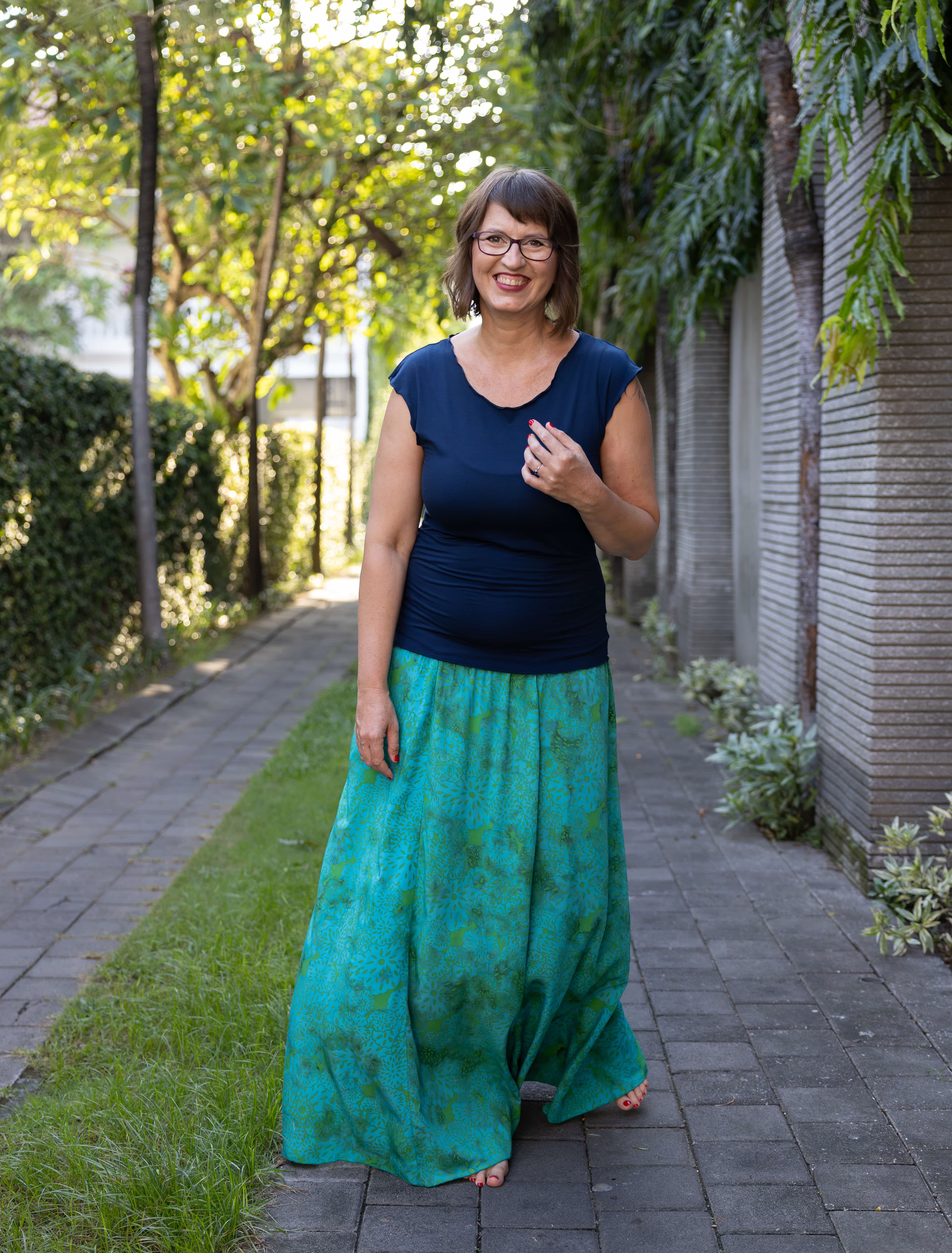 Vysoký elastický pas je nesmírně pohodlný na nošení. Sukně je vhodná i pro těhotné, pružný náplet v pase se krásně přizpůsobí bříšku a obejme ho po celém jeho obvodu. Ikonická Pacha sukně s délkou až na zem se krásně vlní při chůzi a vytváří ženskou siluetu.