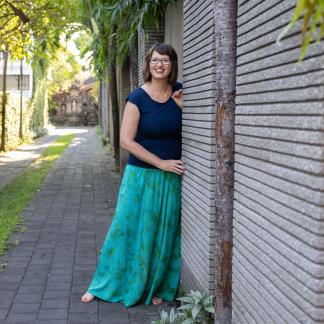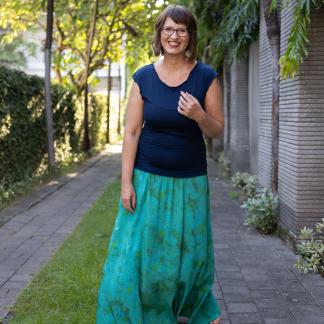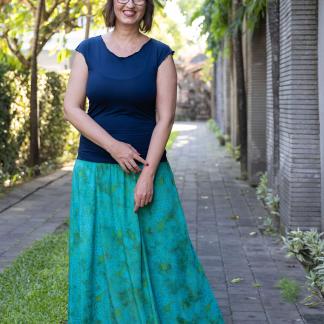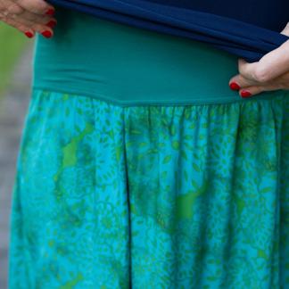 Vysoký elastický pas je nesmírně pohodlný na nošení. Sukně je vhodná i pro těhotné, pružný náplet v pase se krásně přizpůsobí bříšku a obejme ho po celém jeho obvodu. Ikonická Pacha sukně s délkou až na zem se krásně vlní při chůzi a  vytváří ženskou siluetu.