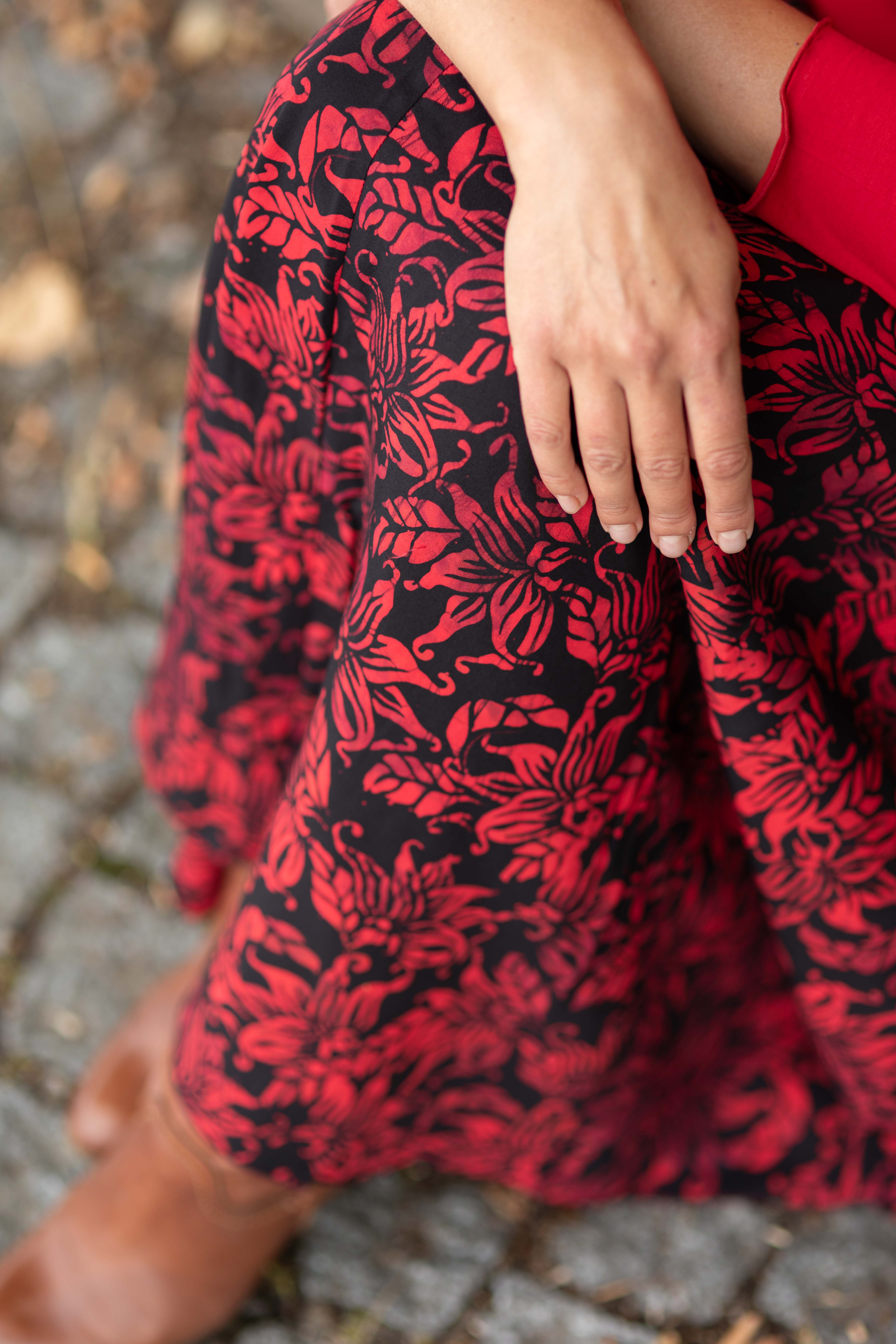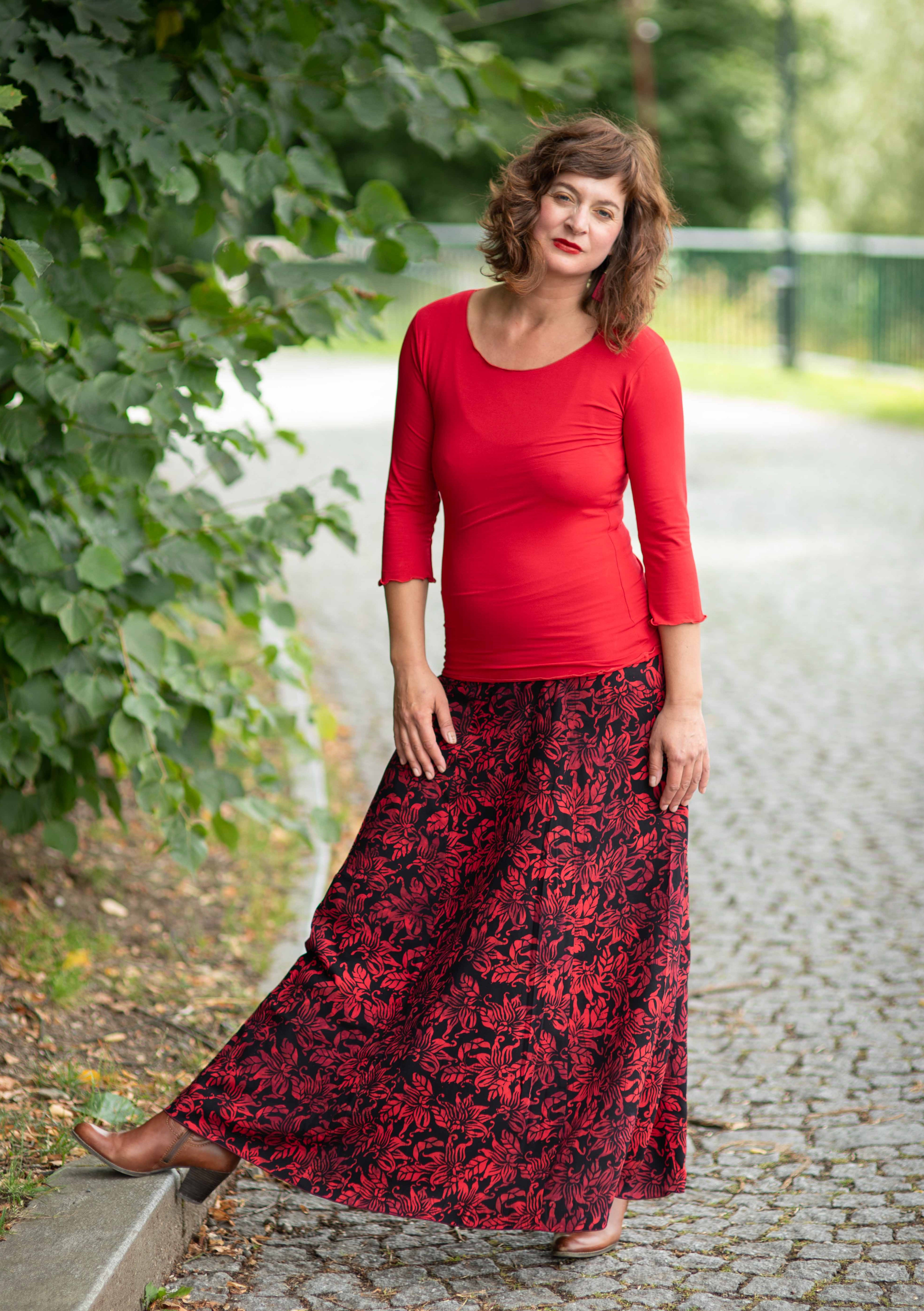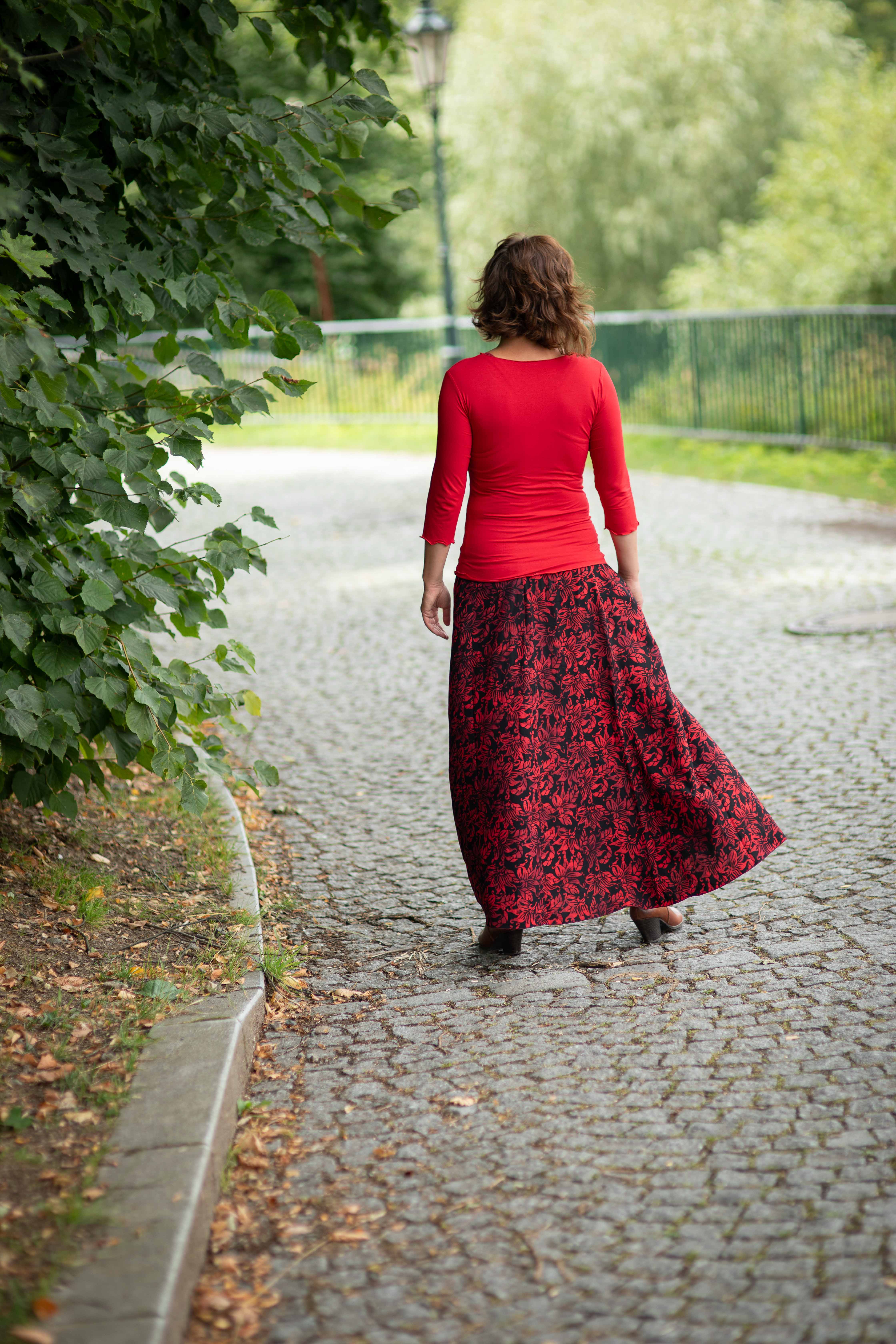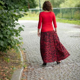 Barva sukně: černá barva s květinovým vzorem v červené.