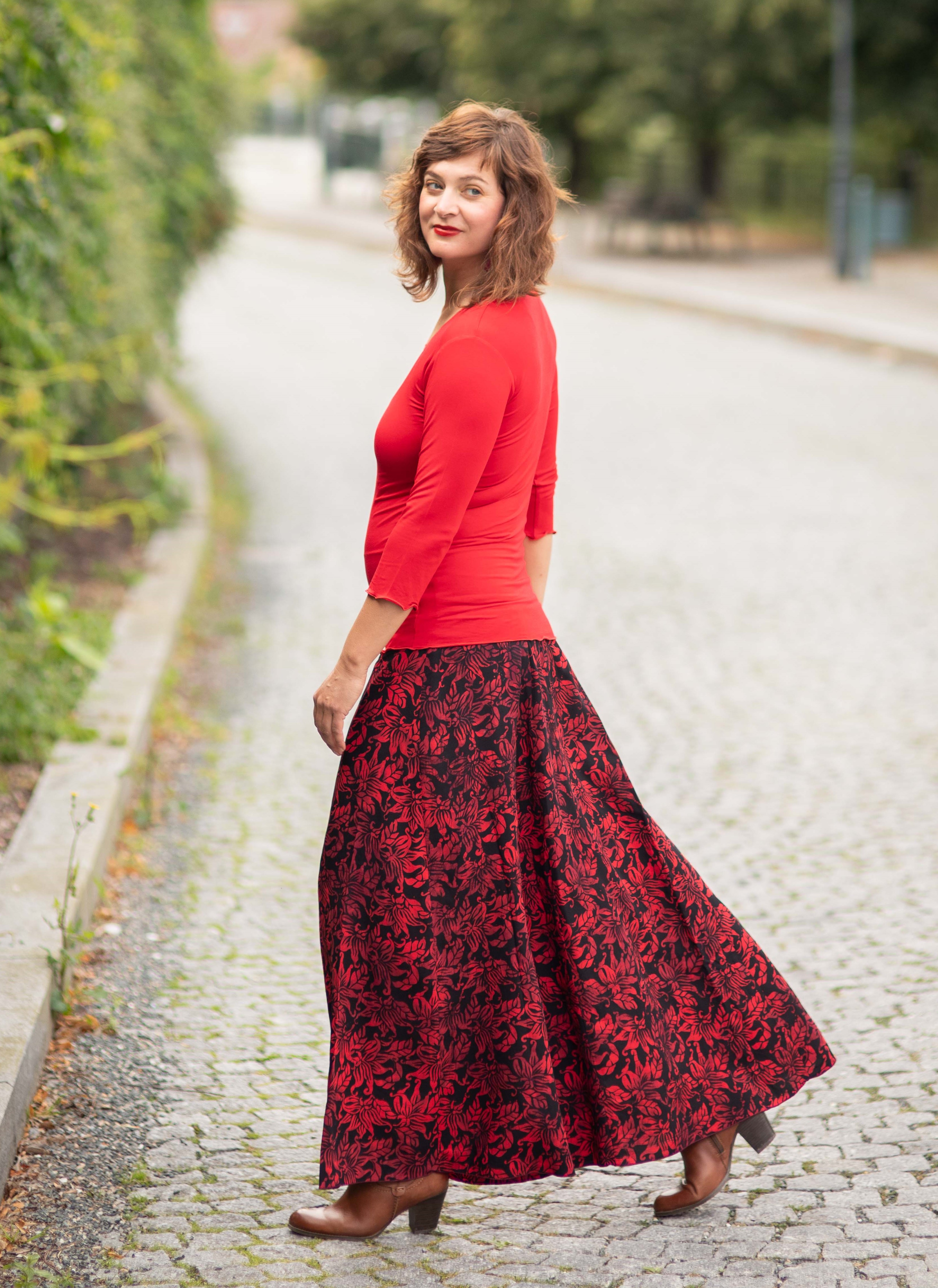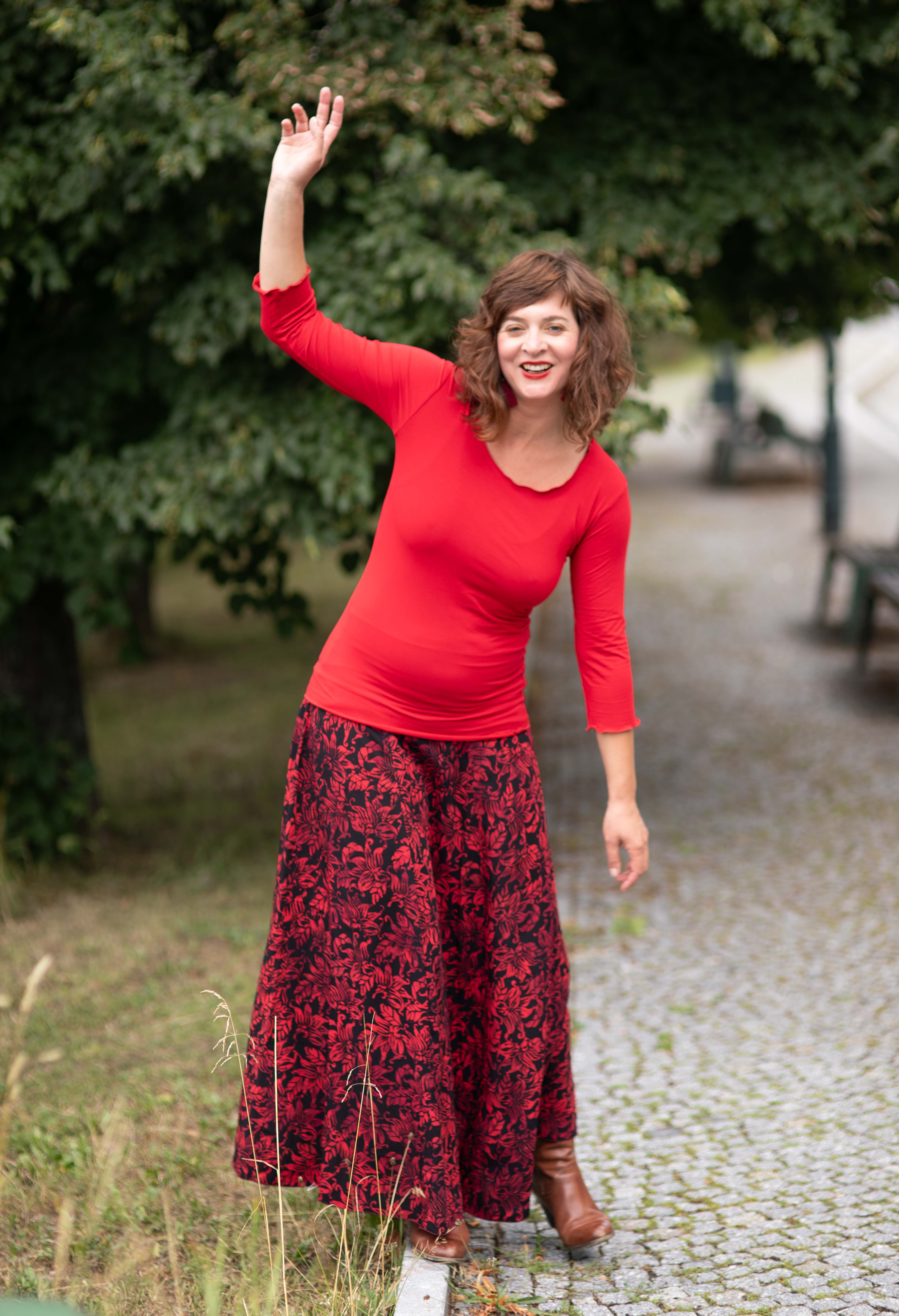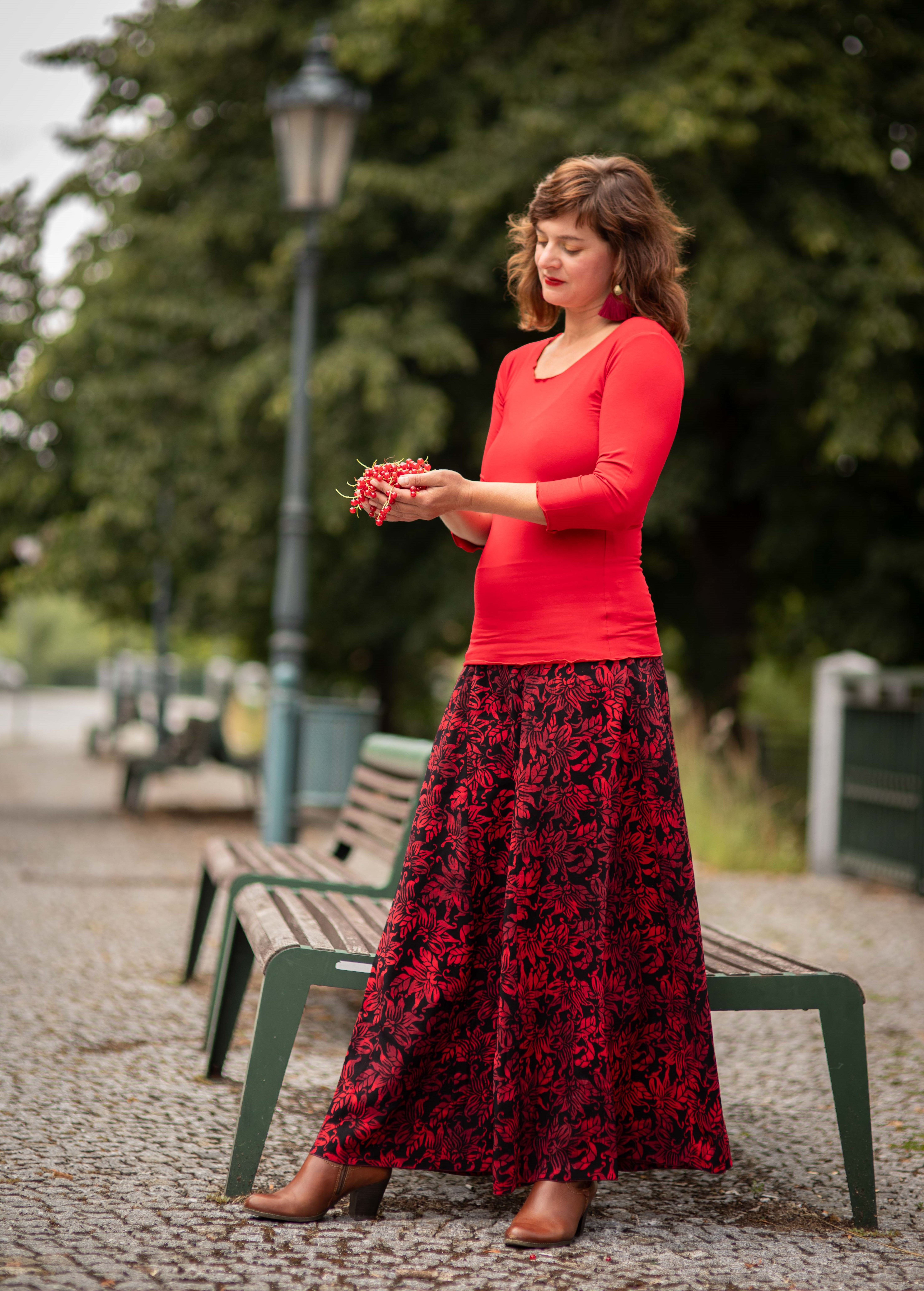 Barva sukně: černá barva s květinovým vzorem v červené.