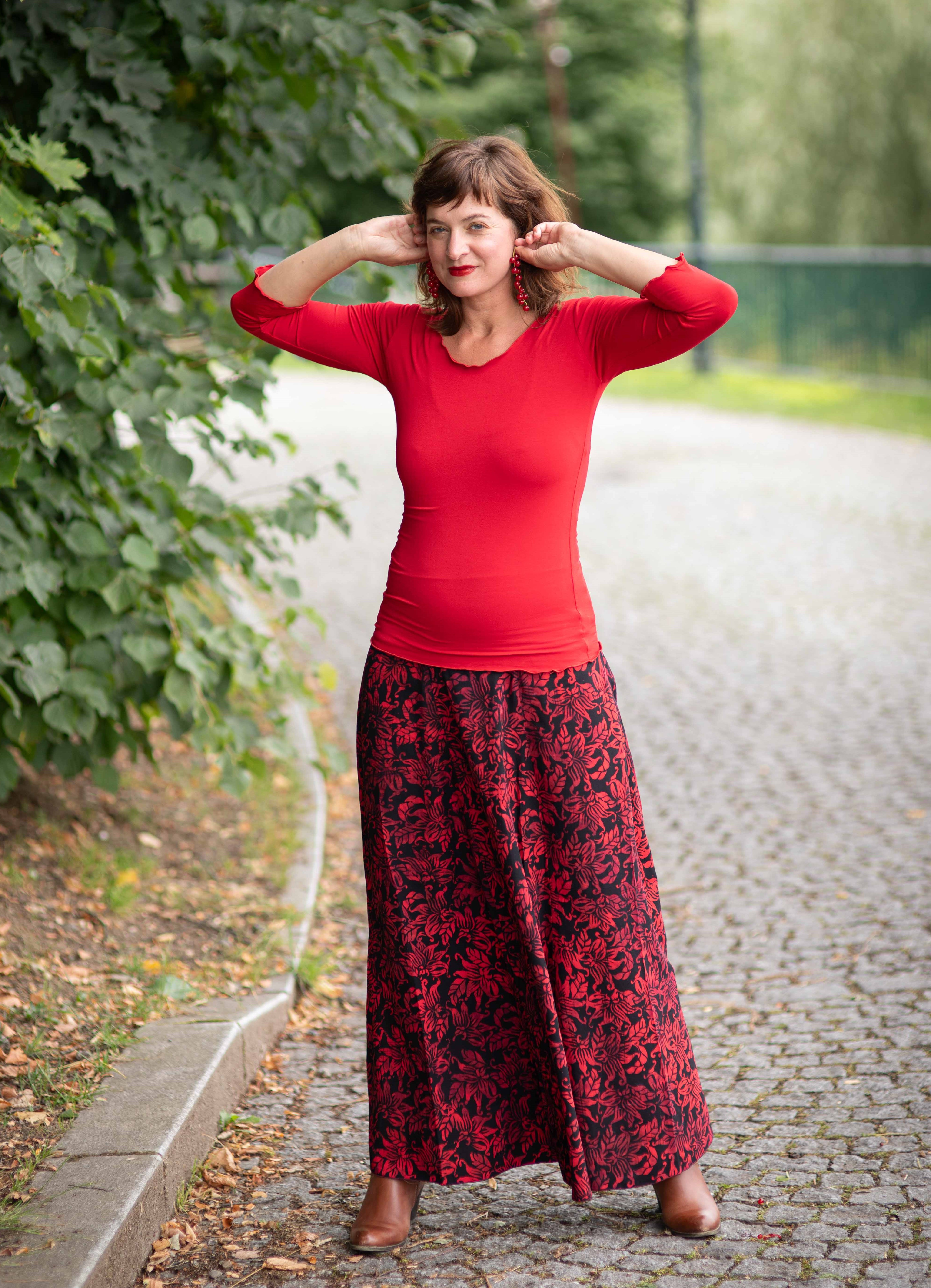Vysoký elastický pas je nesmírně pohodlný na nošení. Sukně je vhodná i pro těhotné, pružný náplet v pase se krásně přizpůsobí bříšku a obejme ho po celém jeho obvodu. Ikonická Pacha sukně s délkou až na zem se krásně vlní při chůzi a vytváří ženskou siluetu.