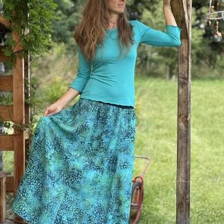 Připravte se na to, že touto úchvatnou, dlouhou sukní přitáhnete pozornost! Sukně je ušitá z lehké viskózové látky a pyšní se nádherným batikovým vzorem.