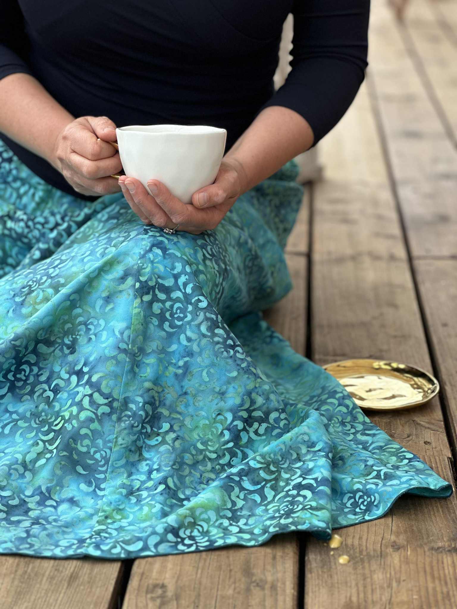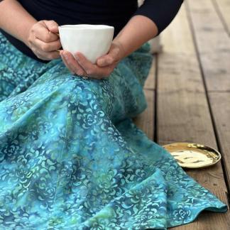 Vysoký elastický pas je nesmírně pohodlný na nošení. Sukně je vhodná i pro těhotné, pružný náplet v pase se krásně přizpůsobí bříšku a obejme ho po celém jeho obvodu. Ikonická Pacha sukně s délkou až na zem se krásně vlní při chůzi a vytváří ženskou siluetu.