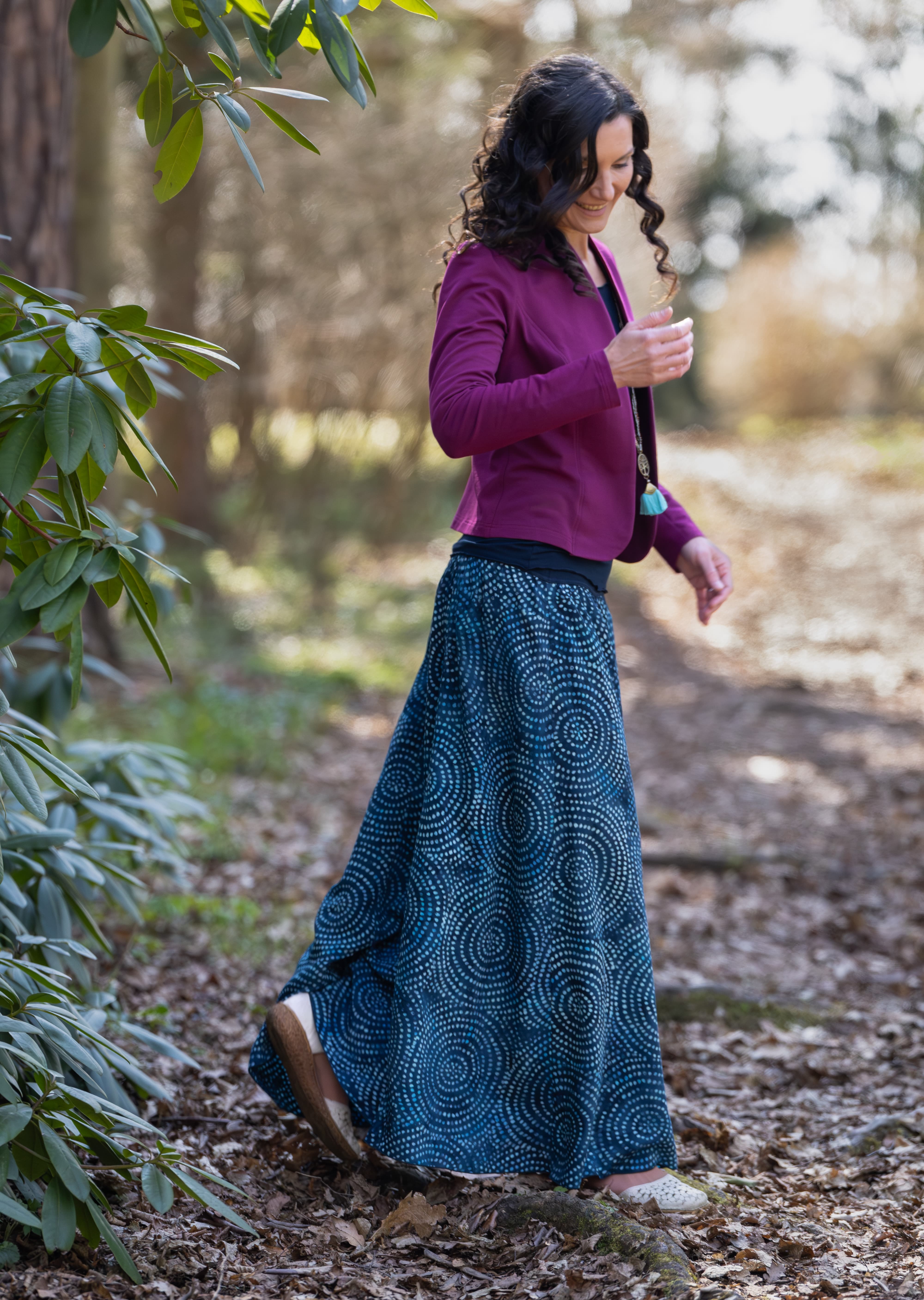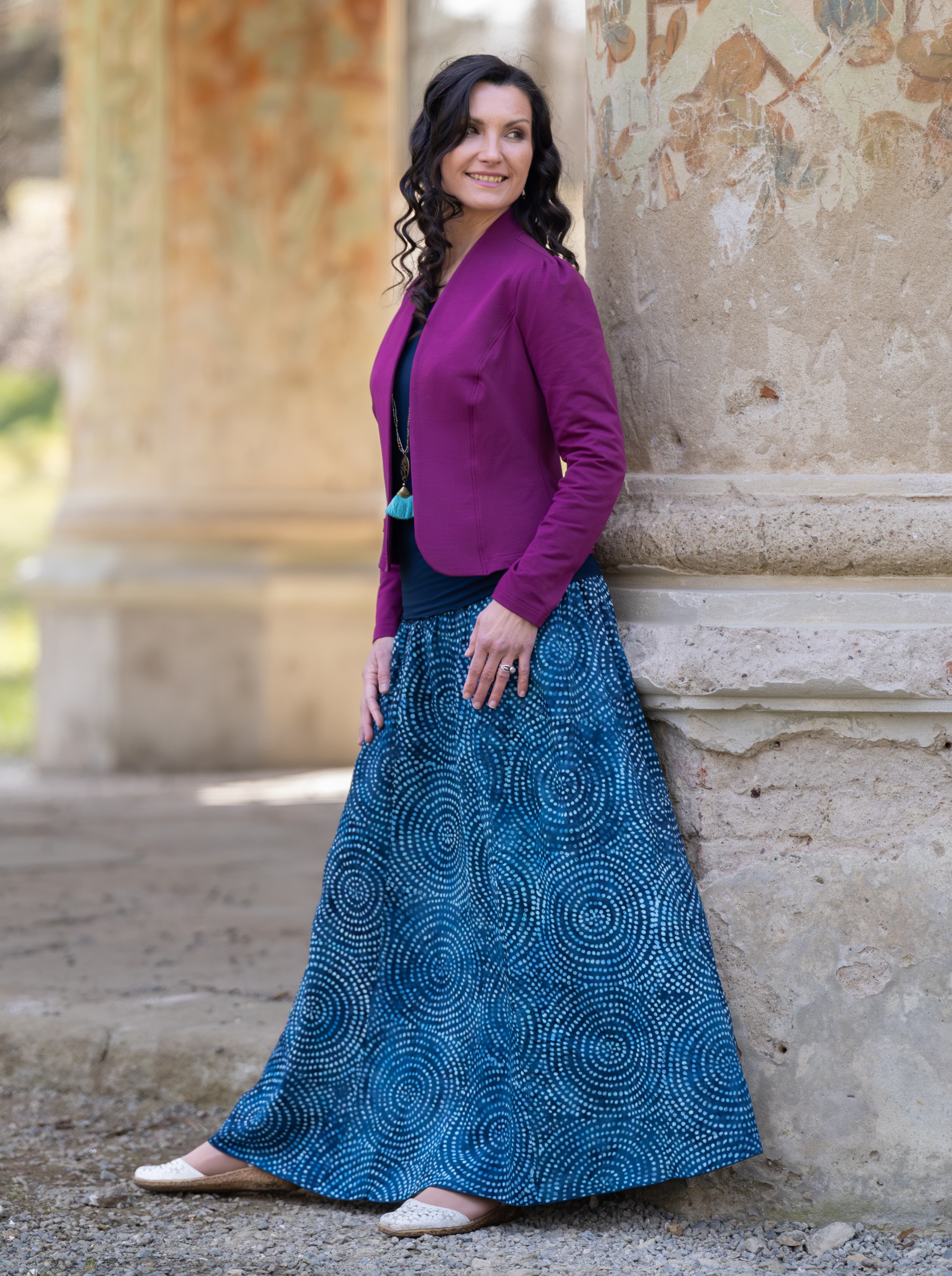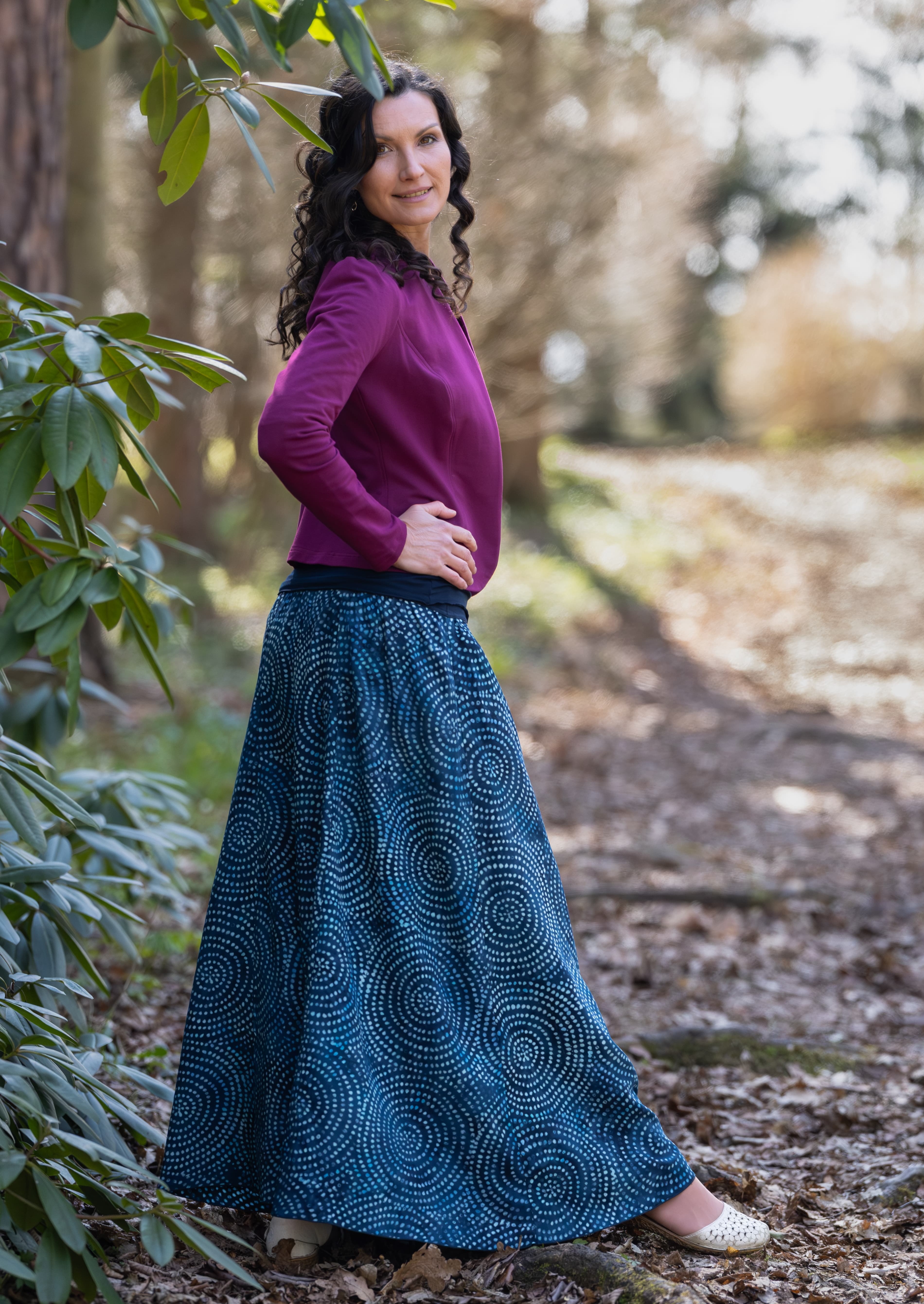Vysoký elastický pas je nesmírně pohodlný na nošení. Sukně je vhodná i pro těhotné, pružný náplet v pase se krásně přizpůsobí bříšku a obejme ho po celém jeho obvodu. Ikonická Pacha sukně s délkou až na zem se krásně vlní při chůzi a vytváří ženskou siluetu.