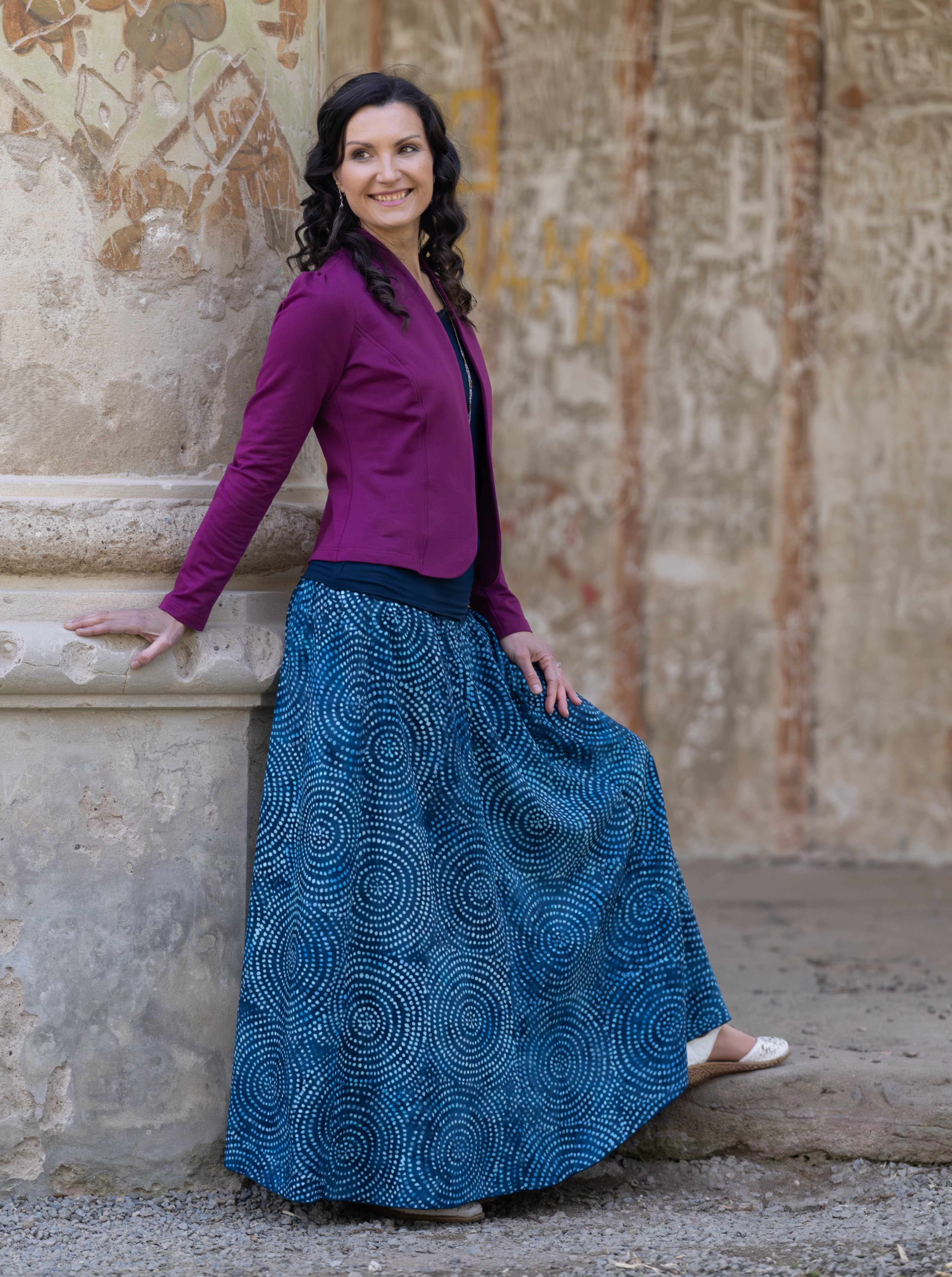 Připravte se na to, že touto úchvatnou, dlouhou sukní přitáhnete pozornost! Sukně je ušitá z lehké viskózové látky a pyšní se nádherným batikovým vzorem.