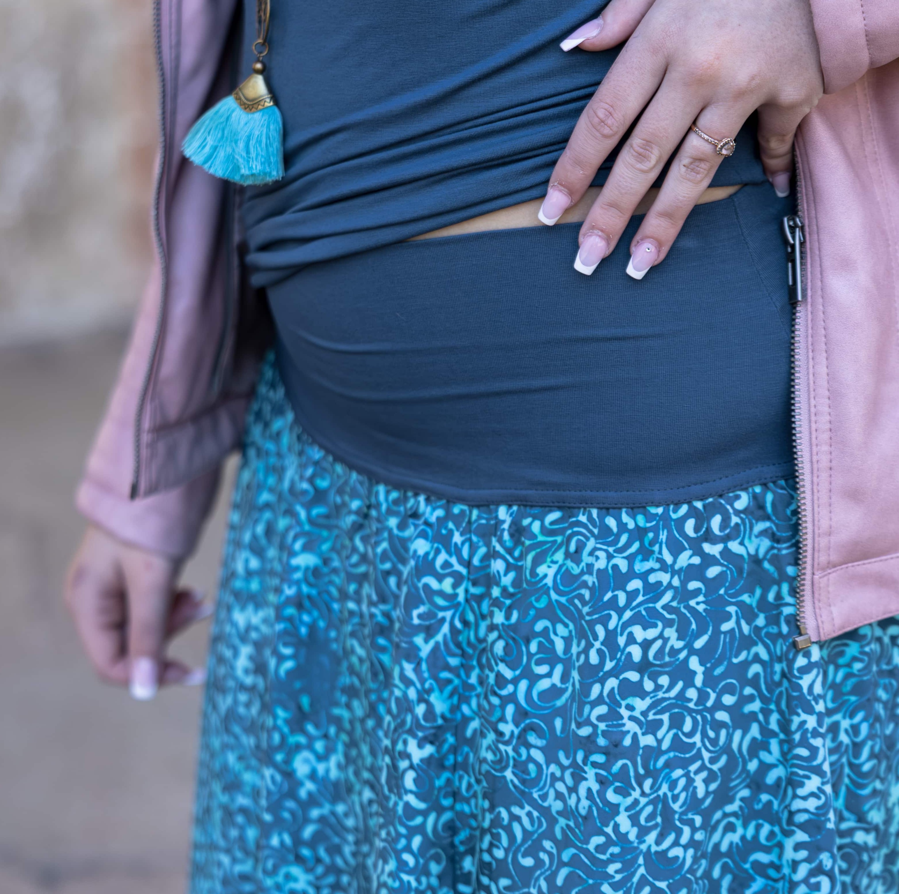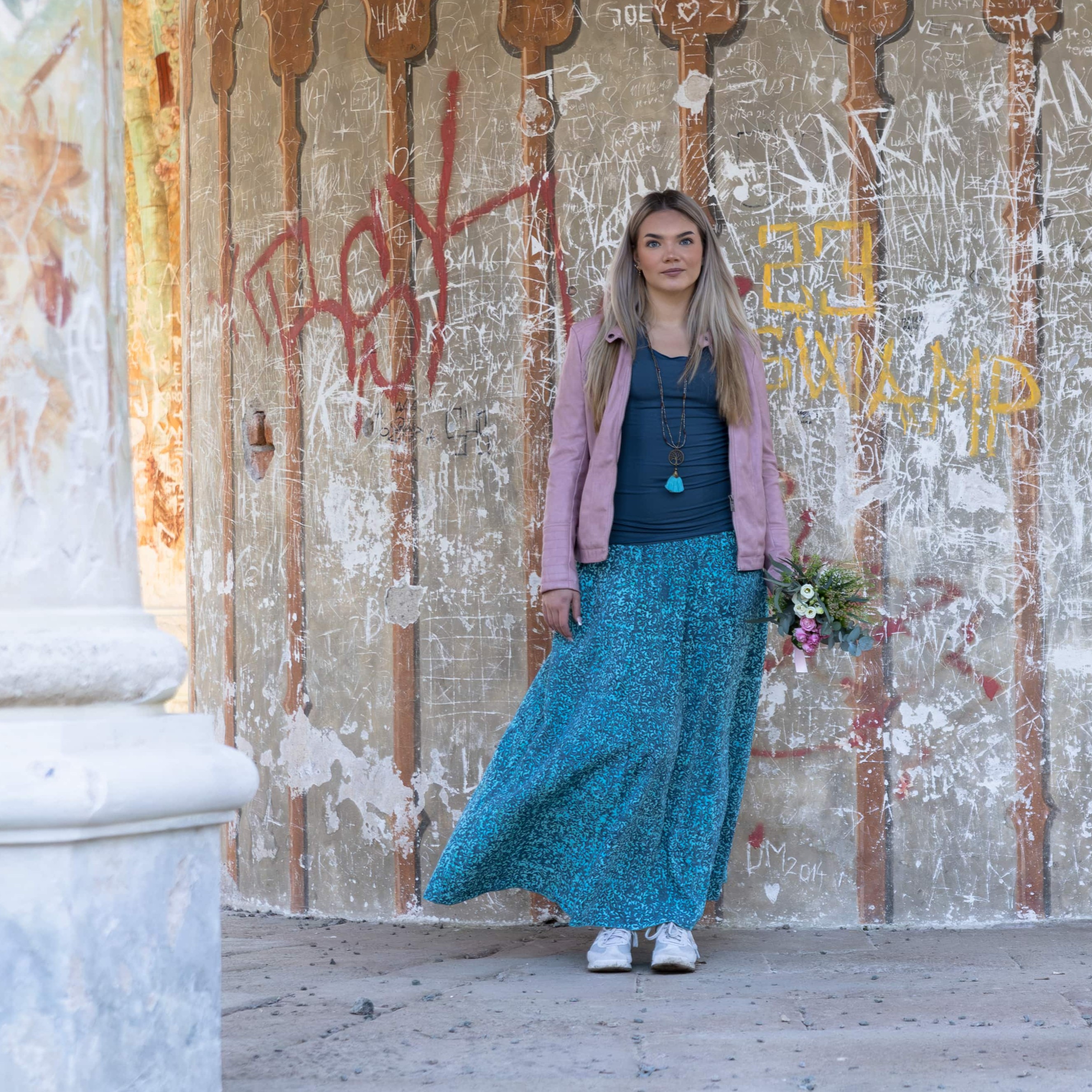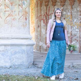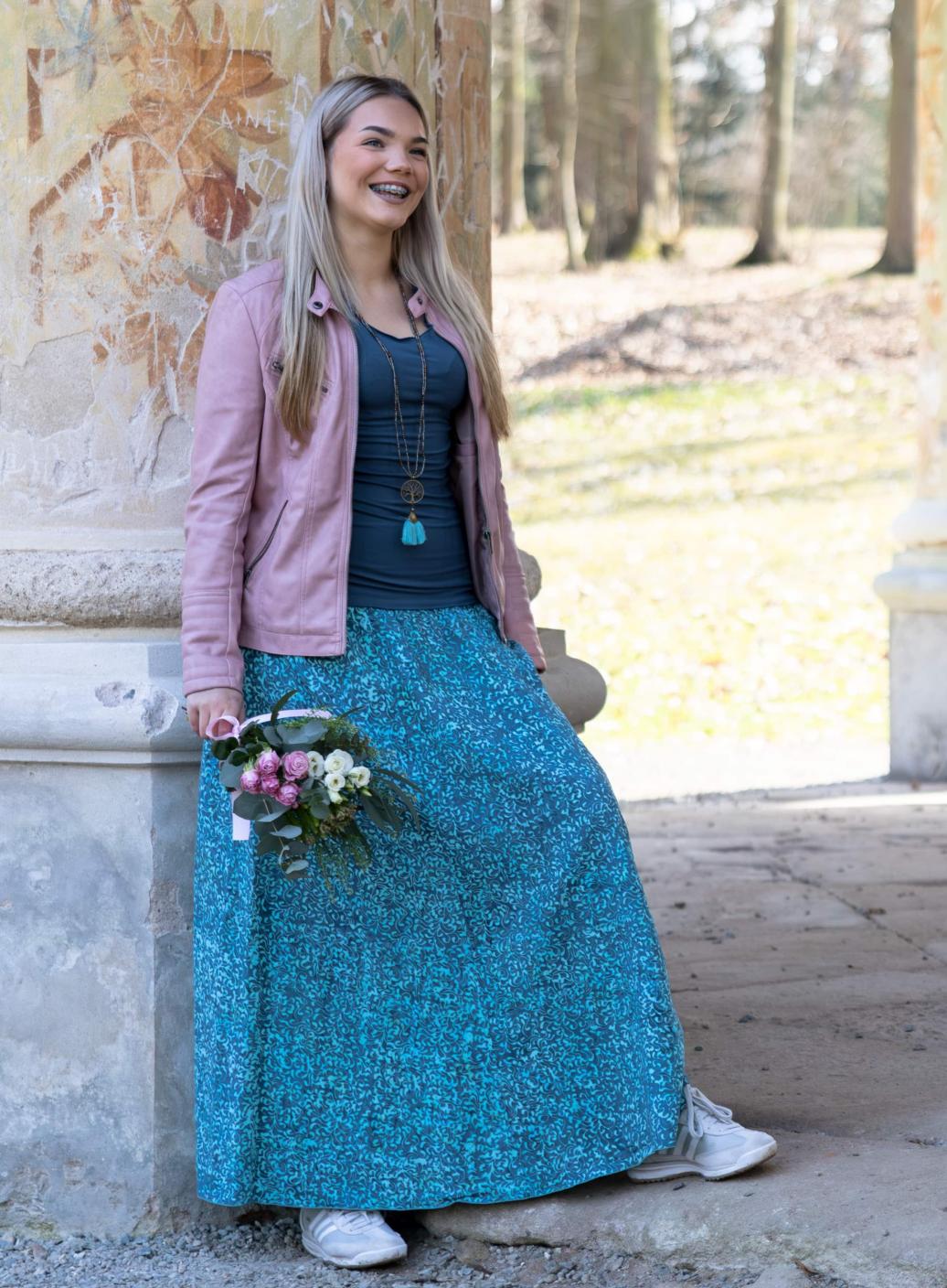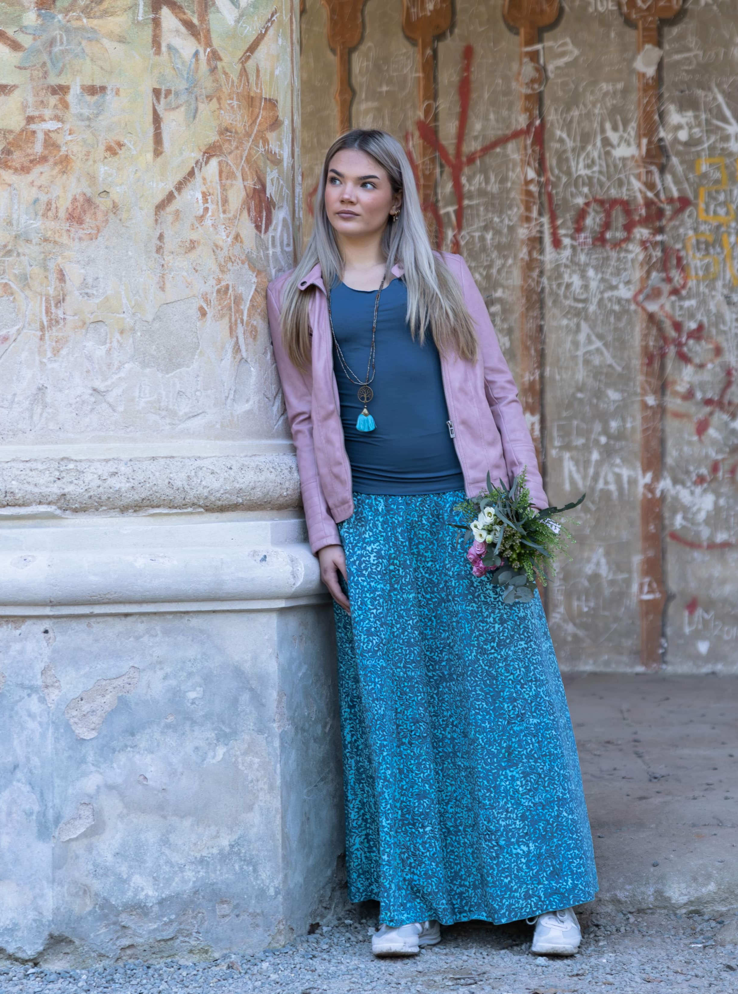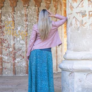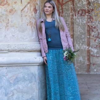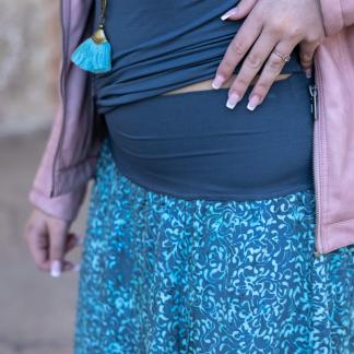 Vysoký elastický pas je nesmírně pohodlný na nošení. Sukně je vhodná i pro těhotné, pružný náplet v pase se krásně přizpůsobí bříšku a obejme ho po celém jeho obvodu. Ikonická Pacha sukně s délkou až na zem se krásně vlní při chůzi a vytváří ženskou siluetu.