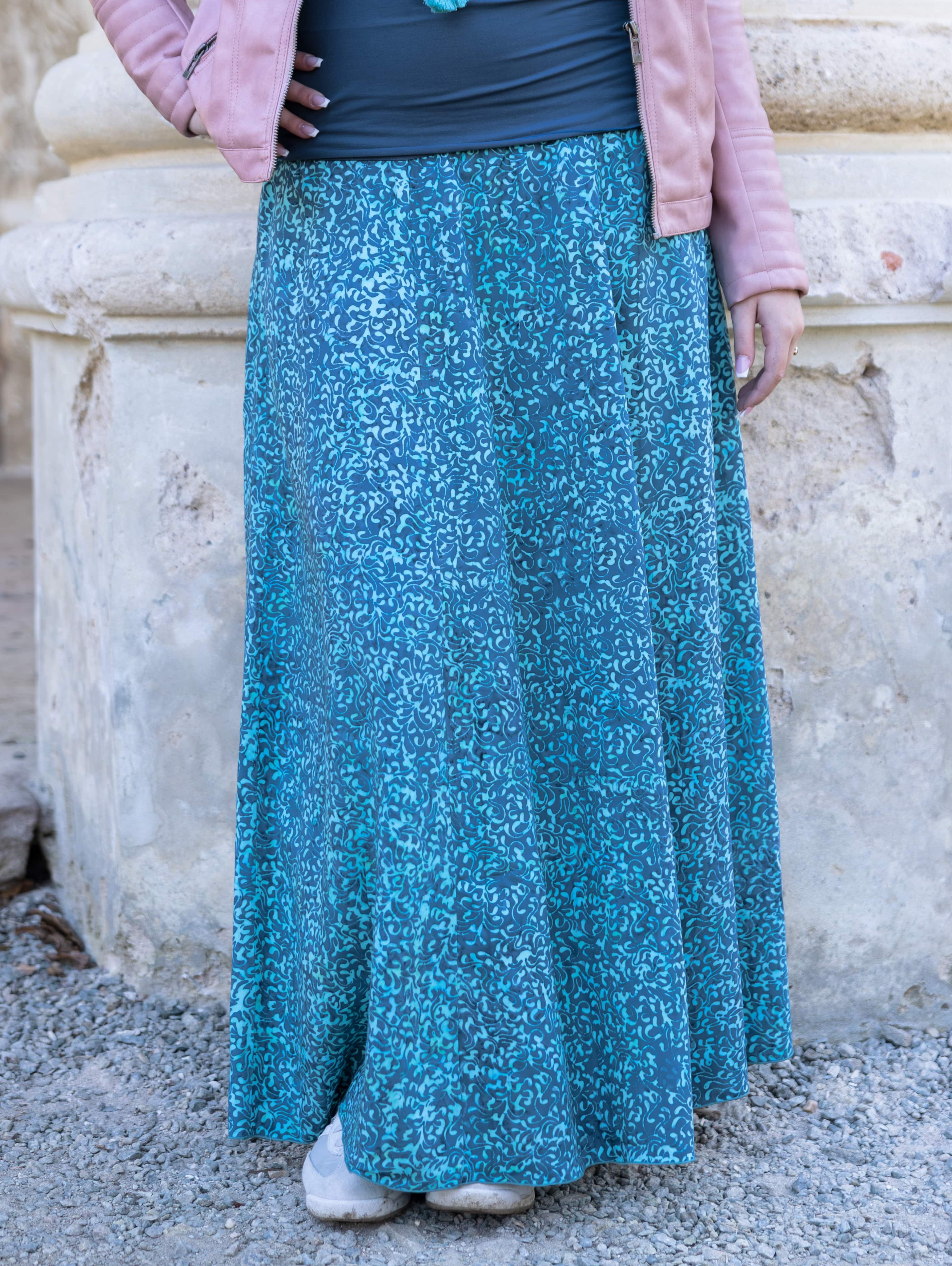 Připravte se na to, že touto úchvatnou, dlouhou sukní přitáhnete pozornost! Sukně je ušitá z lehké viskózové látky a pyšní se nádherným batikovým vzorem.