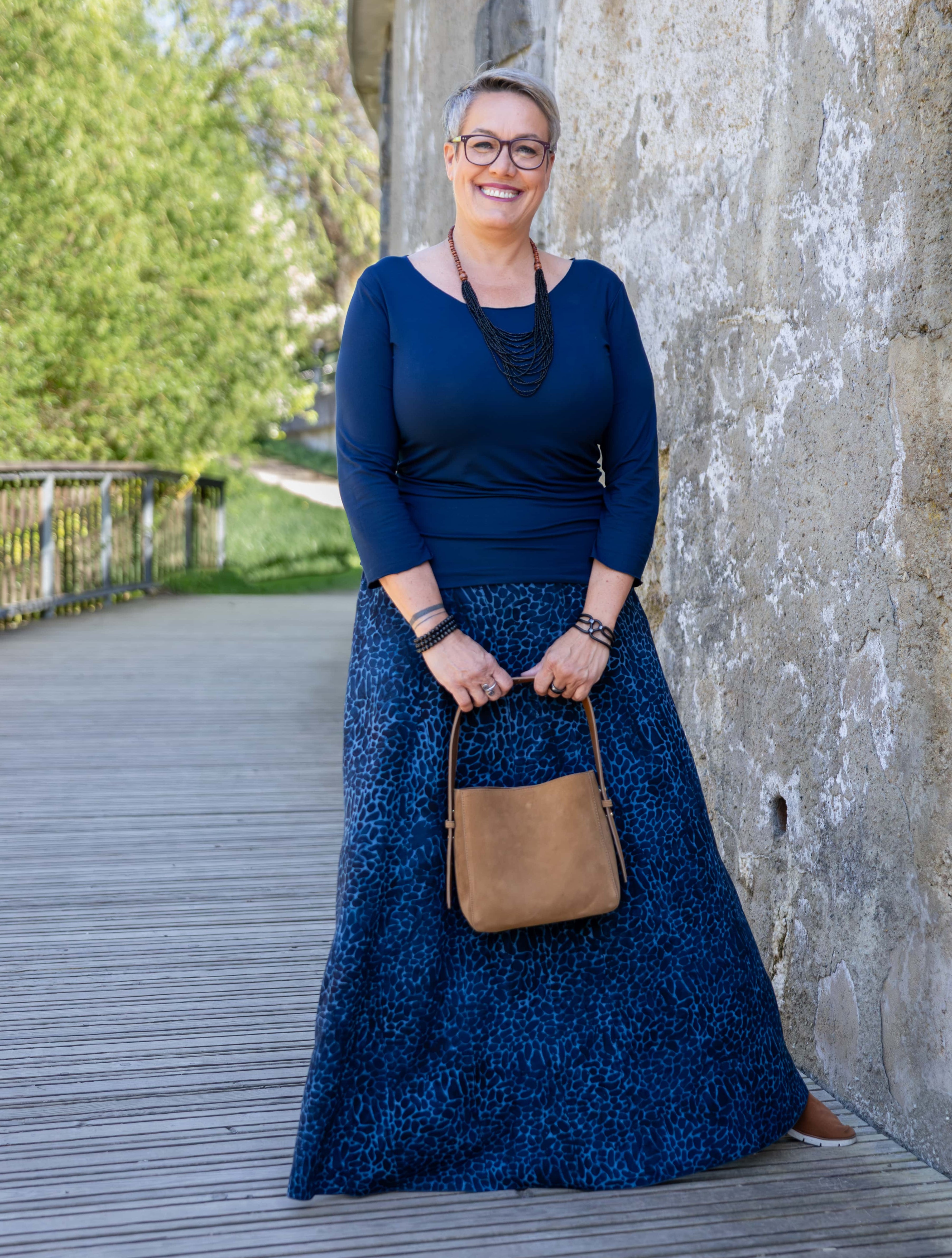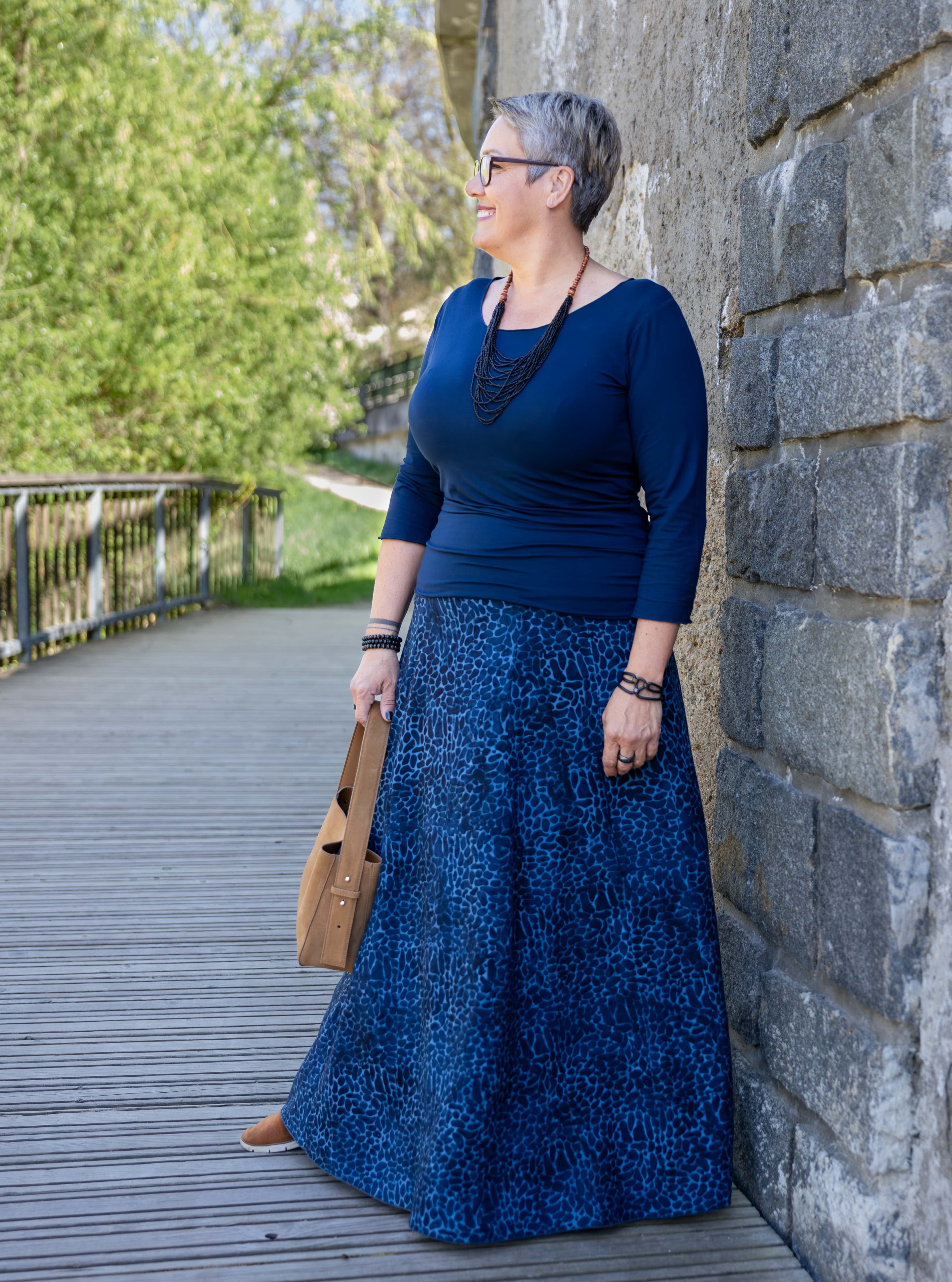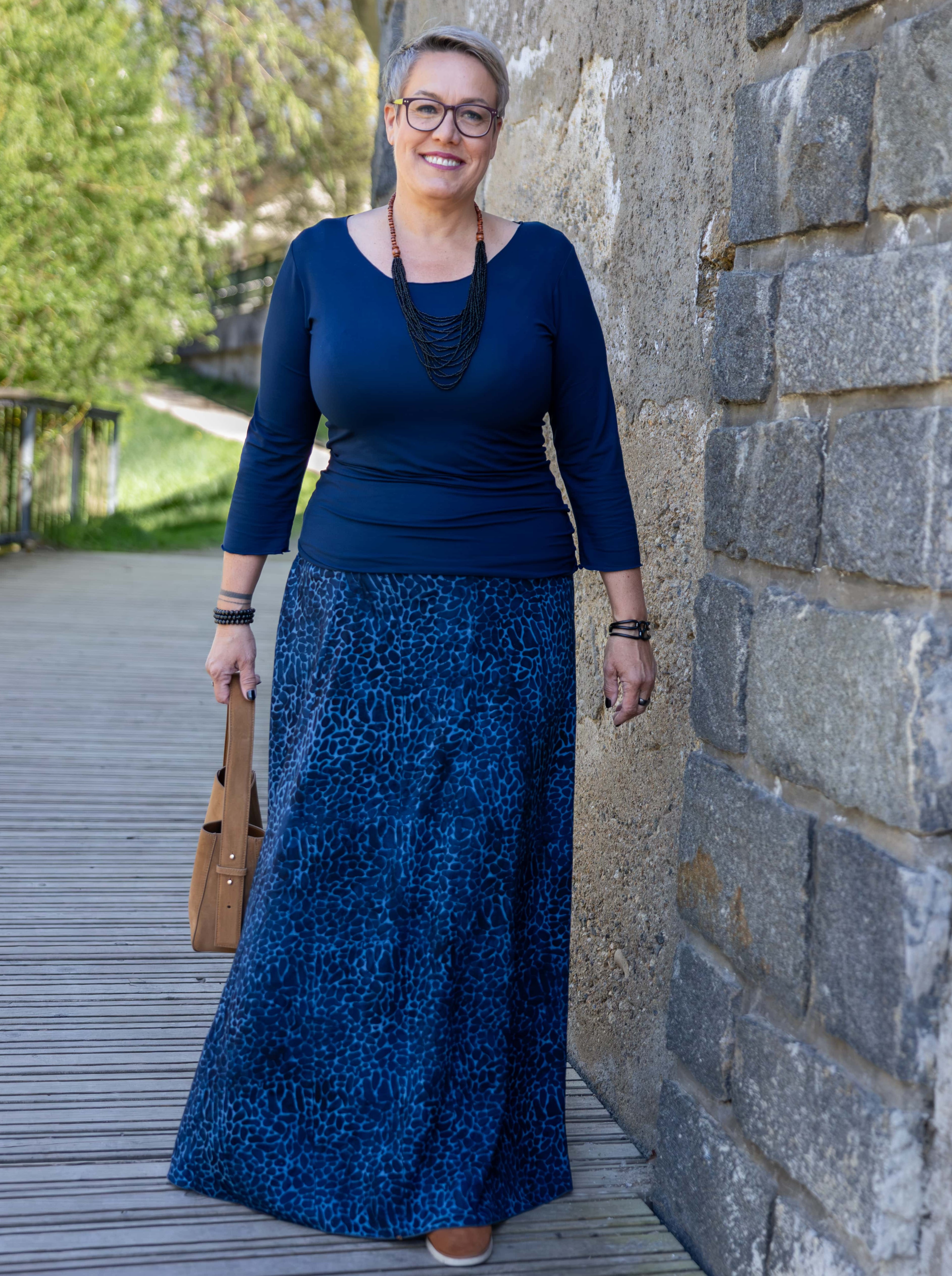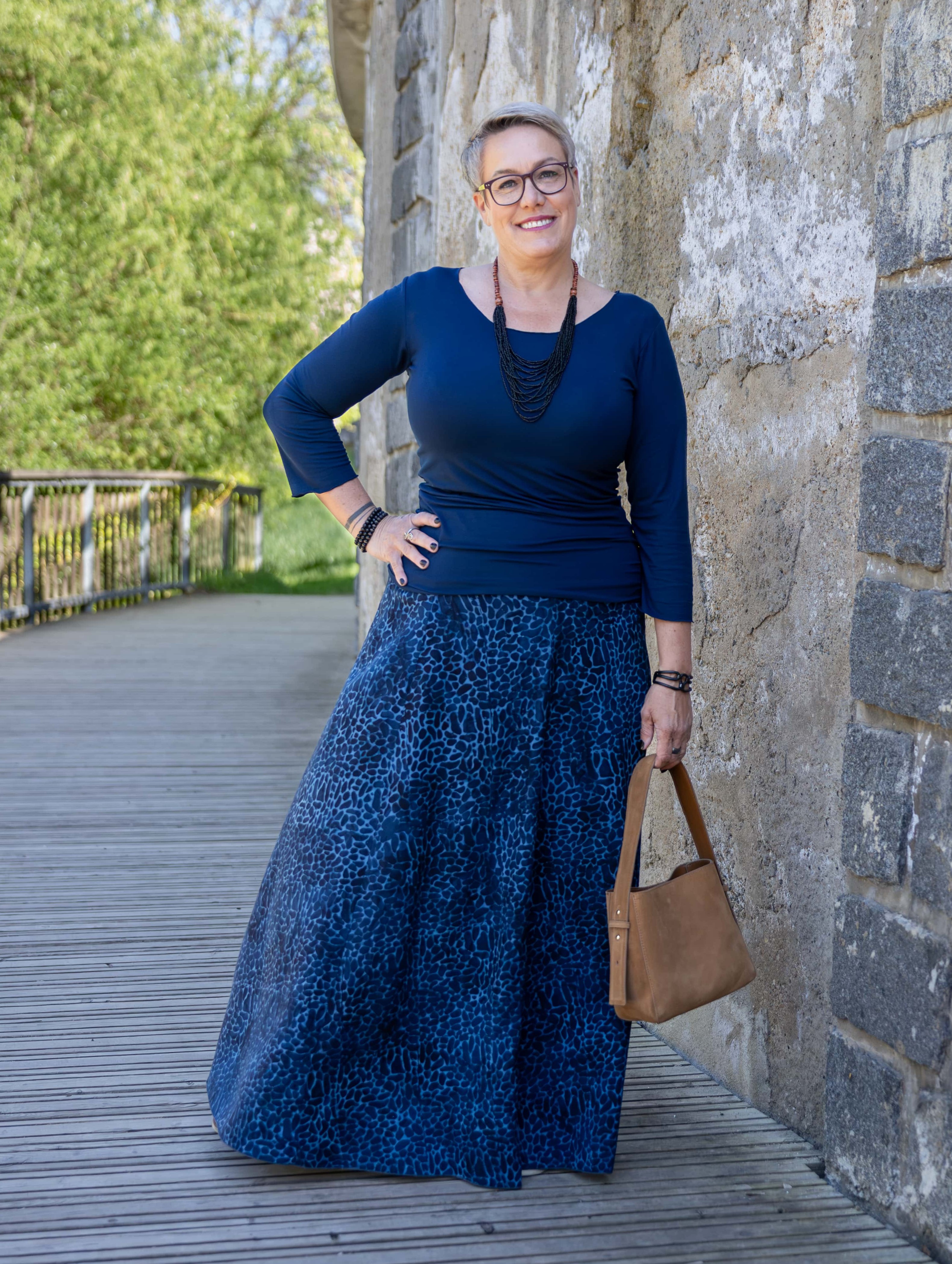 Barva sukně: tmavě modrá se vzorem tón v tónu