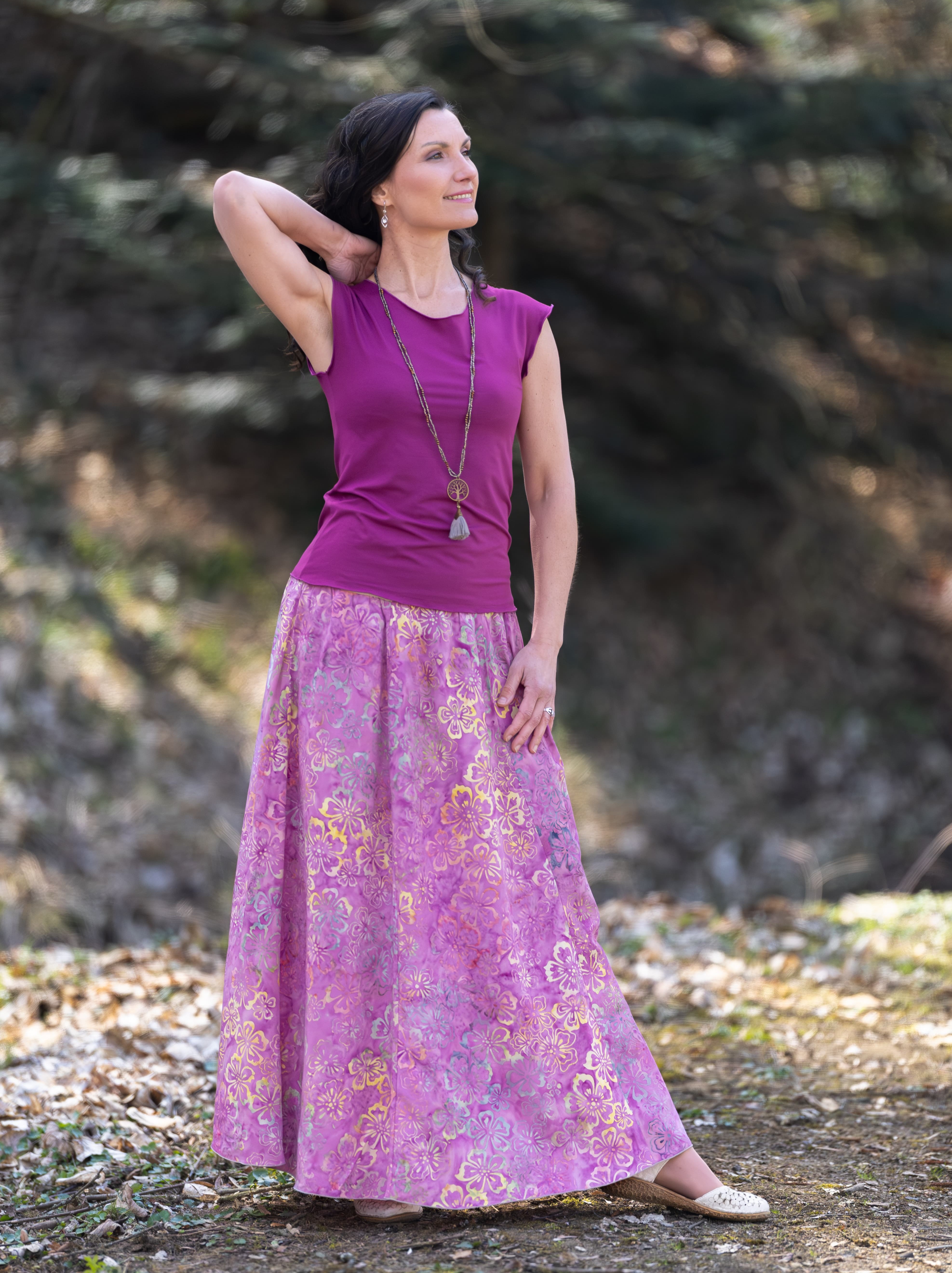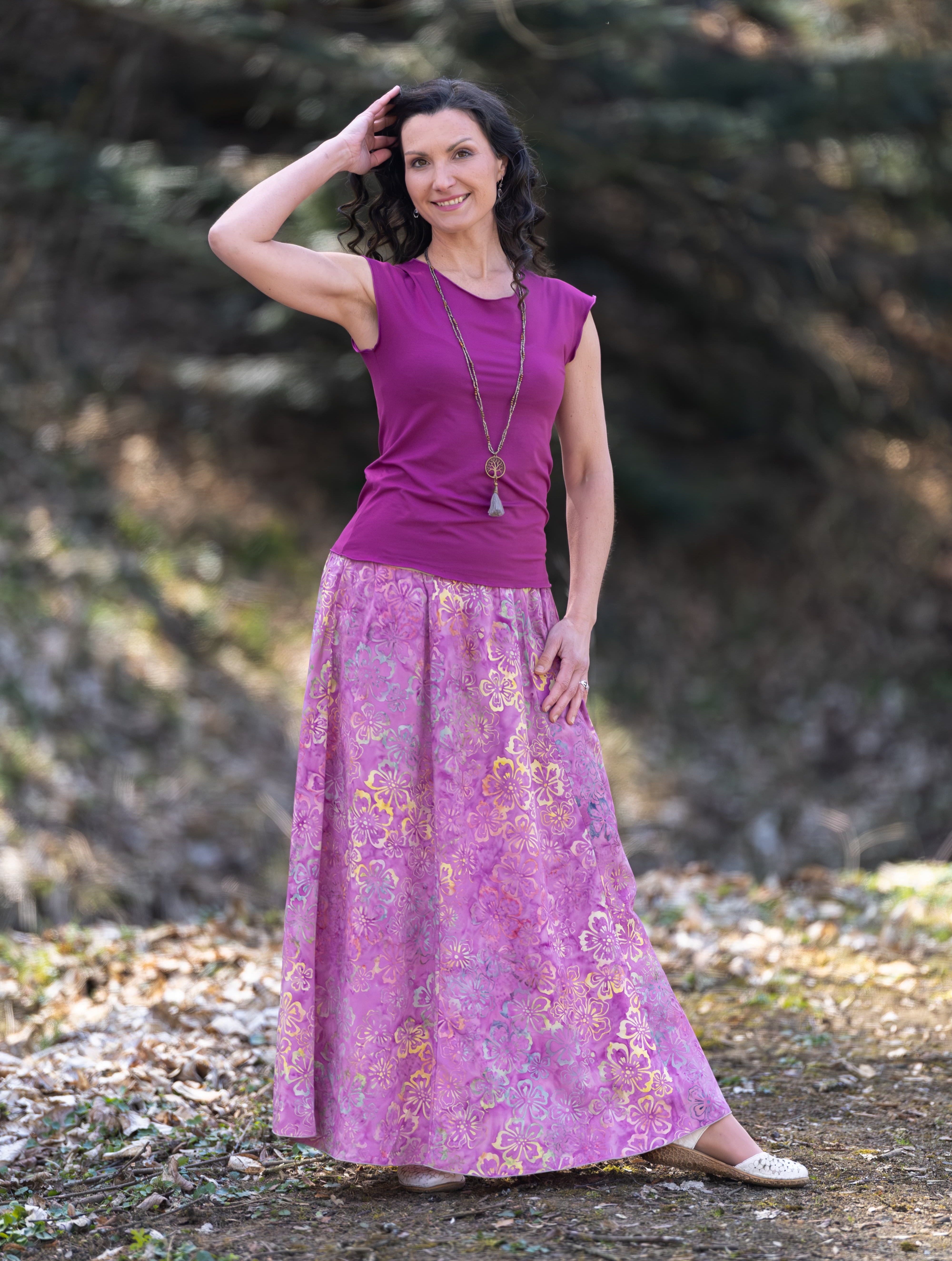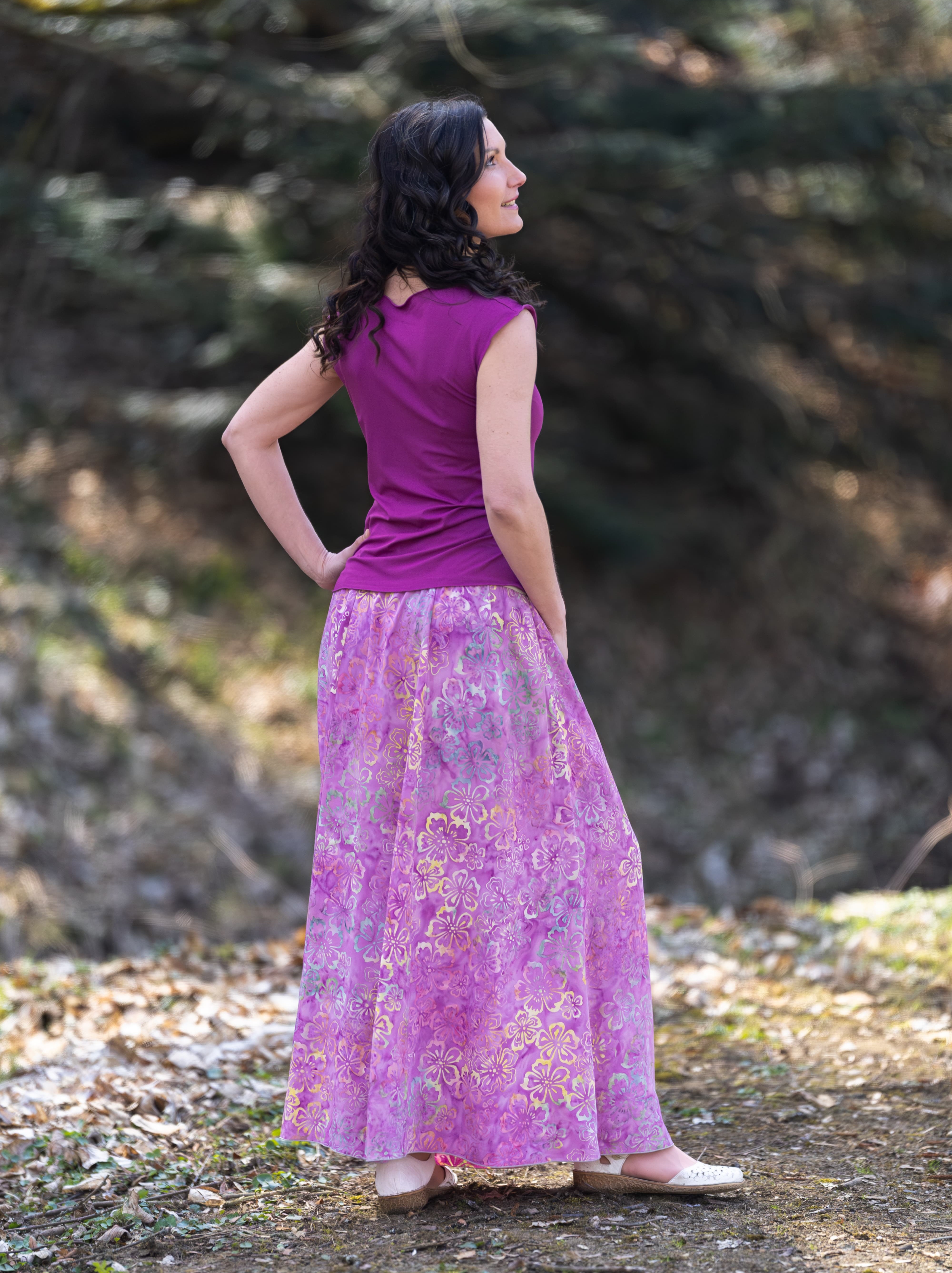 Připravte se na to, že touto úchvatnou, dlouhou sukní přitáhnete pozornost! Sukně je ušitá z lehké viskózové látky a pyšní se nádherným batikovým vzorem.