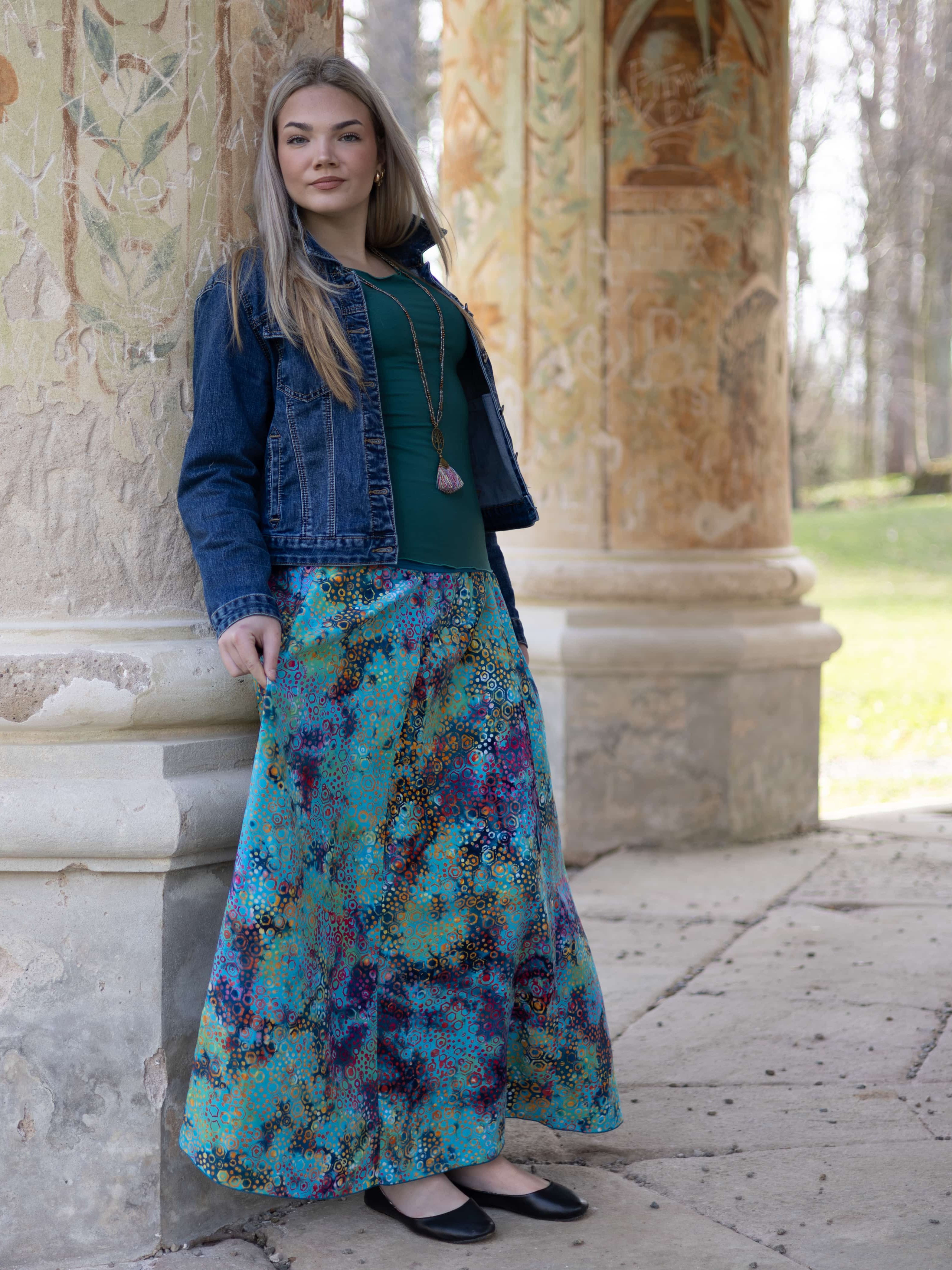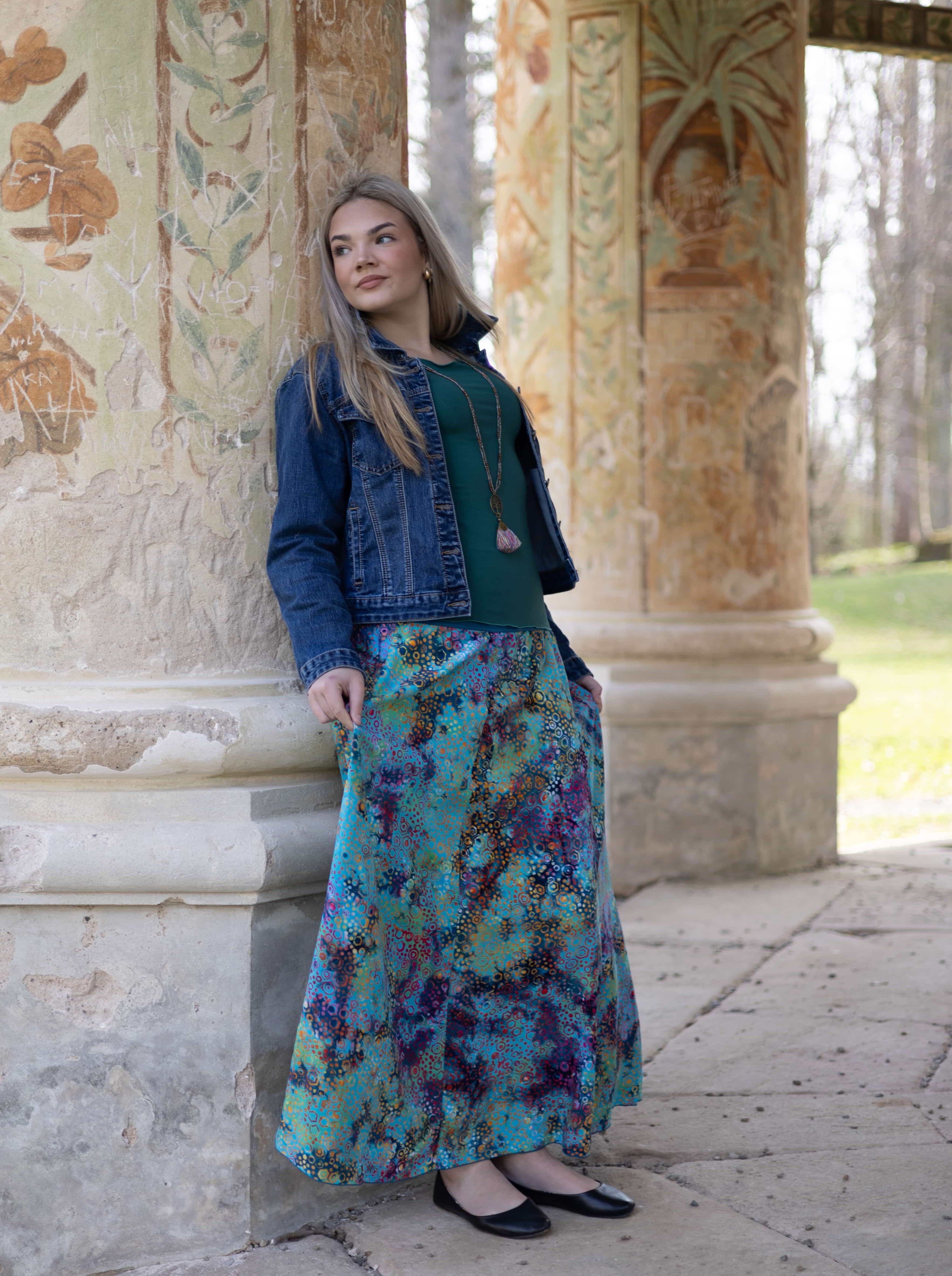 Připravte se na to, že touto úchvatnou, dlouhou sukní přitáhnete pozornost! Sukně je ušitá z lehké viskózové látky a pyšní se nádherným batikovým vzorem.