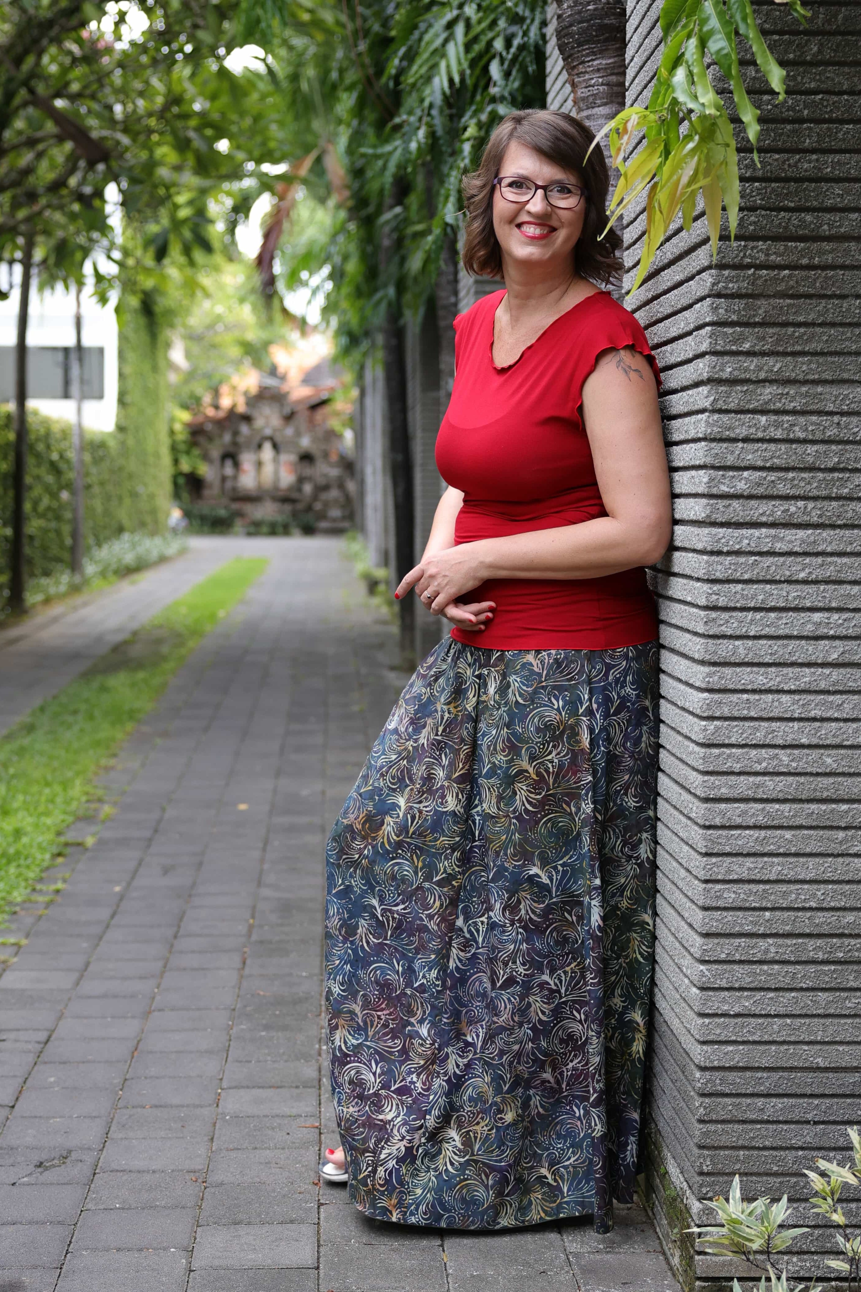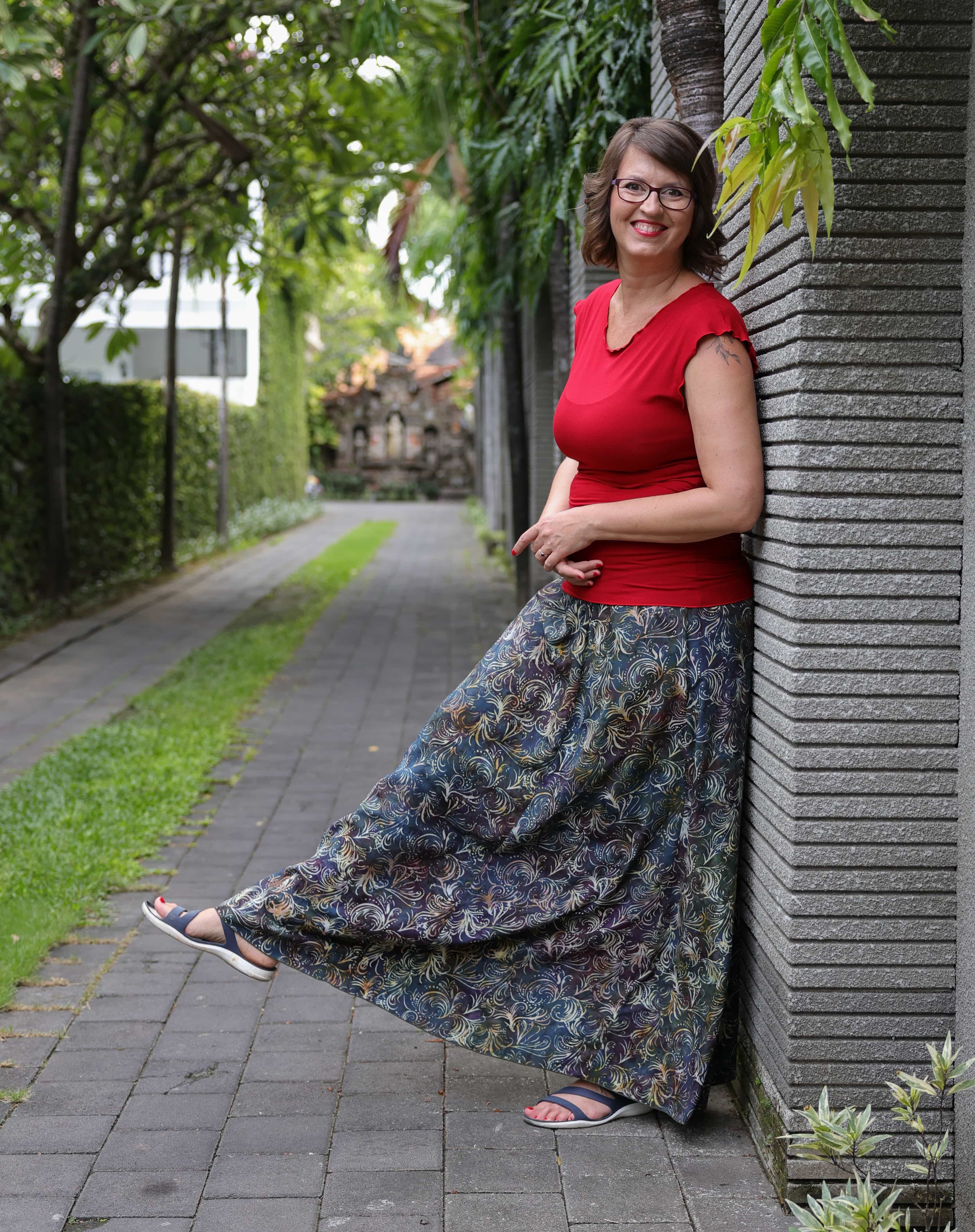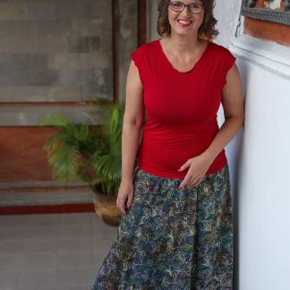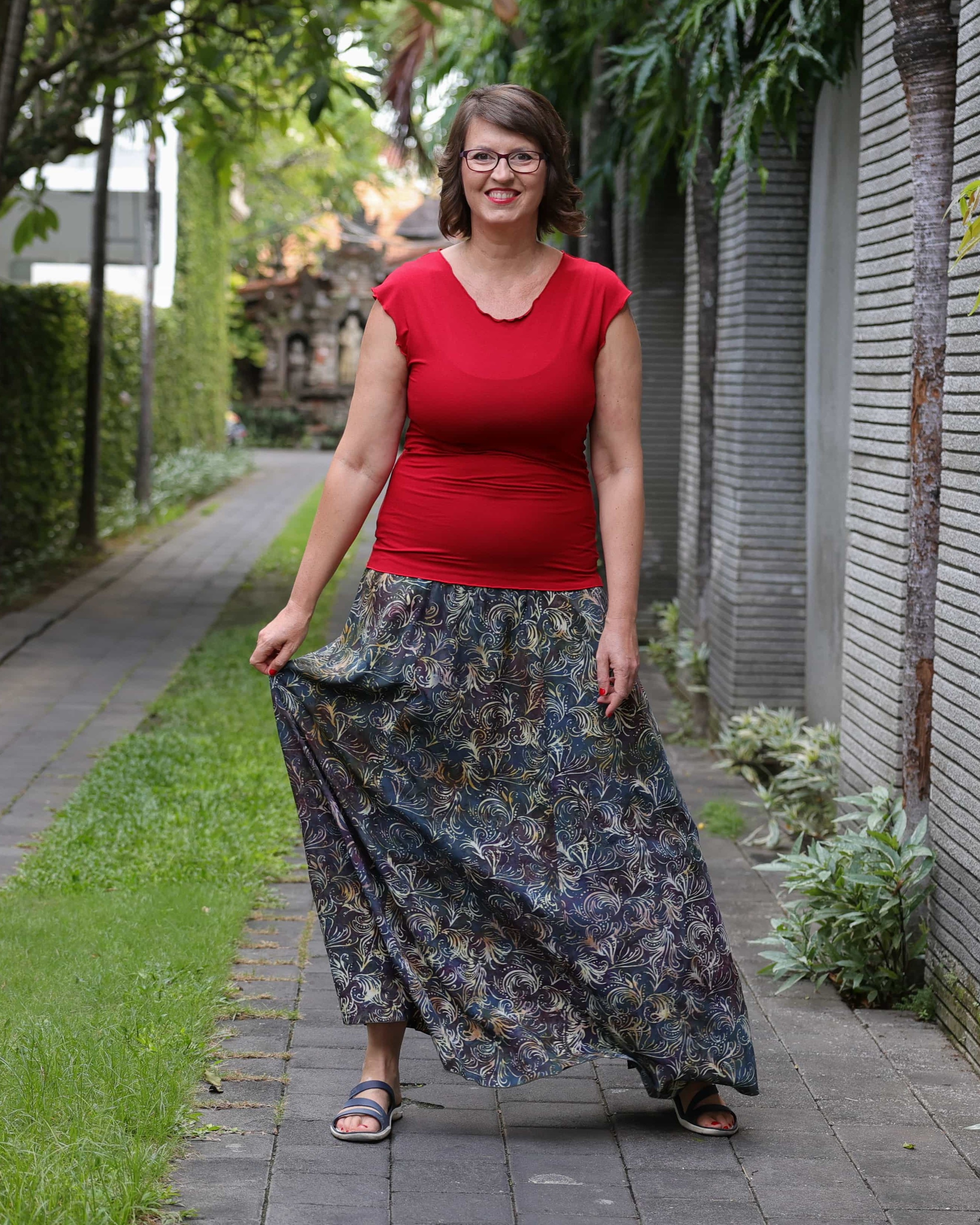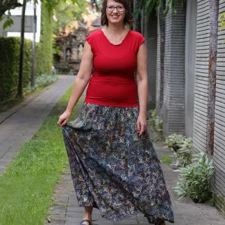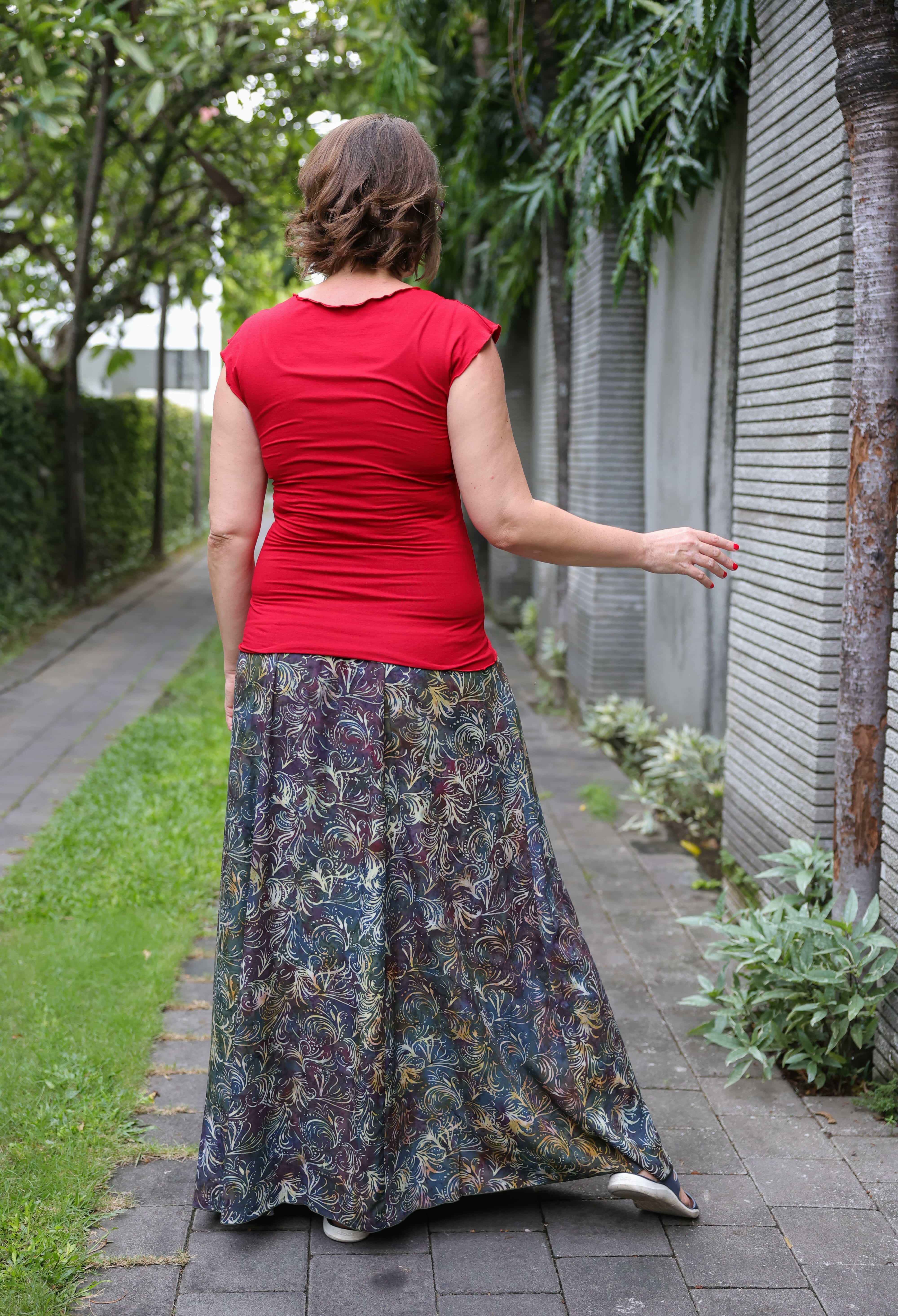 Připravte se na to, že touto úchvatnou, dlouhou sukní přitáhnete pozornost! Sukně je ušitá z lehké viskózové látky a pyšní se nádherným batikovým vzorem.
