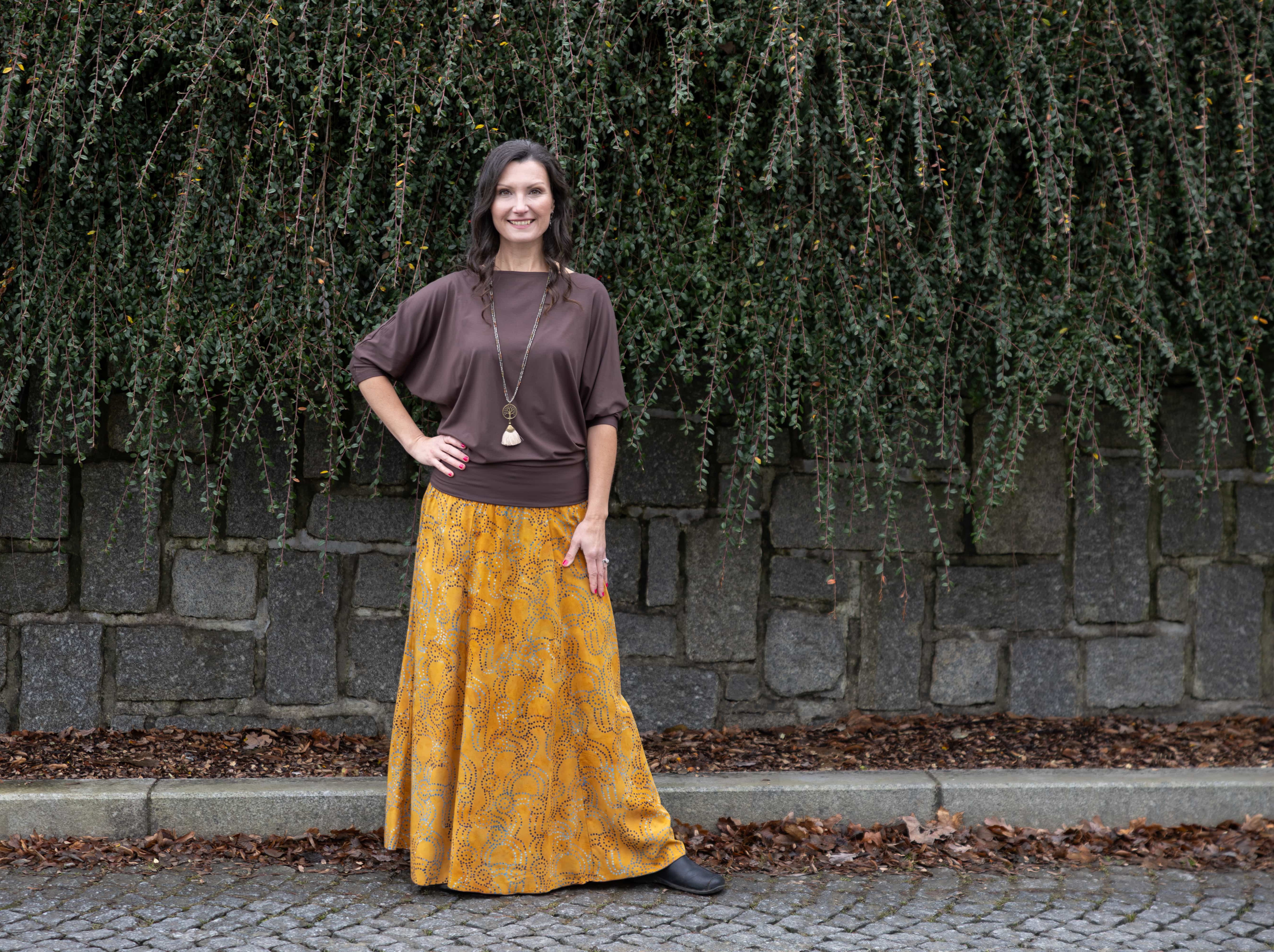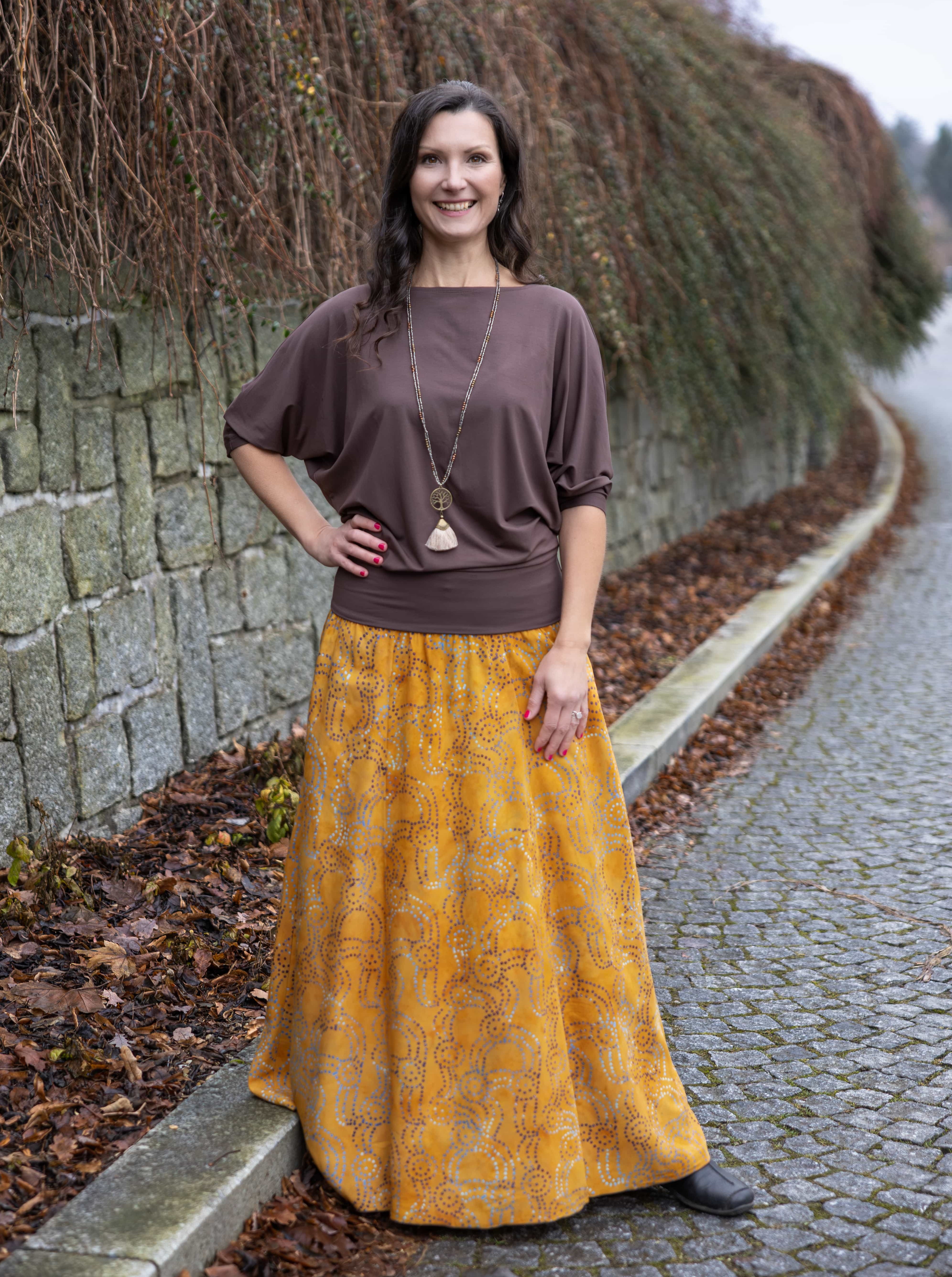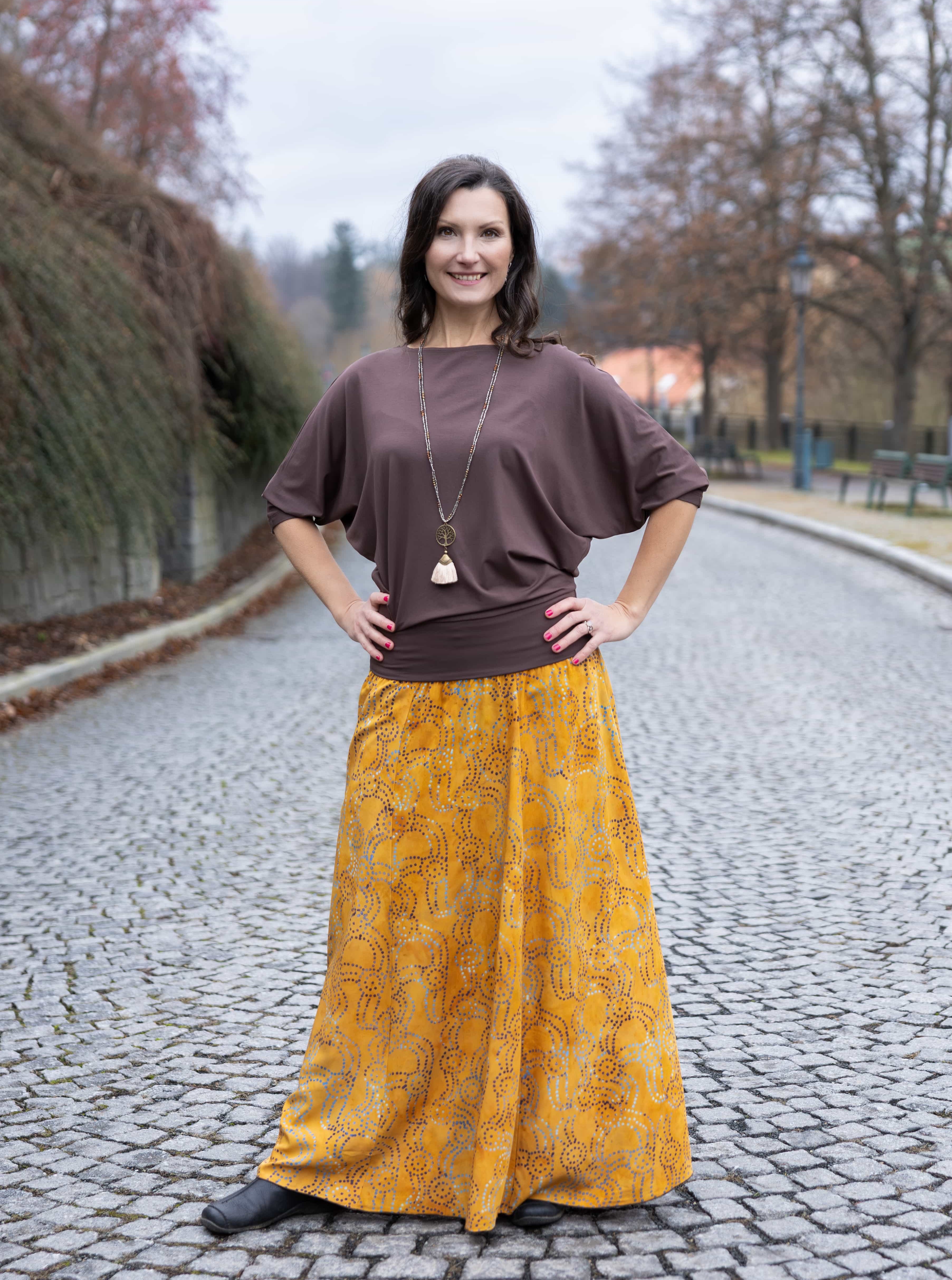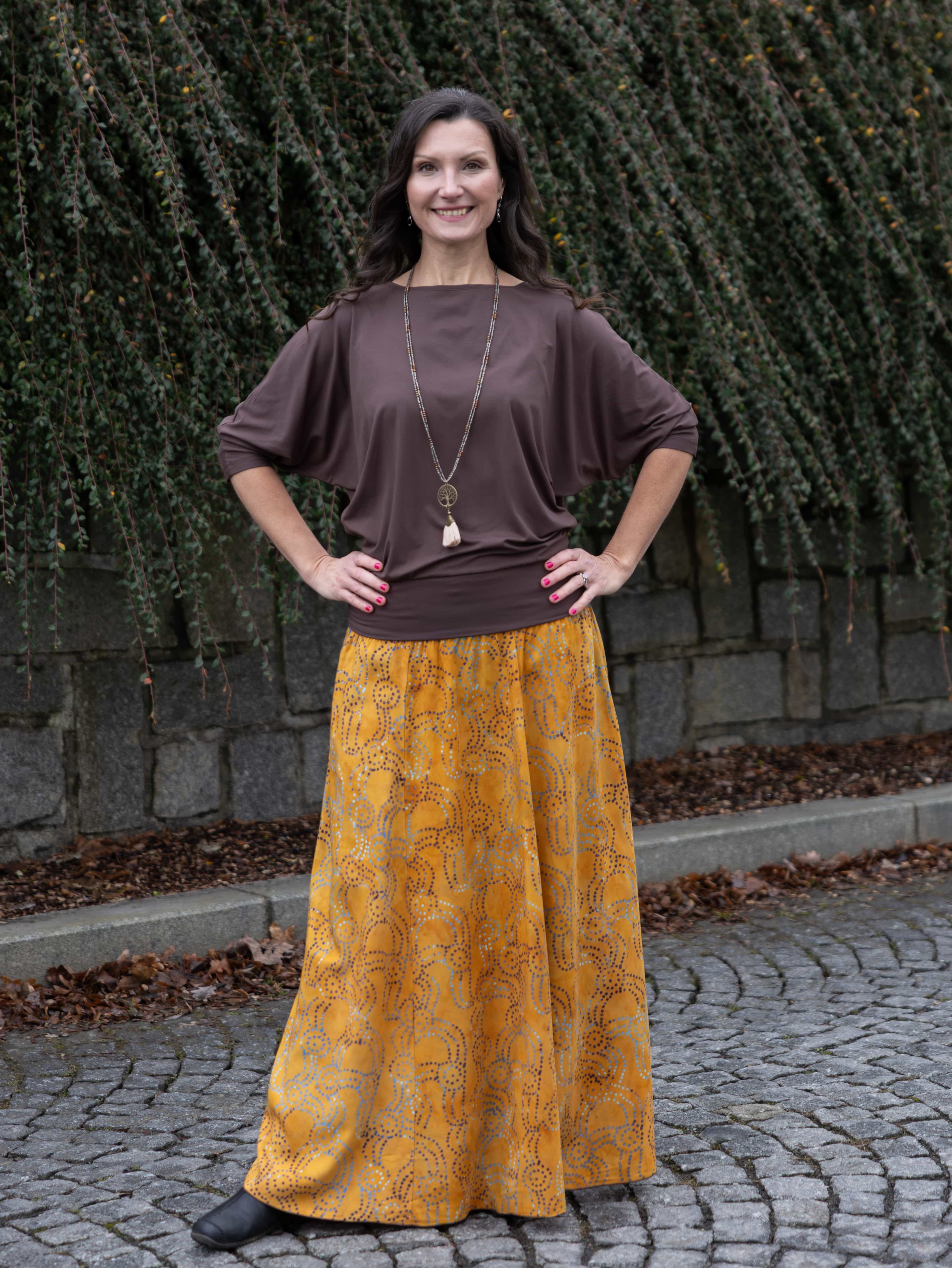Barva sukně: okrová s tečkovaným vzorem v modré a hnědé