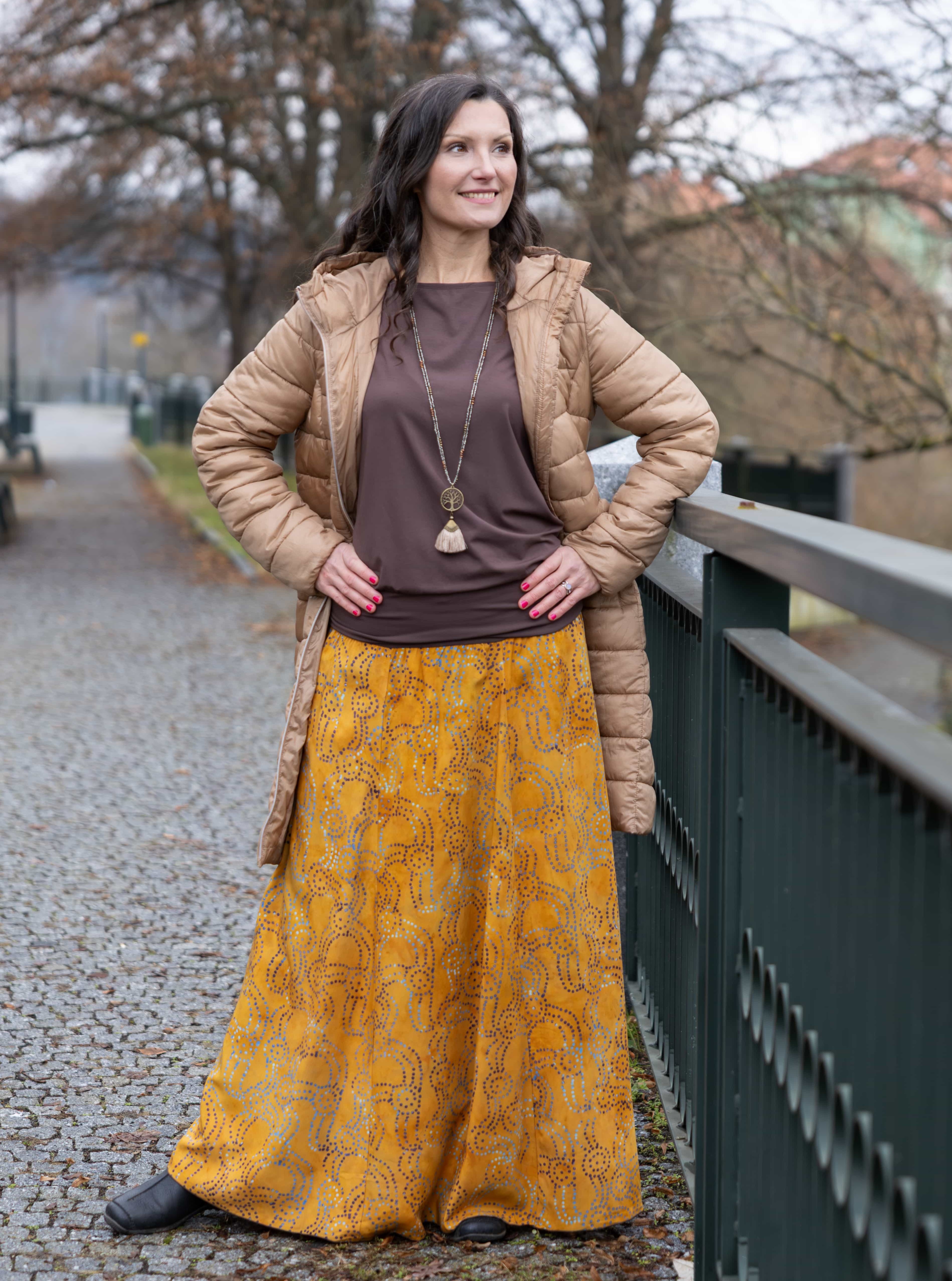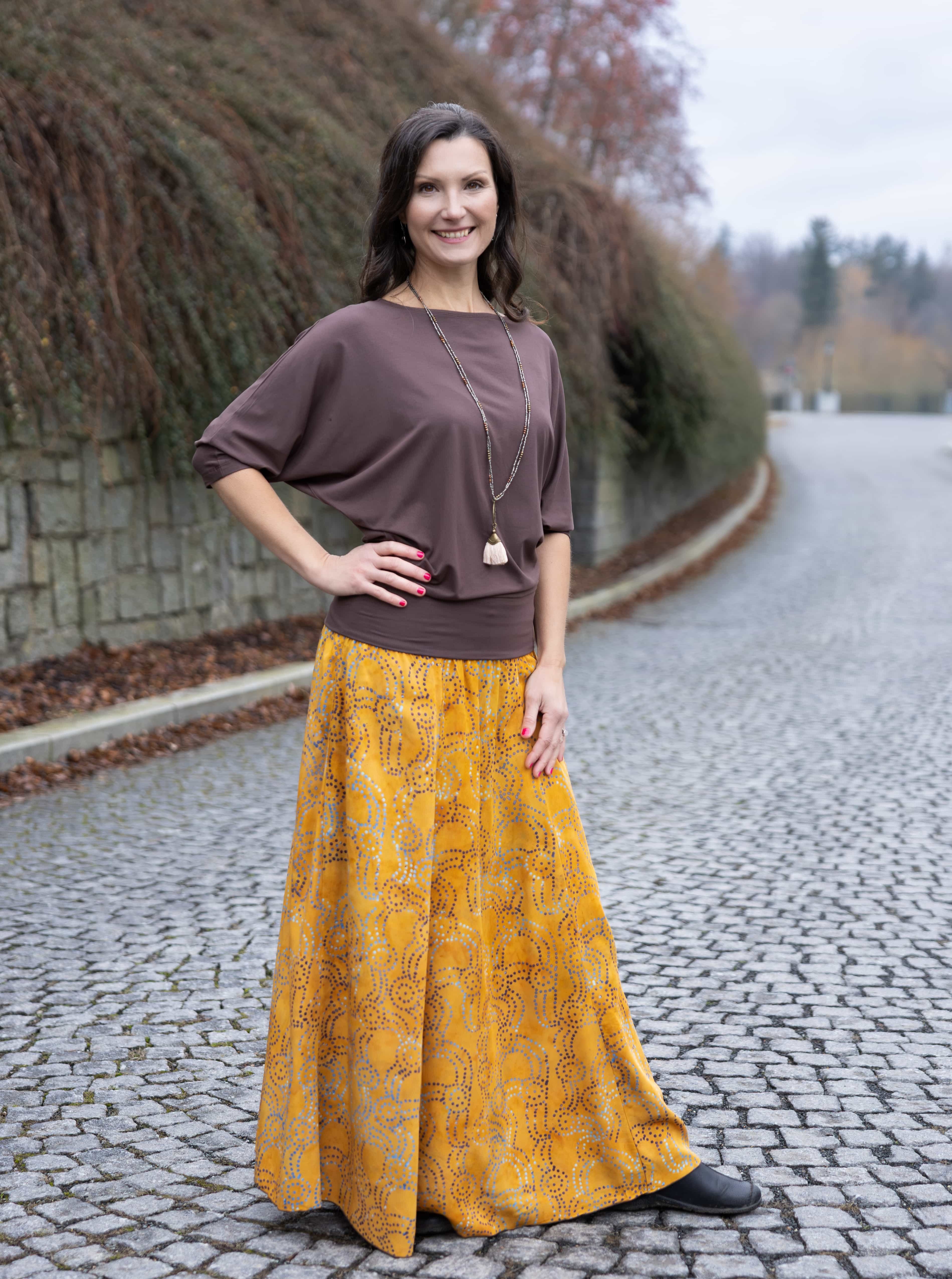 Vysoký elastický pas je nesmírně pohodlný na nošení. Sukně je vhodná i pro těhotné, pružný náplet v pase se krásně přizpůsobí bříšku a obejme ho po celém jeho obvodu. Ikonická Pacha sukně s délkou až na zem se krásně vlní při chůzi a vytváří ženskou siluetu.