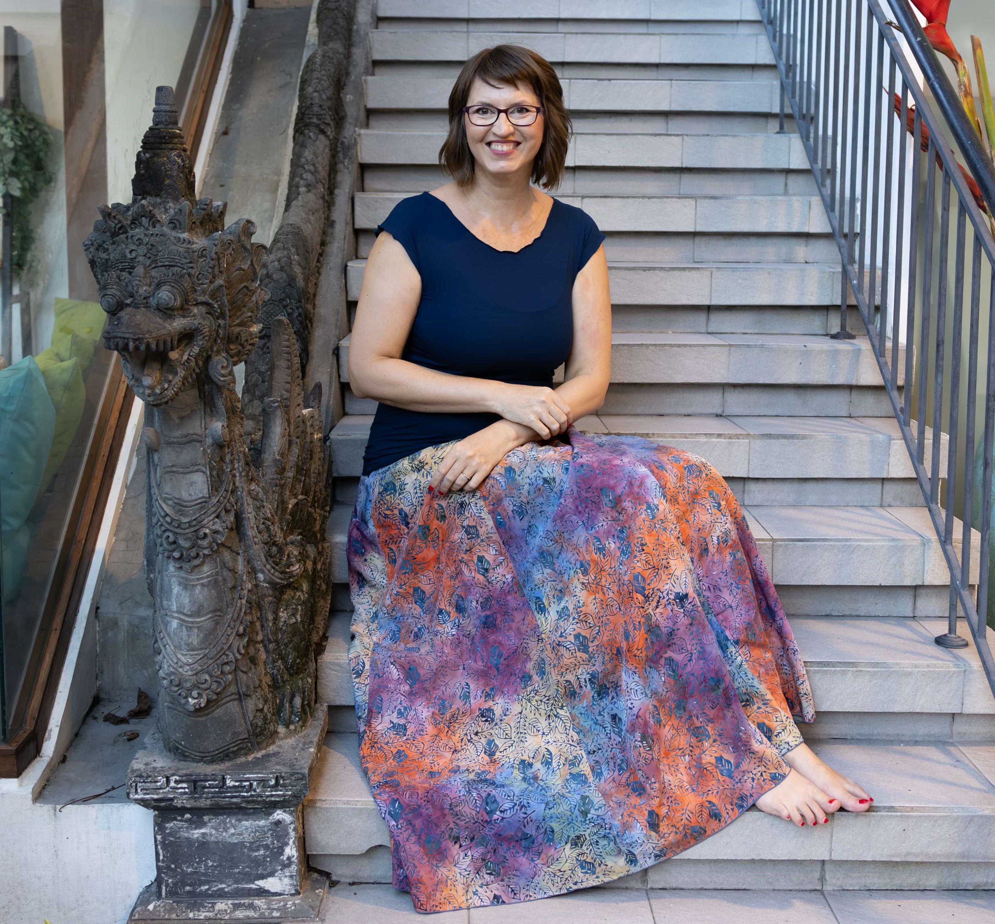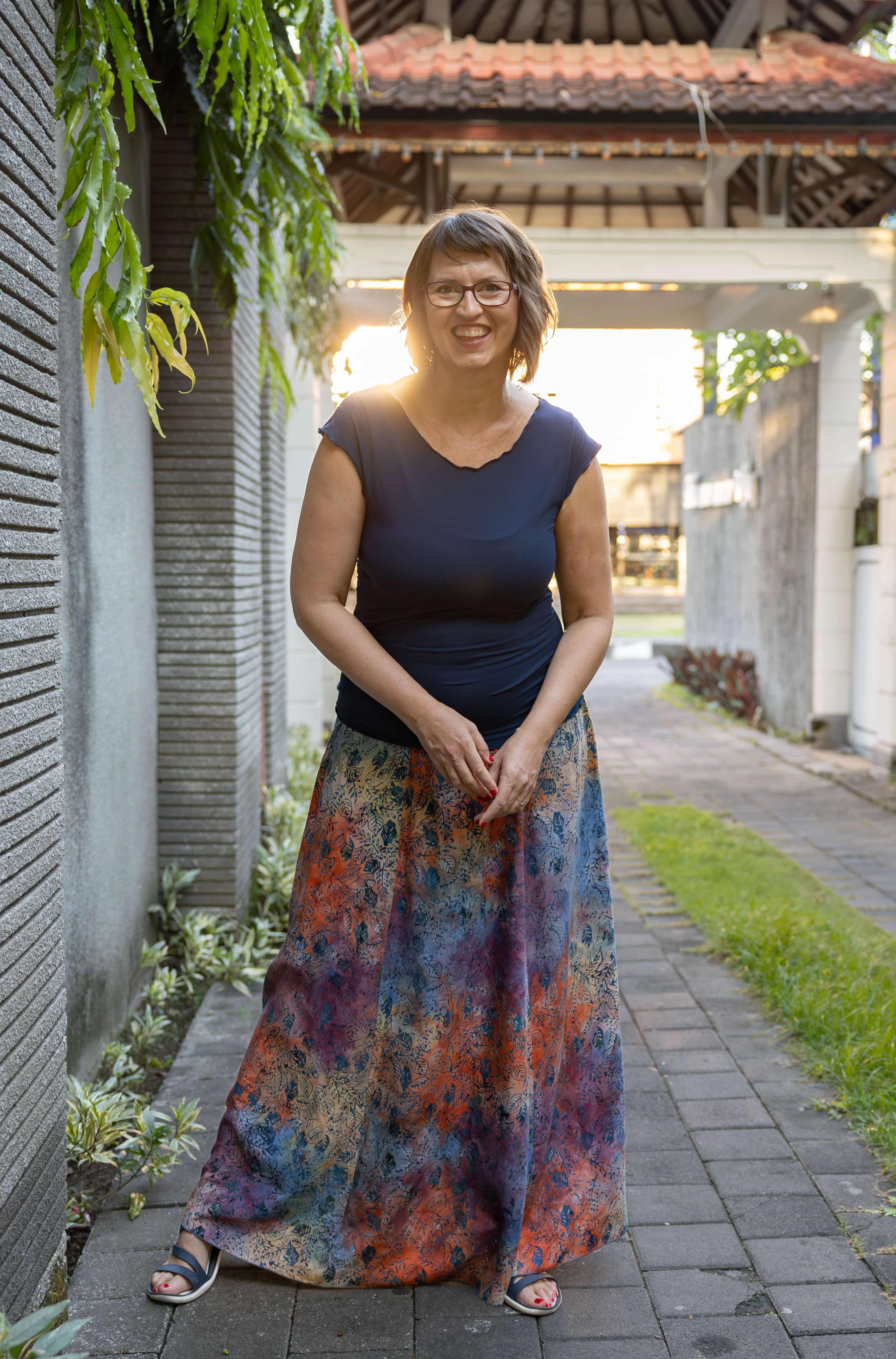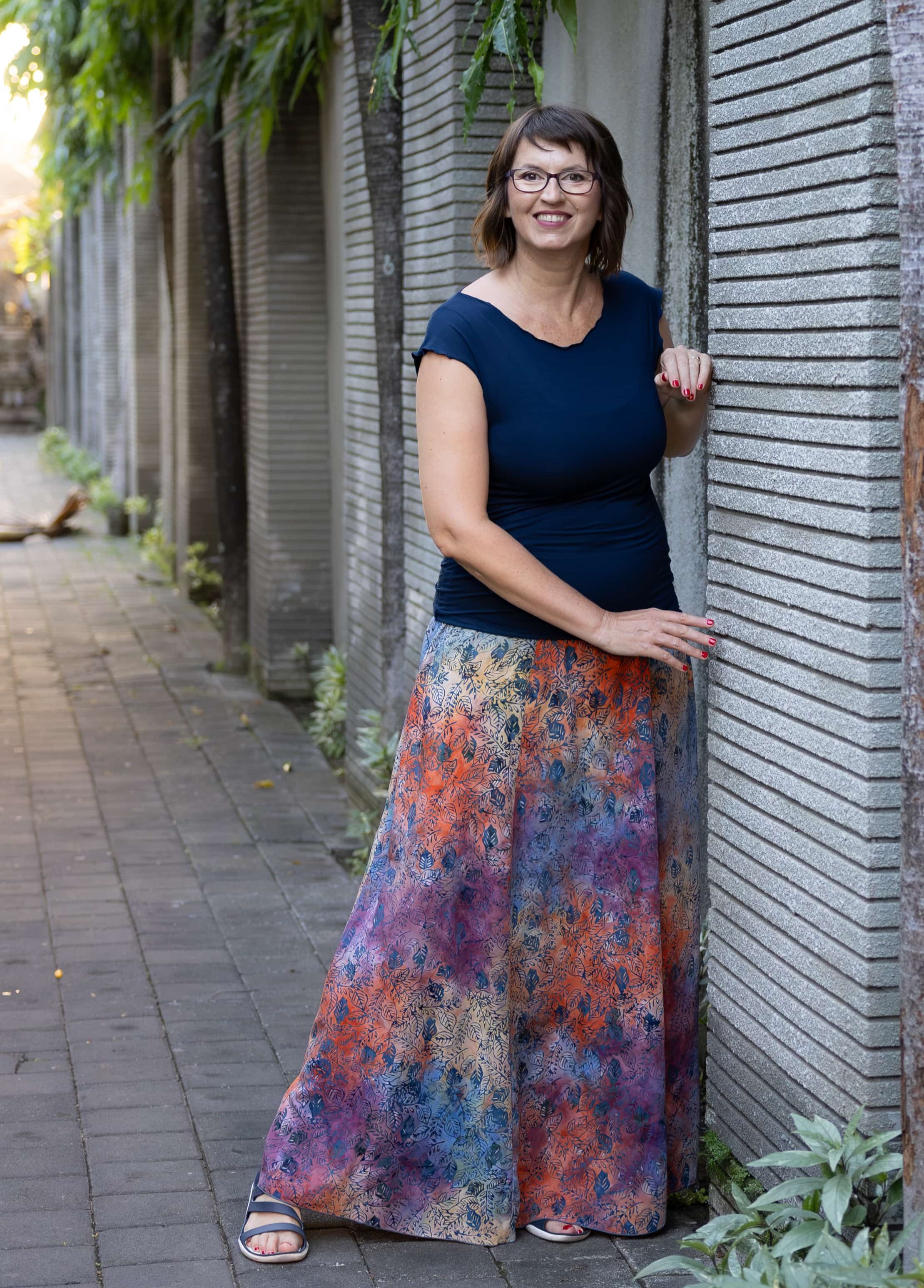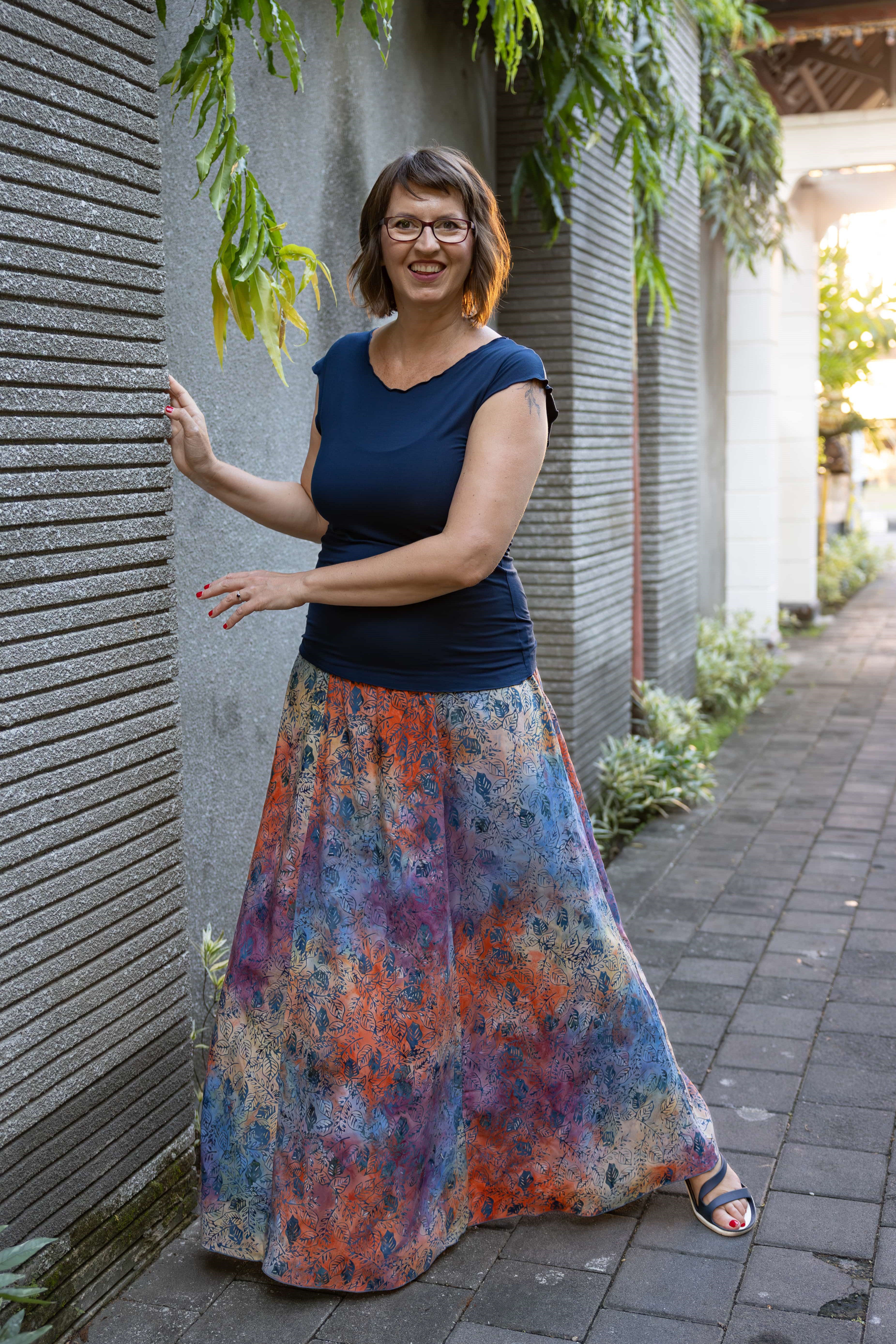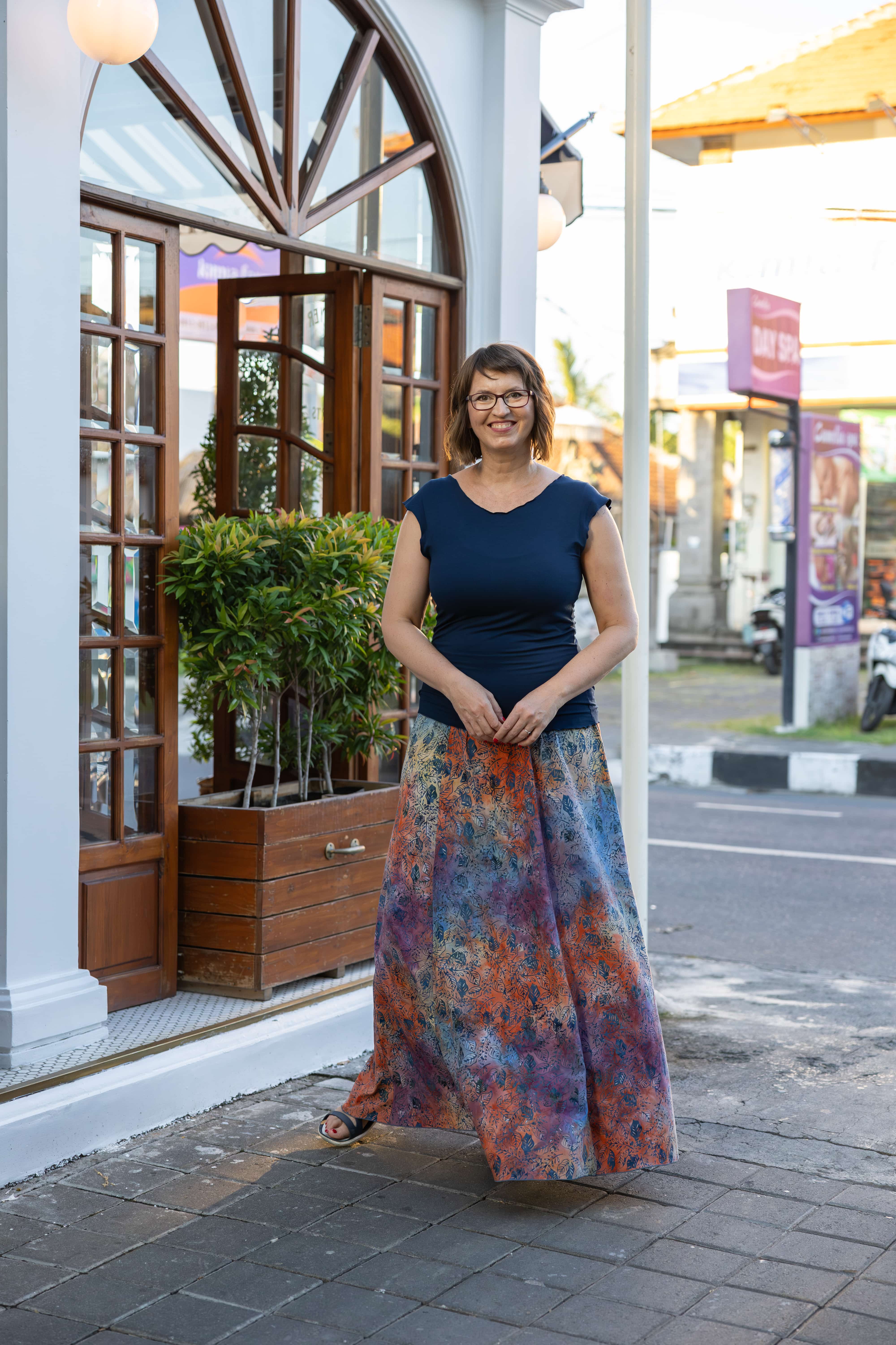 Připravte se na to, že touto úchvatnou, dlouhou sukní přitáhnete pozornost! Sukně je ušitá z lehké viskózové látky a pyšní se nádherným batikovým vzorem.