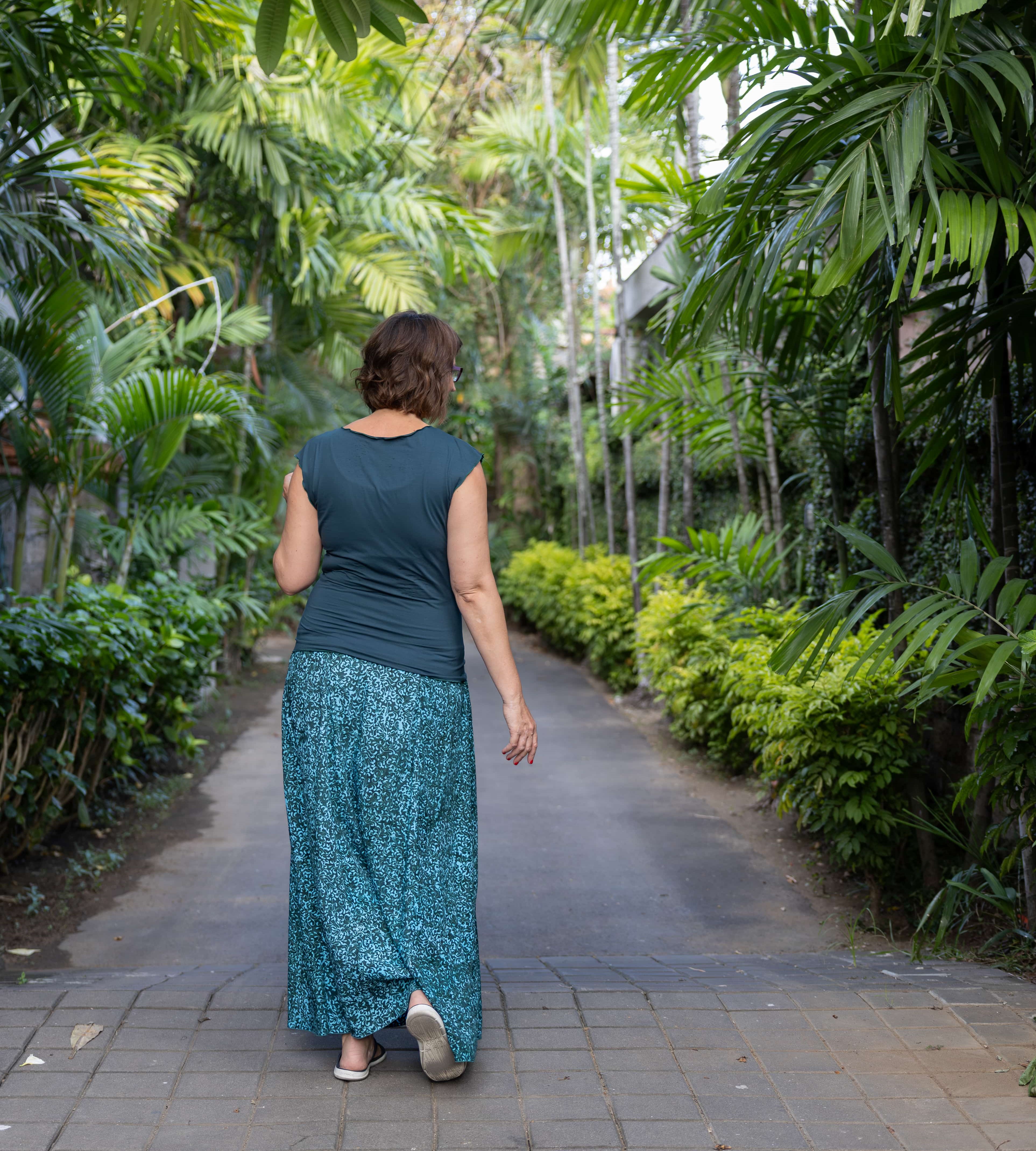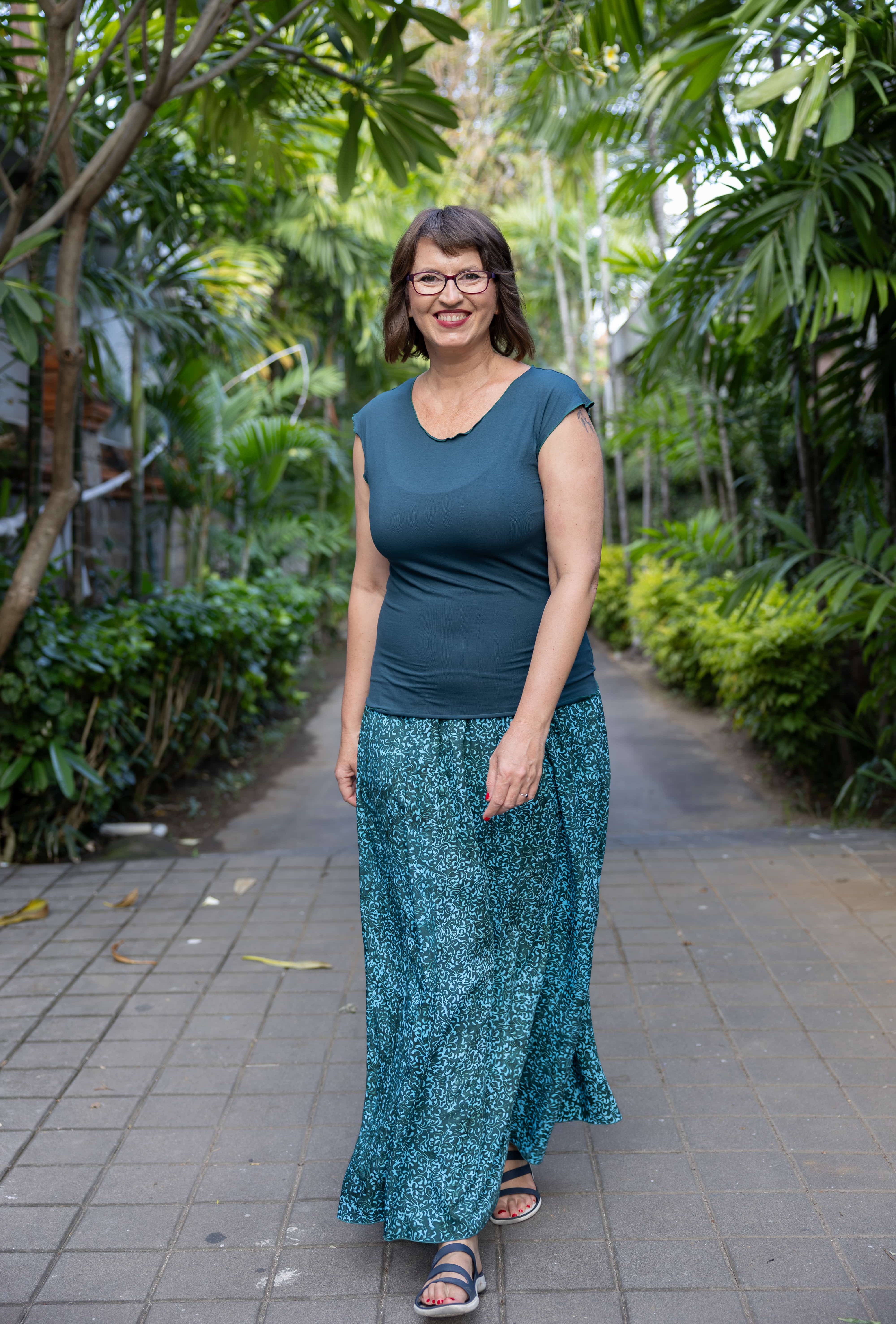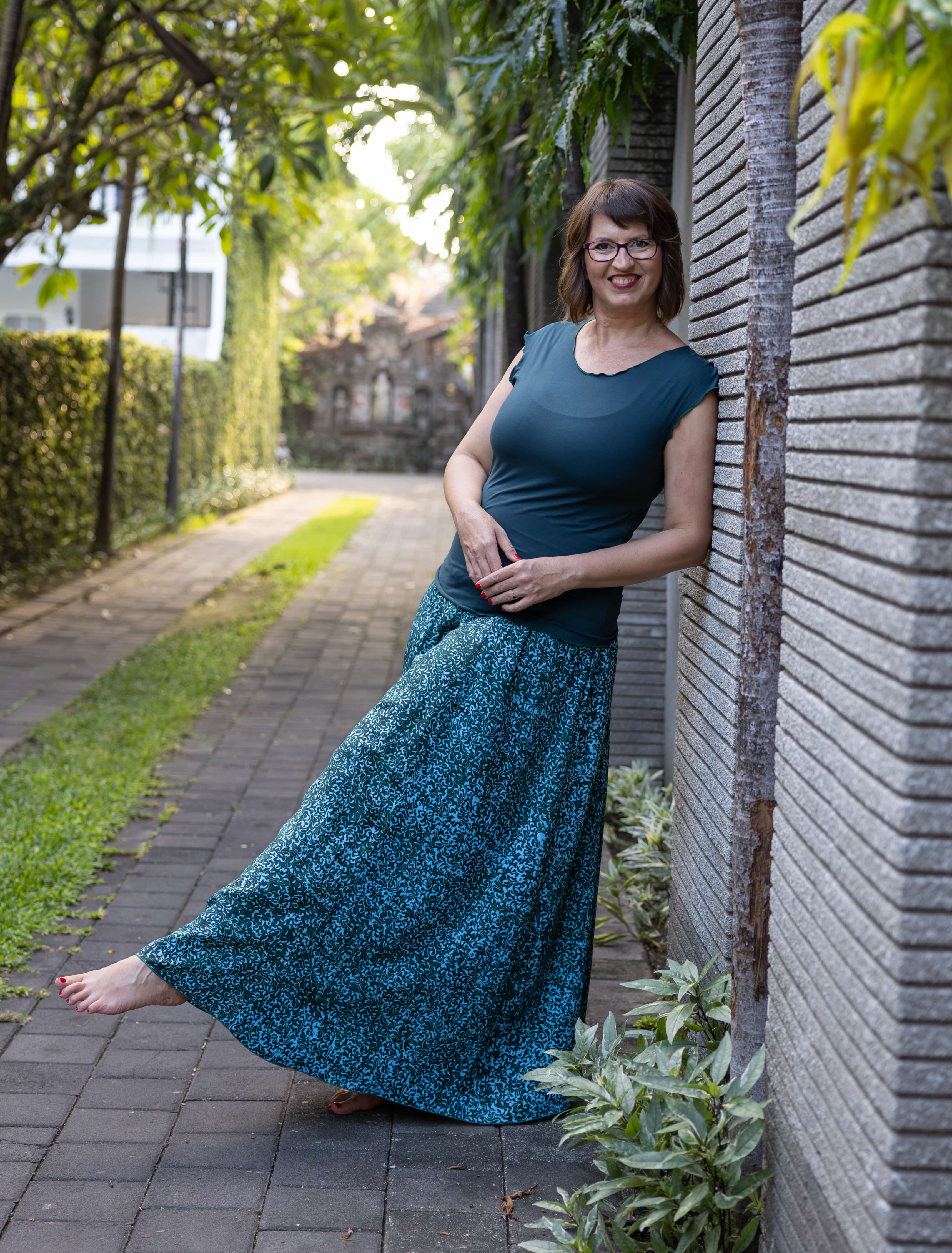 Vysoký elastický pas je nesmírně pohodlný na nošení. Sukně je vhodná i pro těhotné, pružný náplet v pase se krásně přizpůsobí bříšku a obejme ho po celém jeho obvodu. Ikonická Pacha sukně s délkou až na zem se krásně vlní při chůzi a vytváří ženskou siluetu.