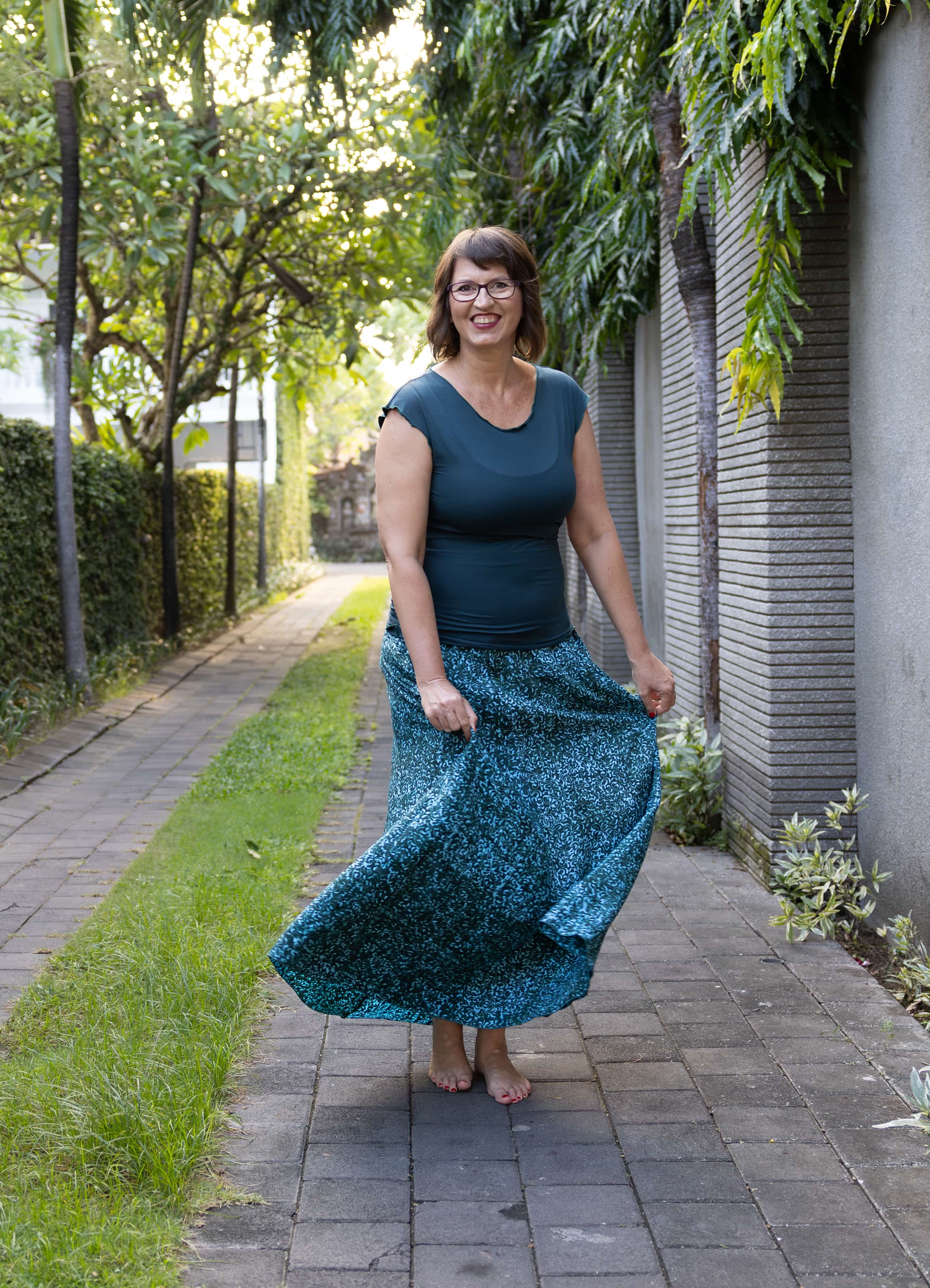 Barva sukně: petrolejová s tyrkysovým vzorem