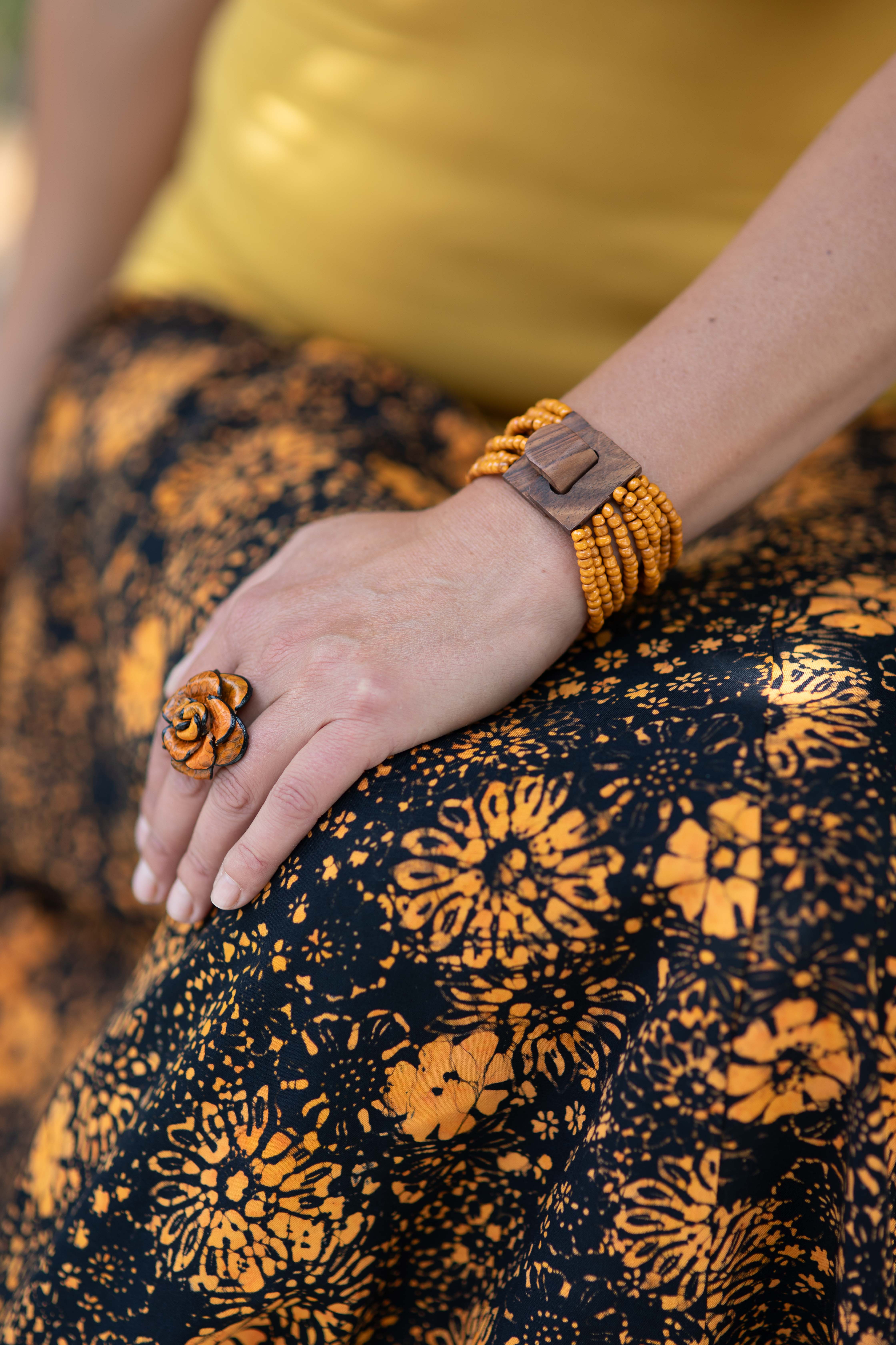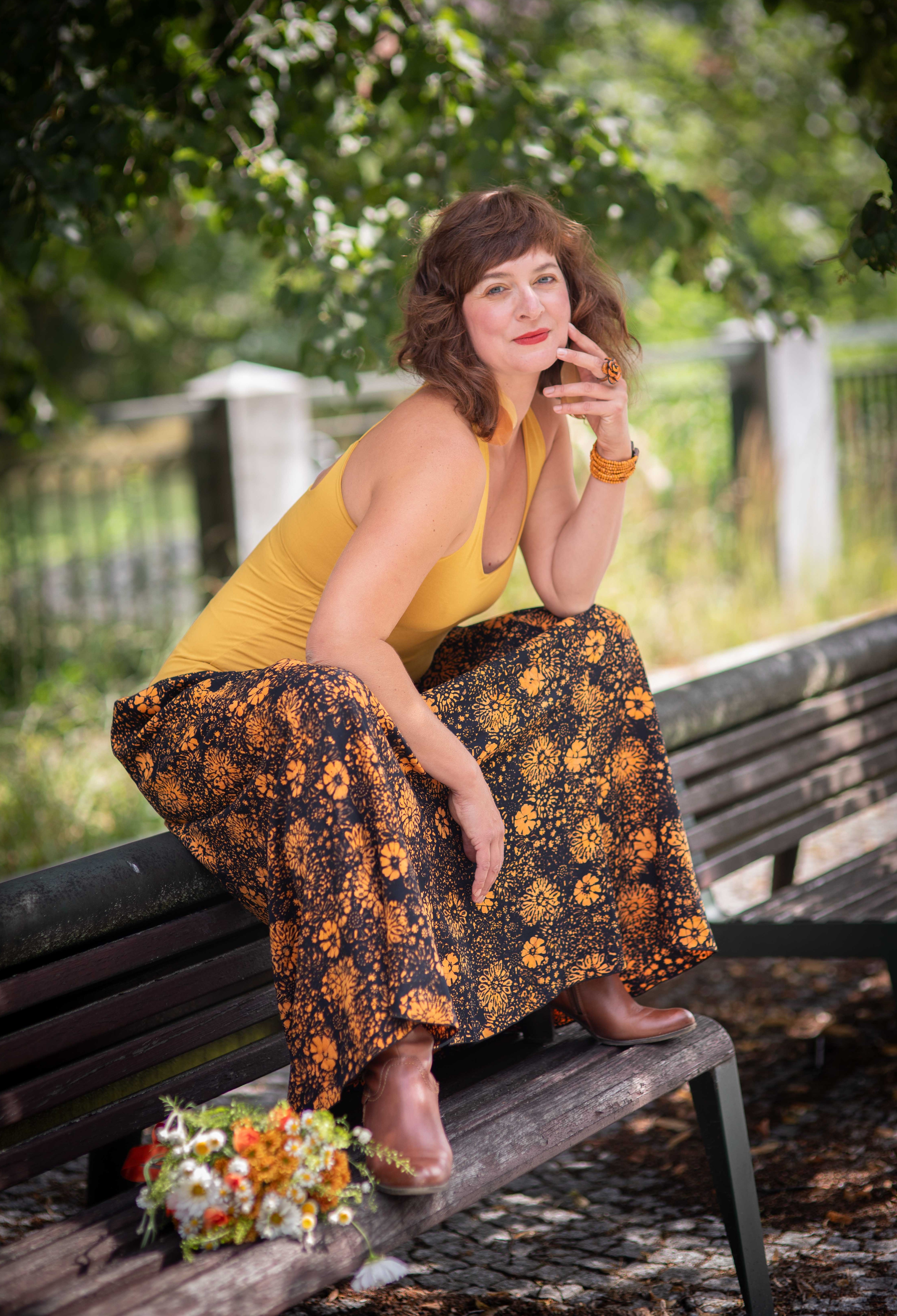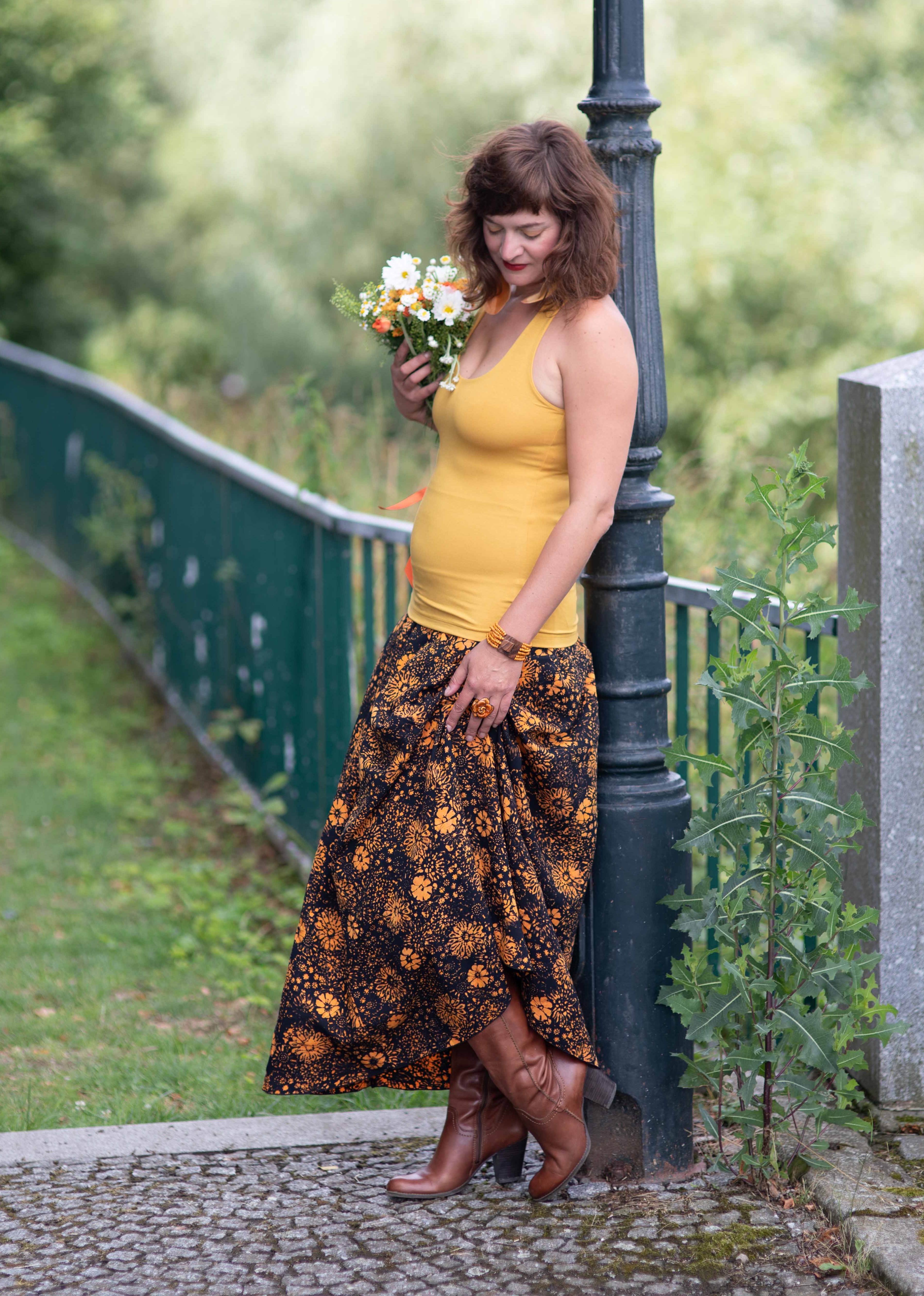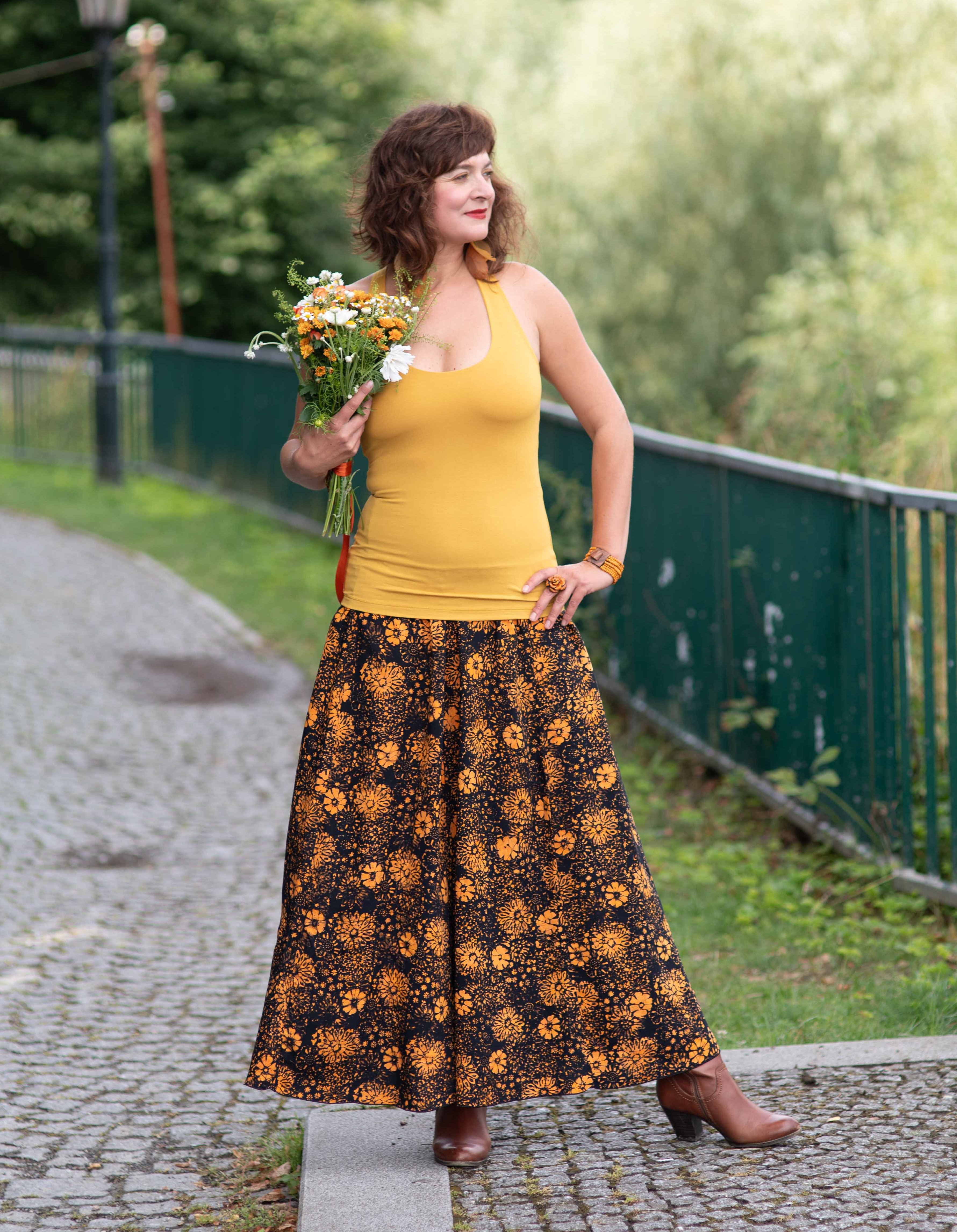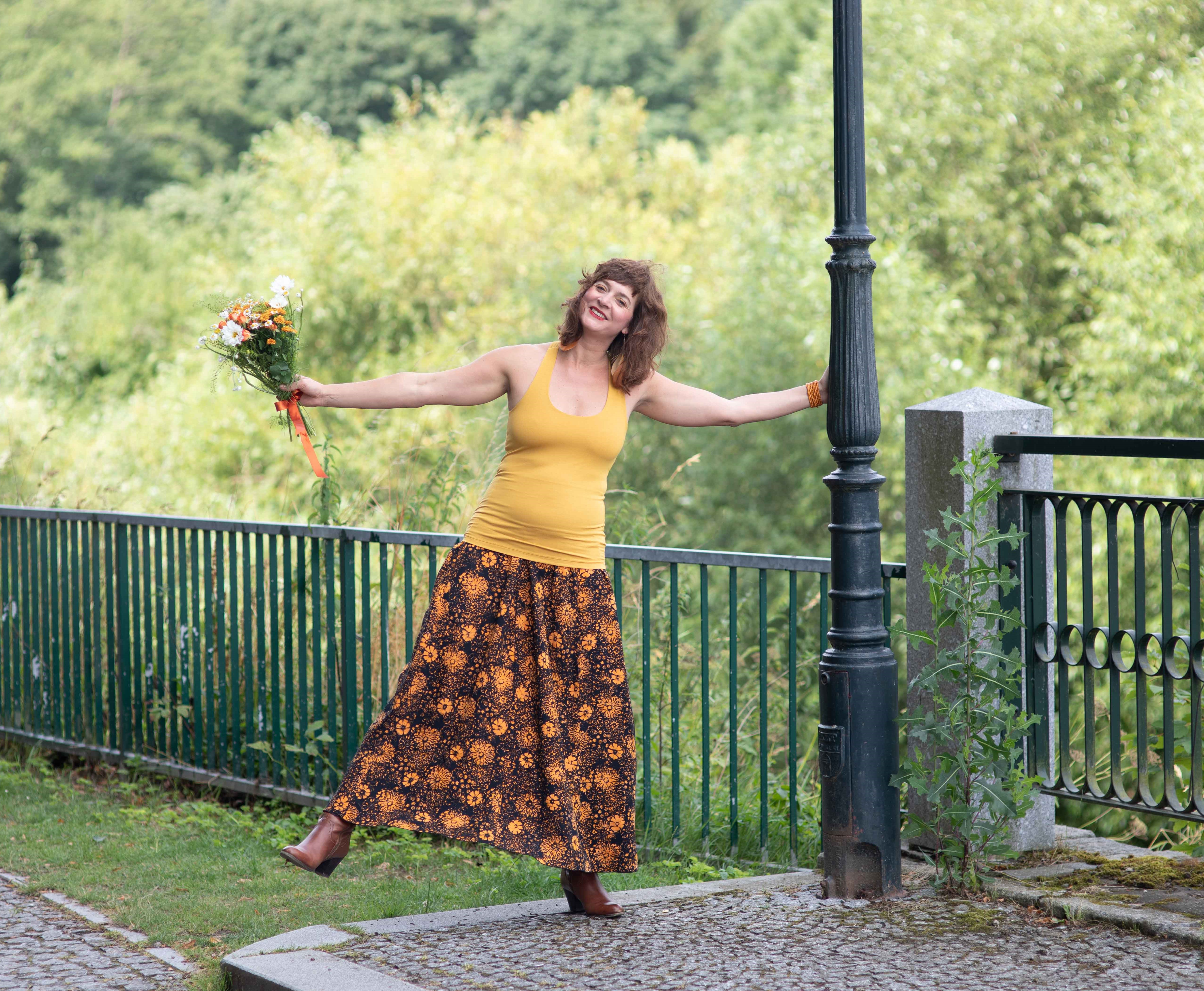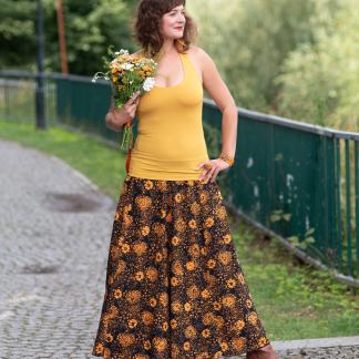 Barva sukně: černá s žlutooranžovým vzorem květin