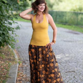 Vysoký elastický pas je nesmírně pohodlný na nošení. Sukně je vhodná i pro těhotné, pružný náplet v pase se krásně přizpůsobí bříšku a obejme ho po celém jeho obvodu. Ikonická Pacha sukně s délkou až na zem se krásně vlní při chůzi a vytváří ženskou siluetu.