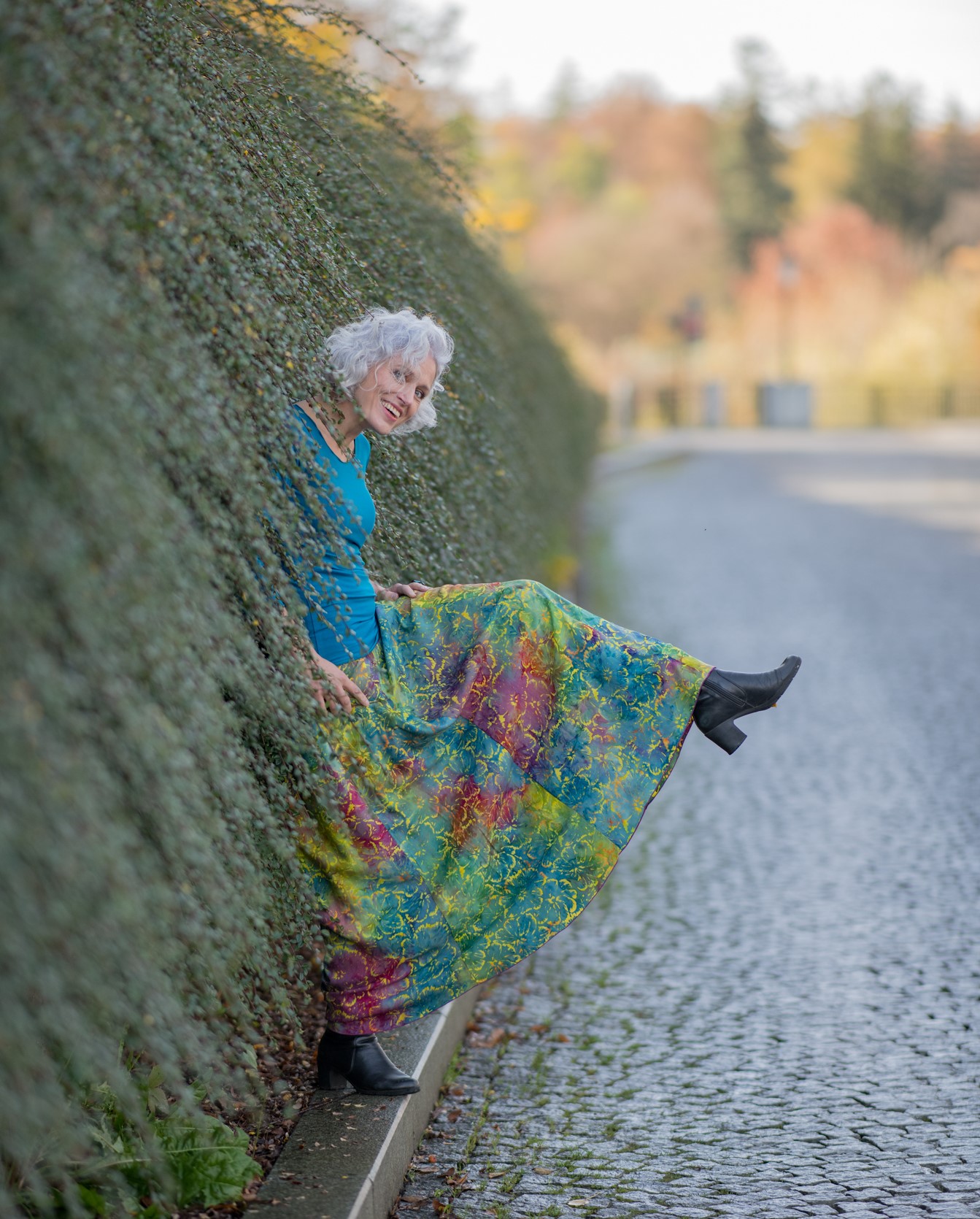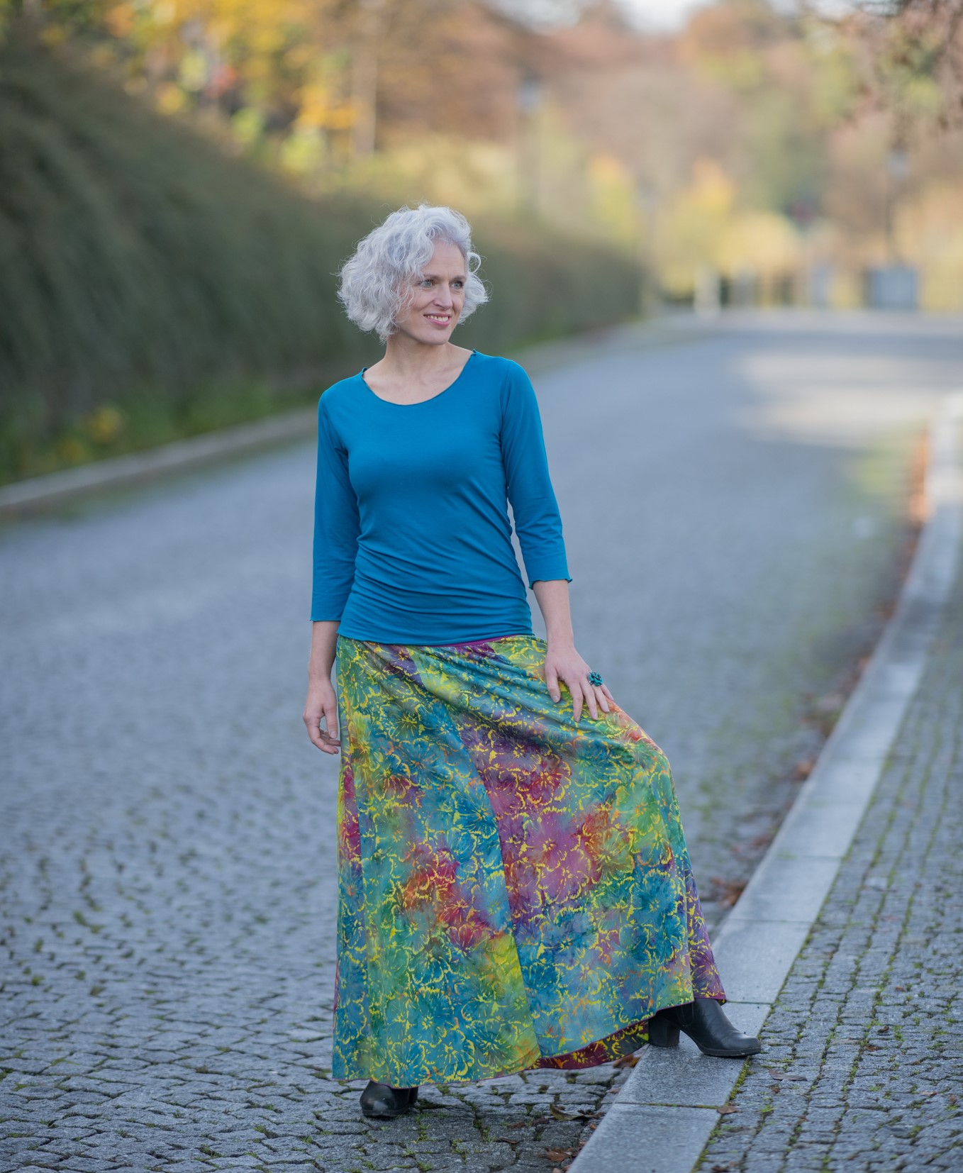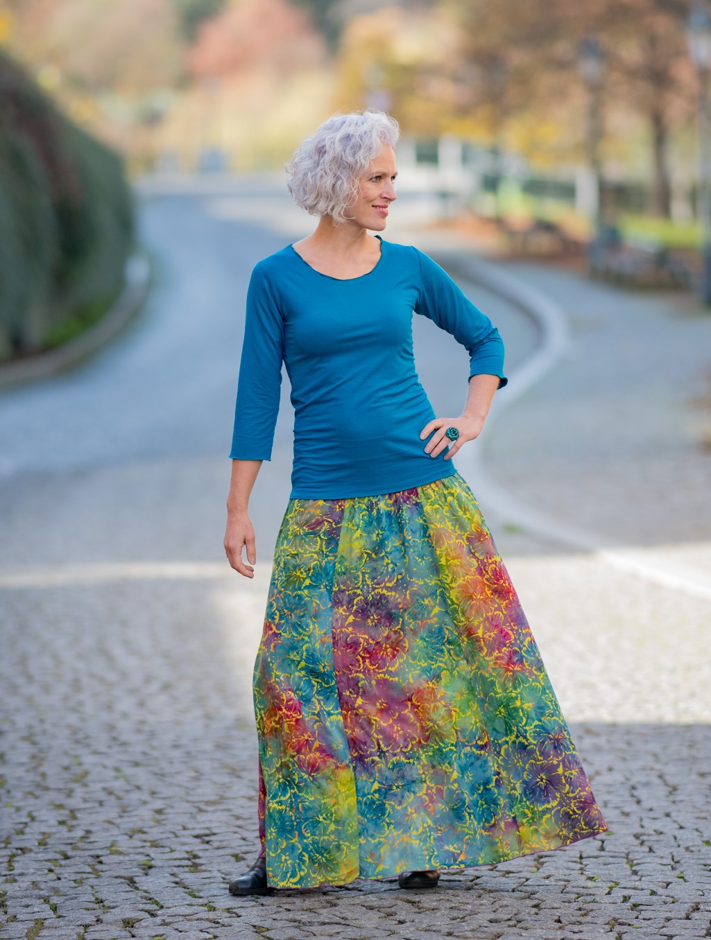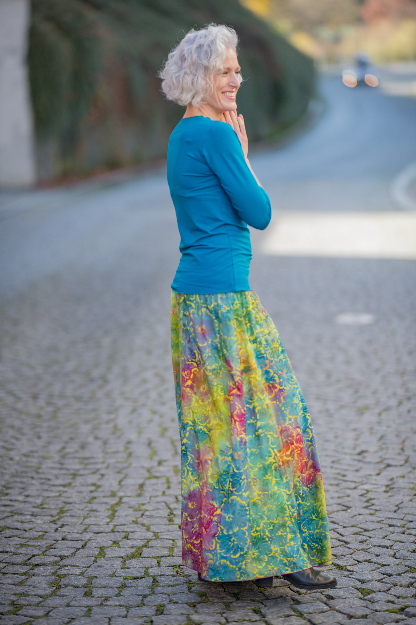Připravte se na to, že touto úchvatnou, dlouhou sukní přitáhnete pozornost! Sukně je ušitá z lehké viskózové látky a pyšní se nádherným batikovým vzorem.