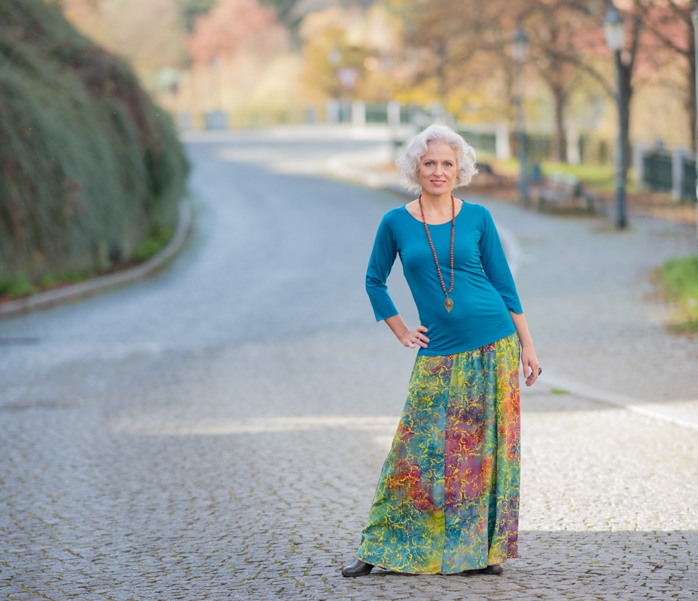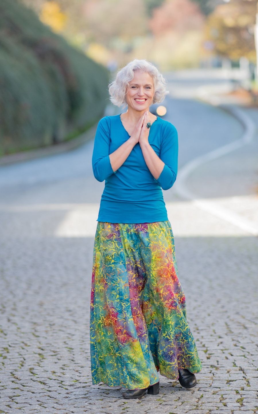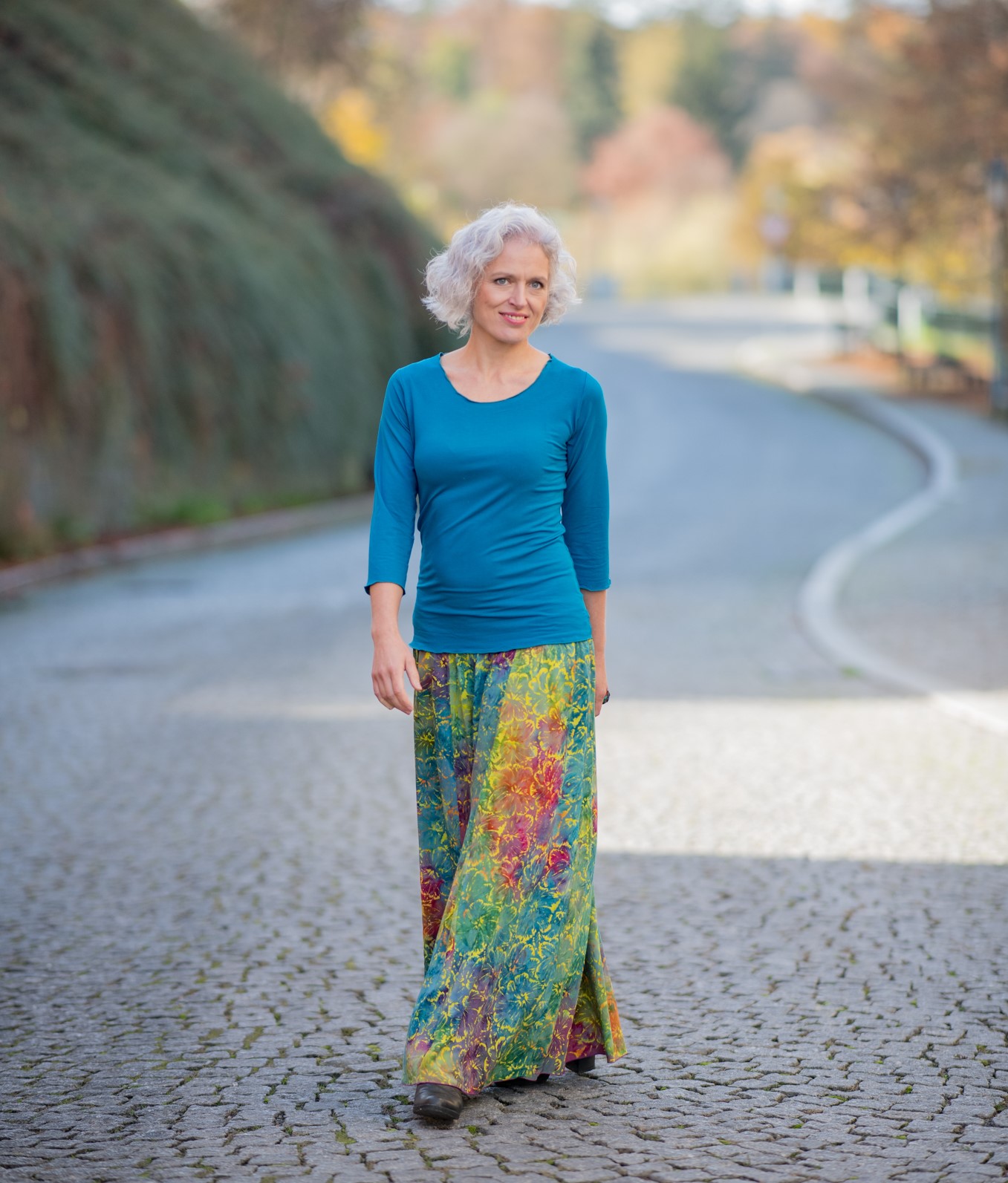 Vysoký elastický pas je nesmírně pohodlný na nošení. Sukně je vhodná i pro těhotné, pružný náplet v pase se krásně přizpůsobí bříšku a obejme ho po celém jeho obvodu. Ikonická Pacha sukně s délkou až na zem se krásně vlní při chůzi a vytváří ženskou siluetu.