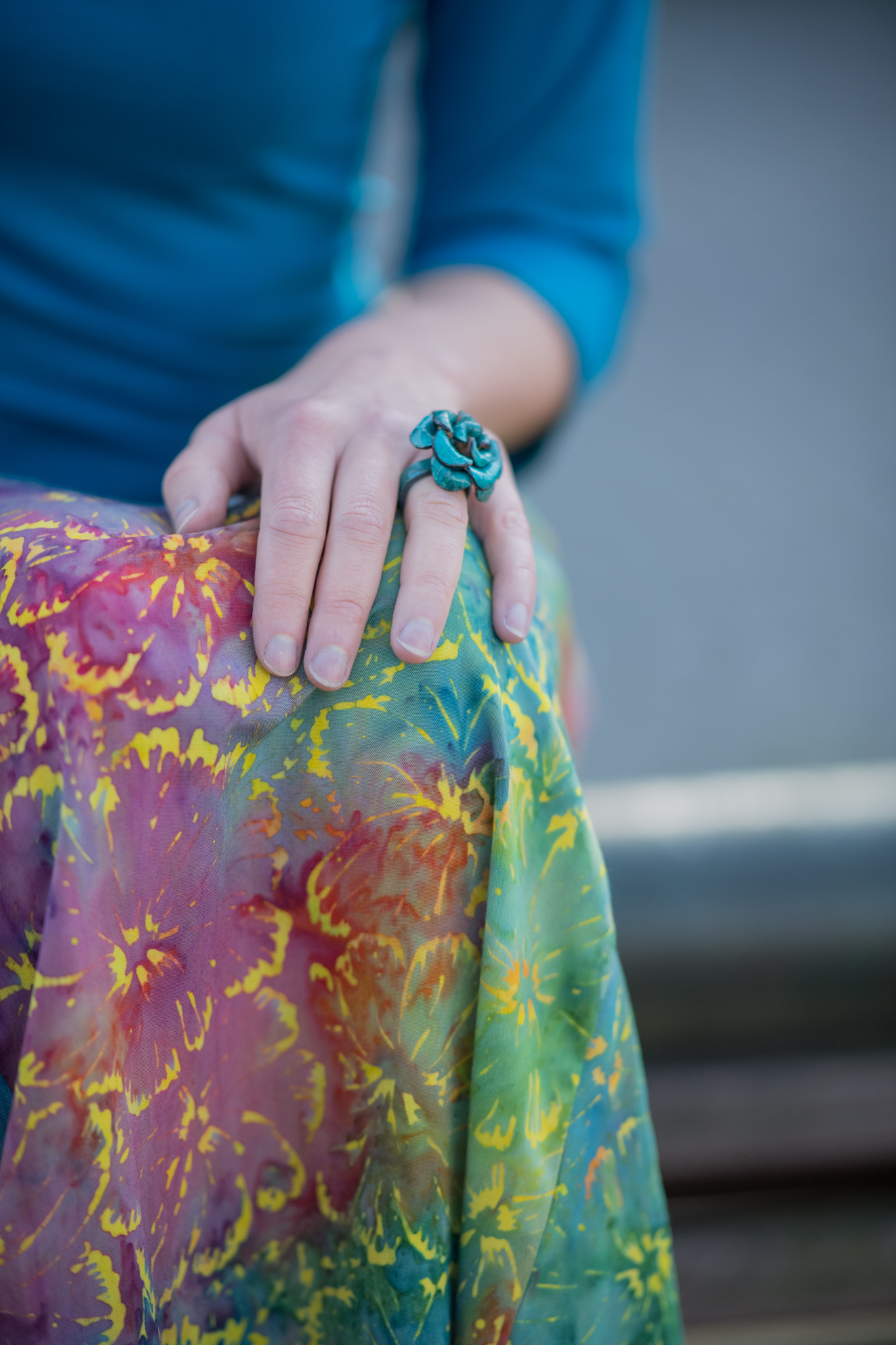 Barva sukně: světle zelená, petrolejová, oranžová, malinová s velkými žlutými květy.